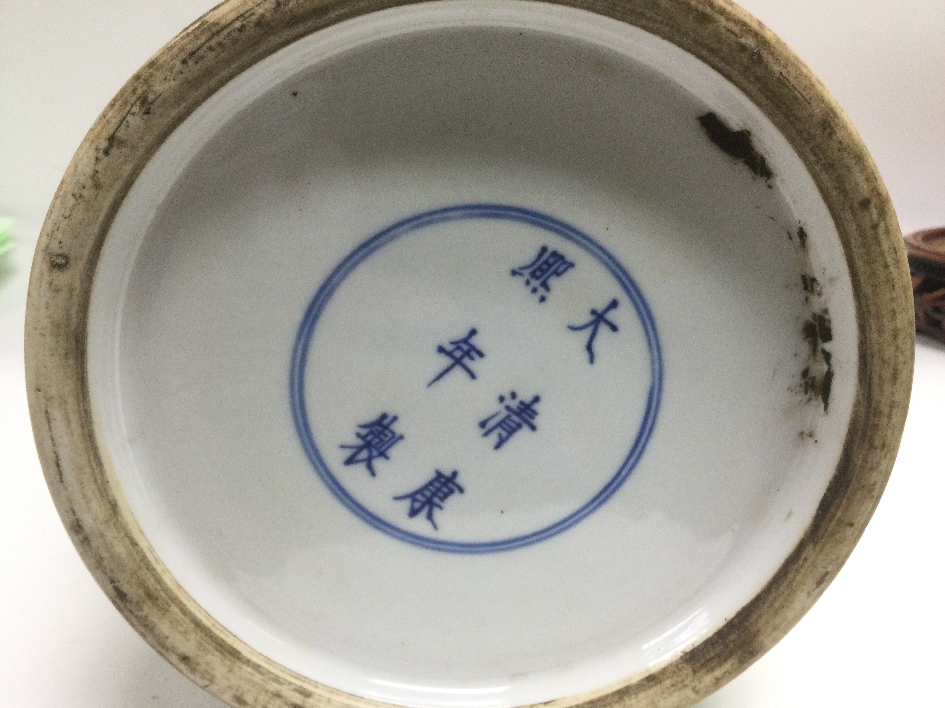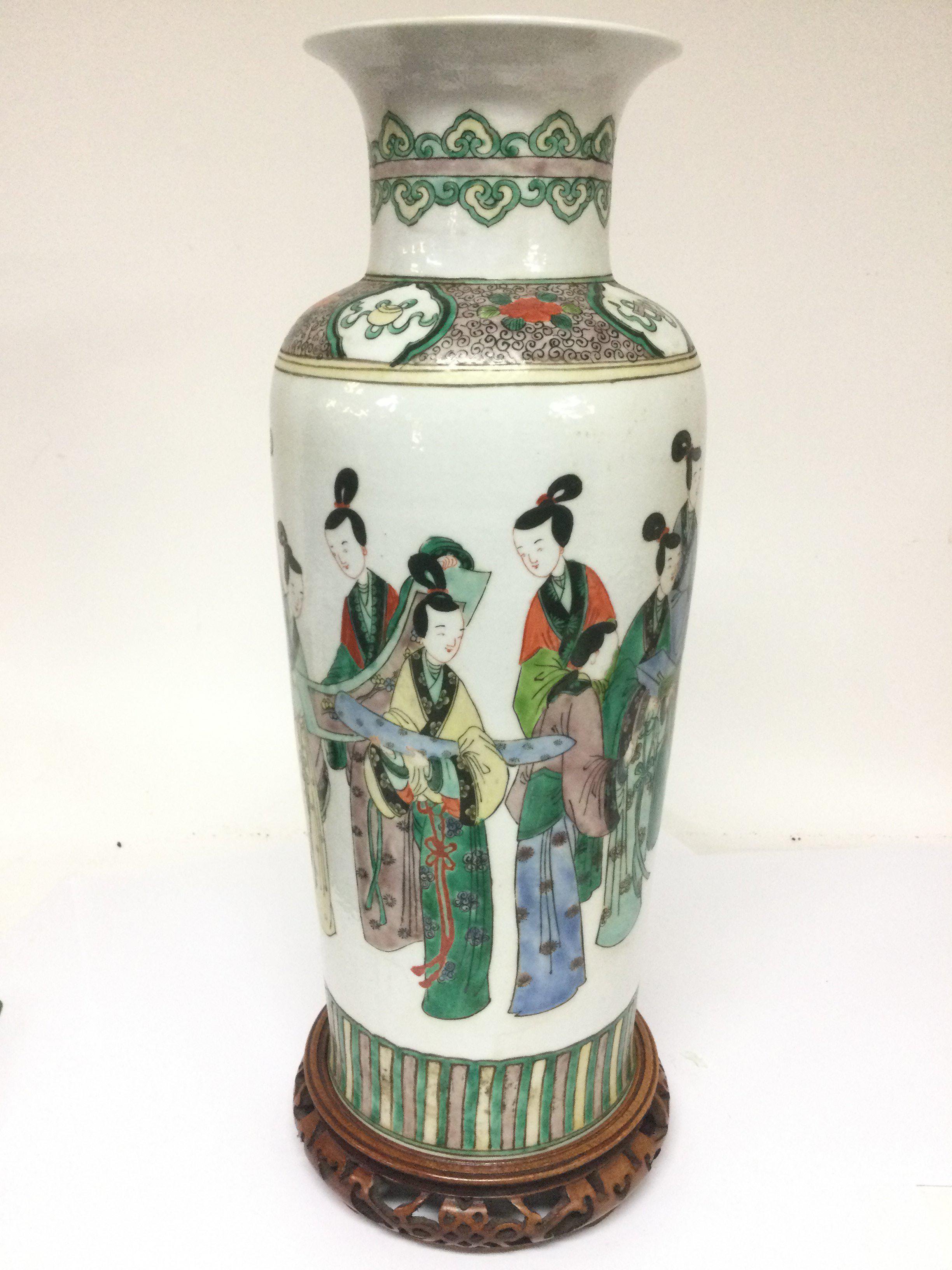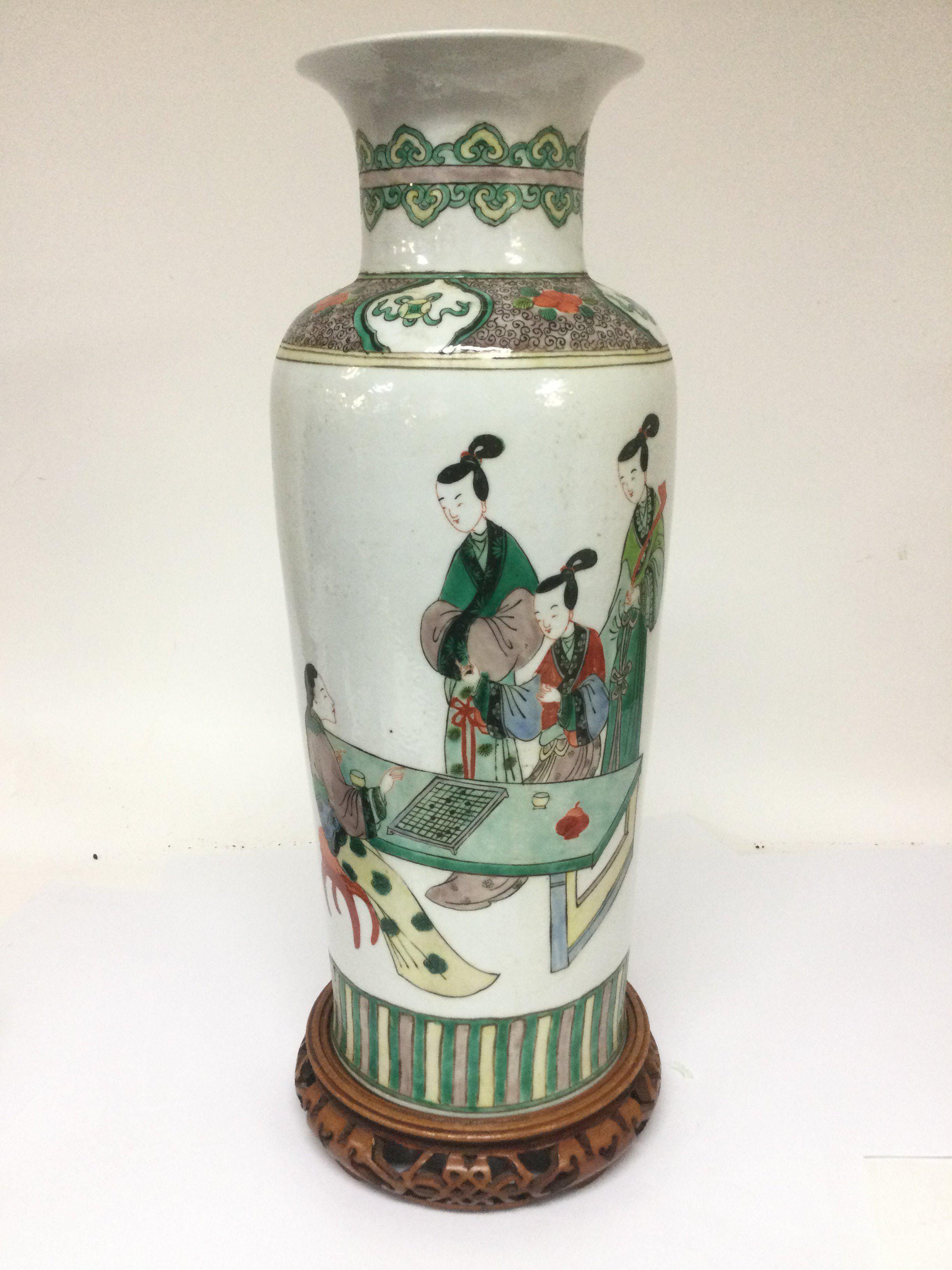 A large Famille vert vase depicting figures in an interior setting and raised on a carved hardwood base, approx height of vase 46cm. Shipping category D.