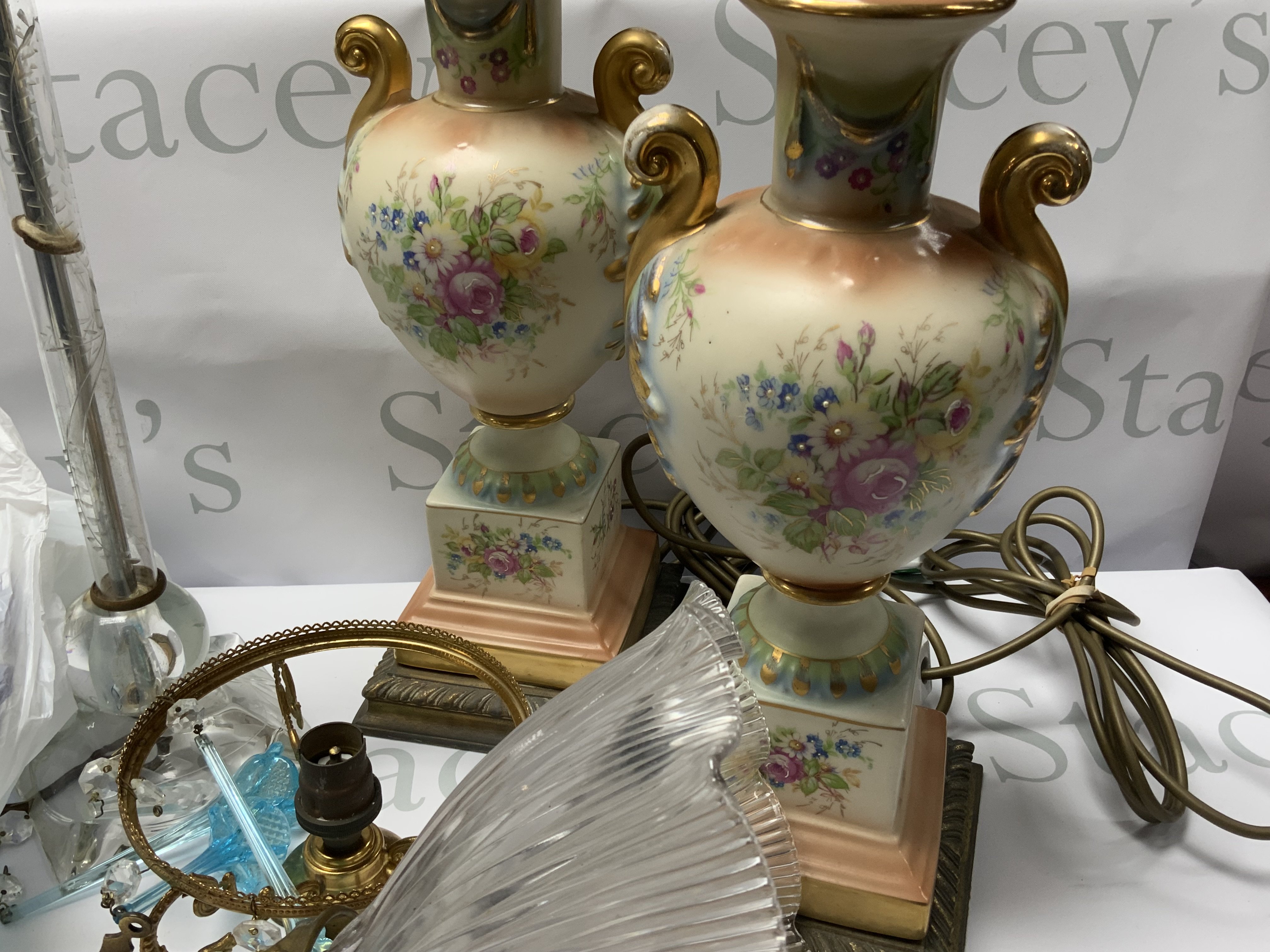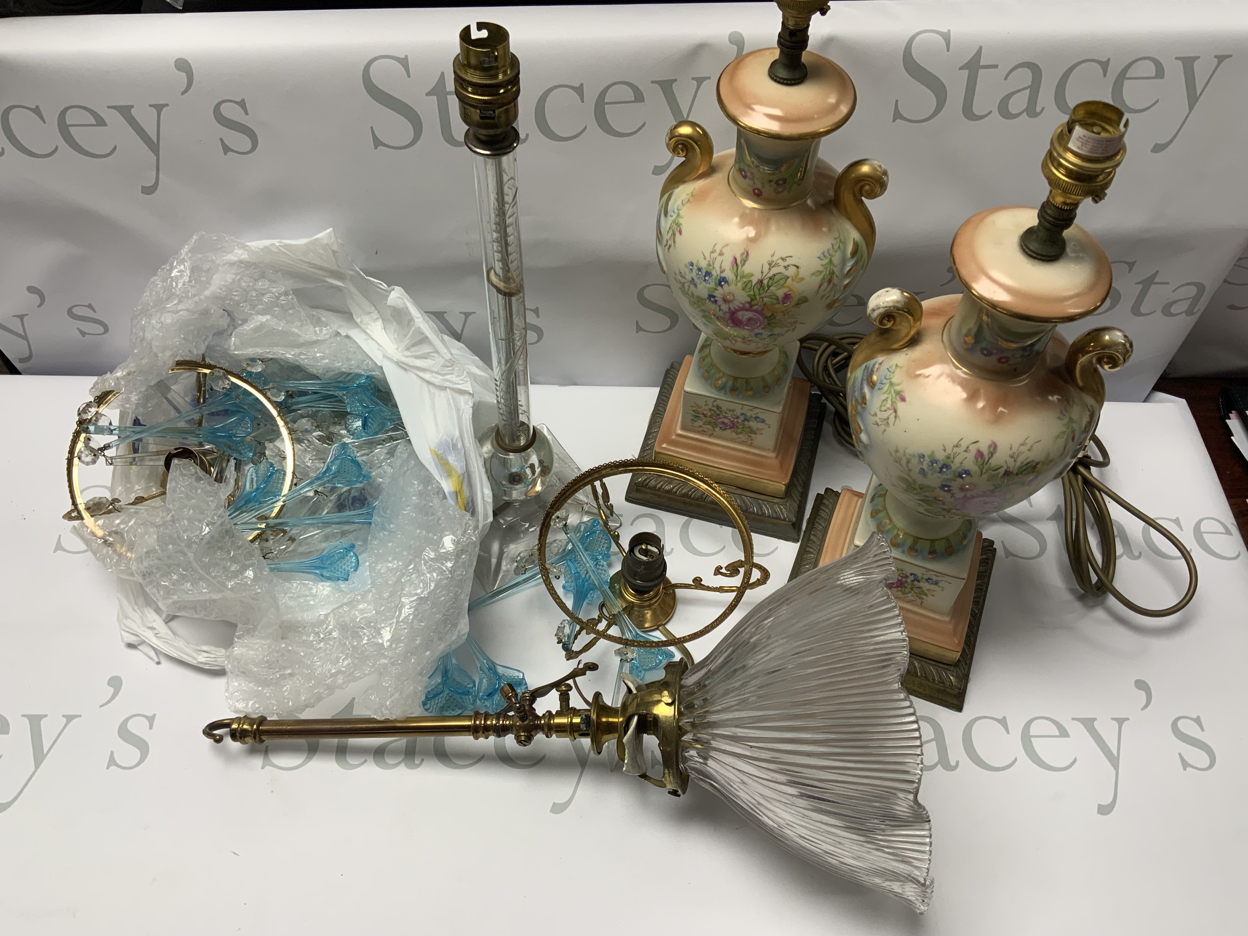 A collection of antique lamps and light fittings with modern electrical fittings. (D)