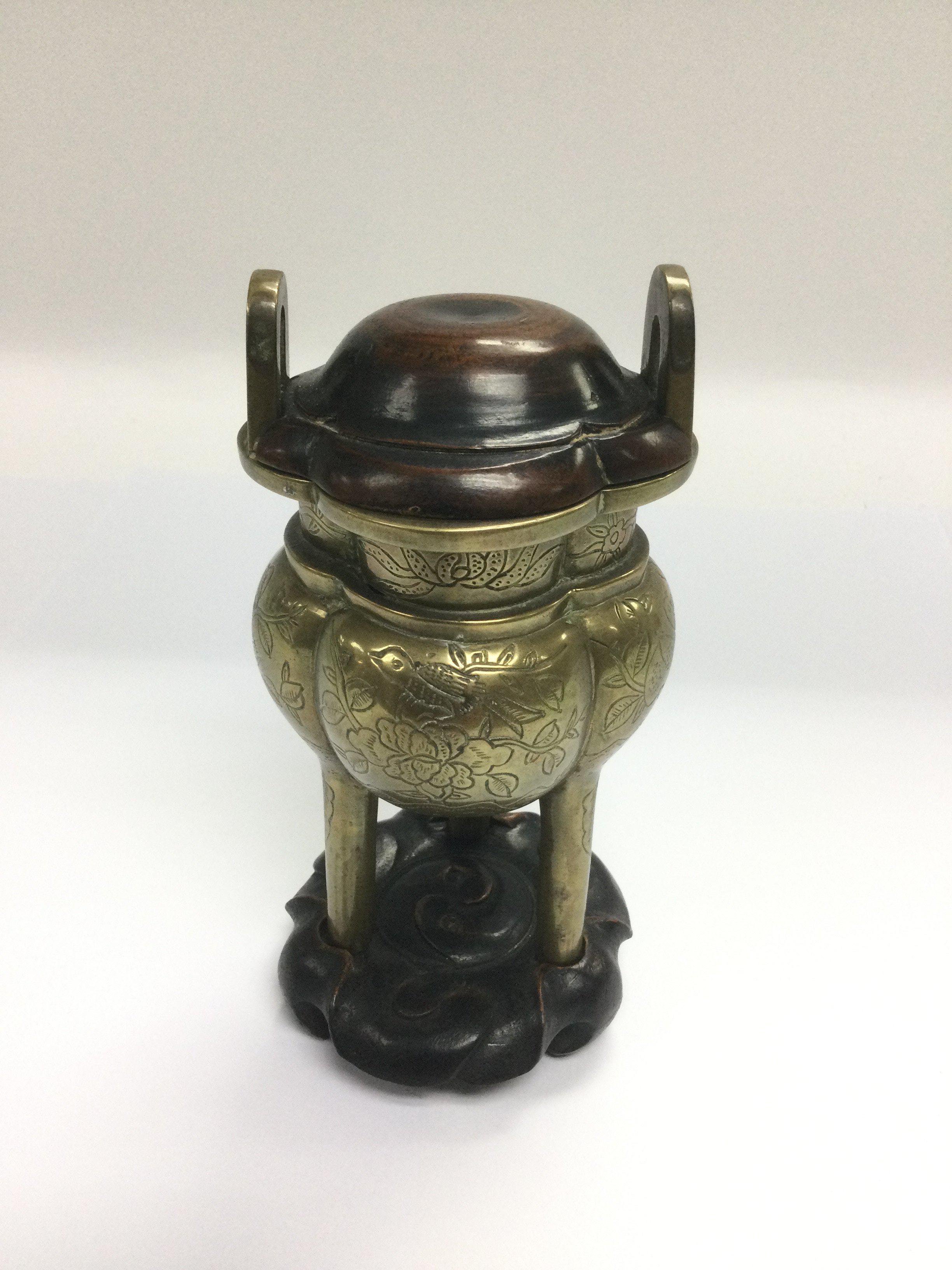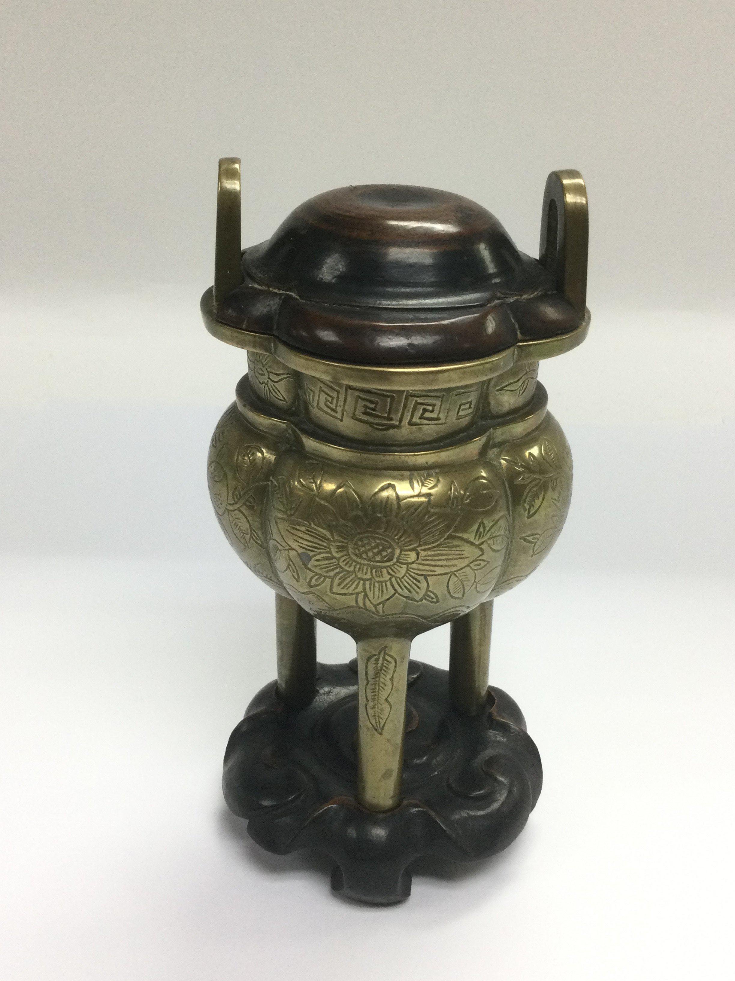 A bronzed censor with a carved hardwood lid and stand, total height approx 14cm. Shipping category B.