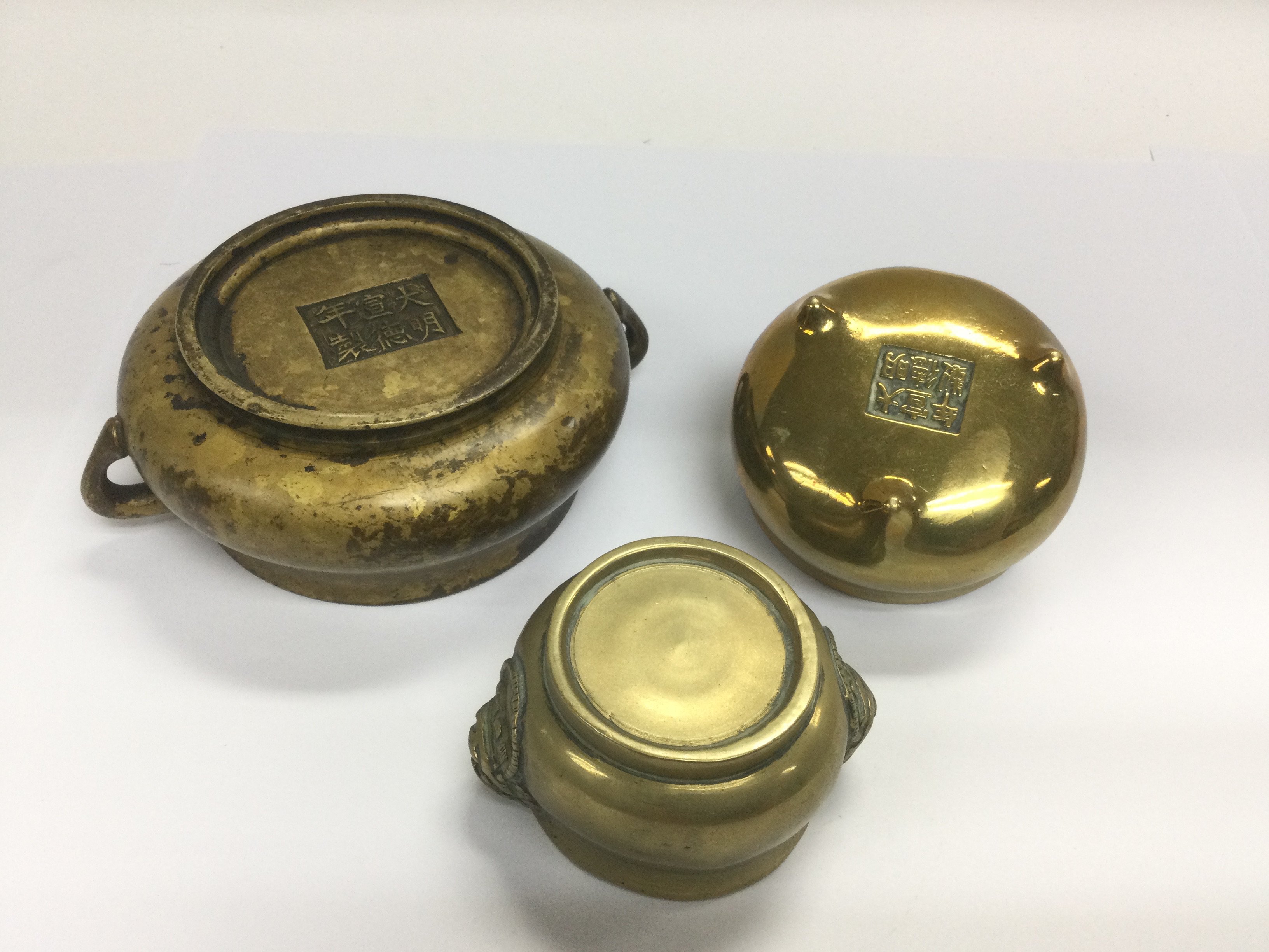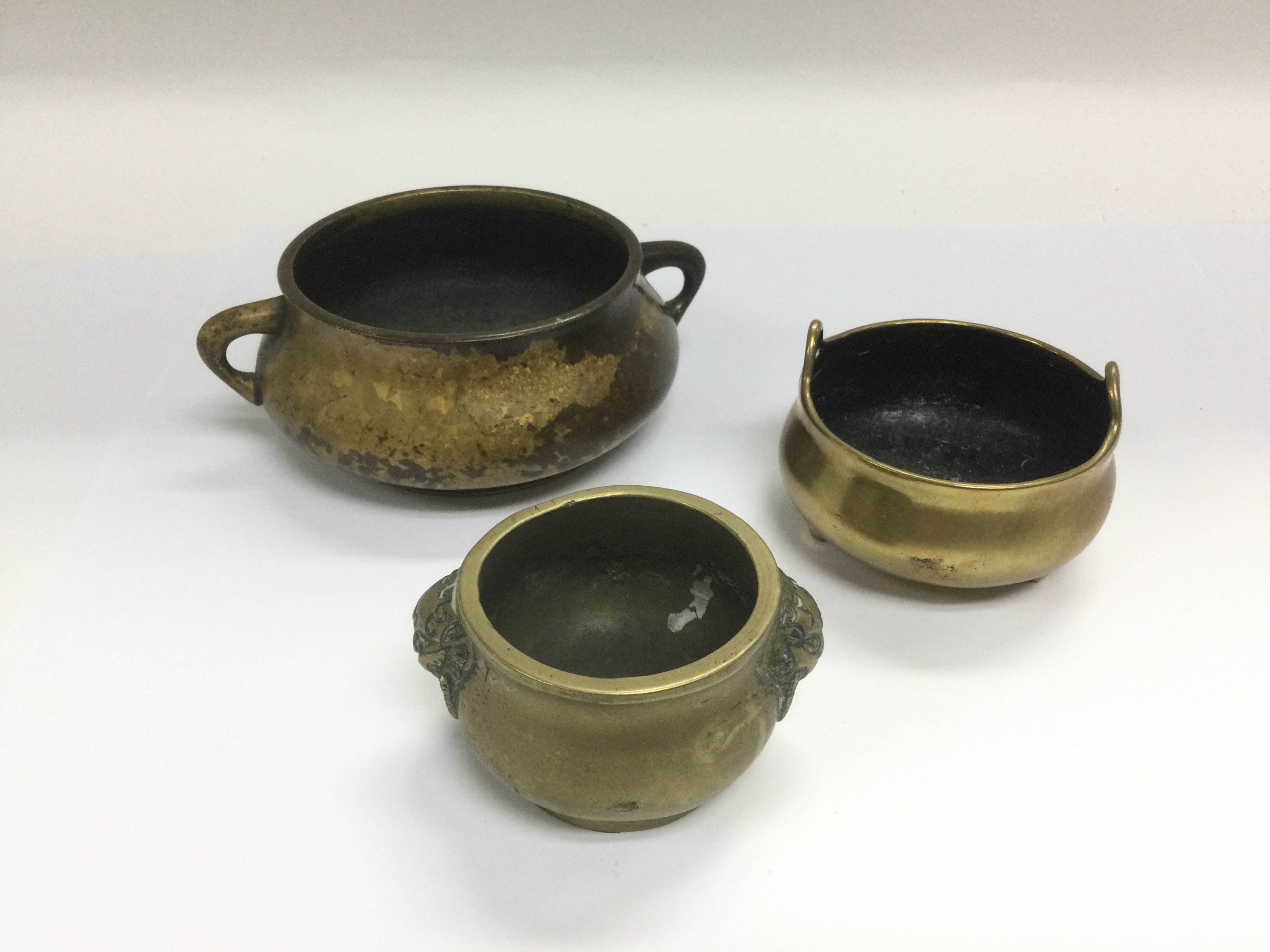 Three bronze censors of squat circular form, the largest diameter approx 10cm. Shipping category B.