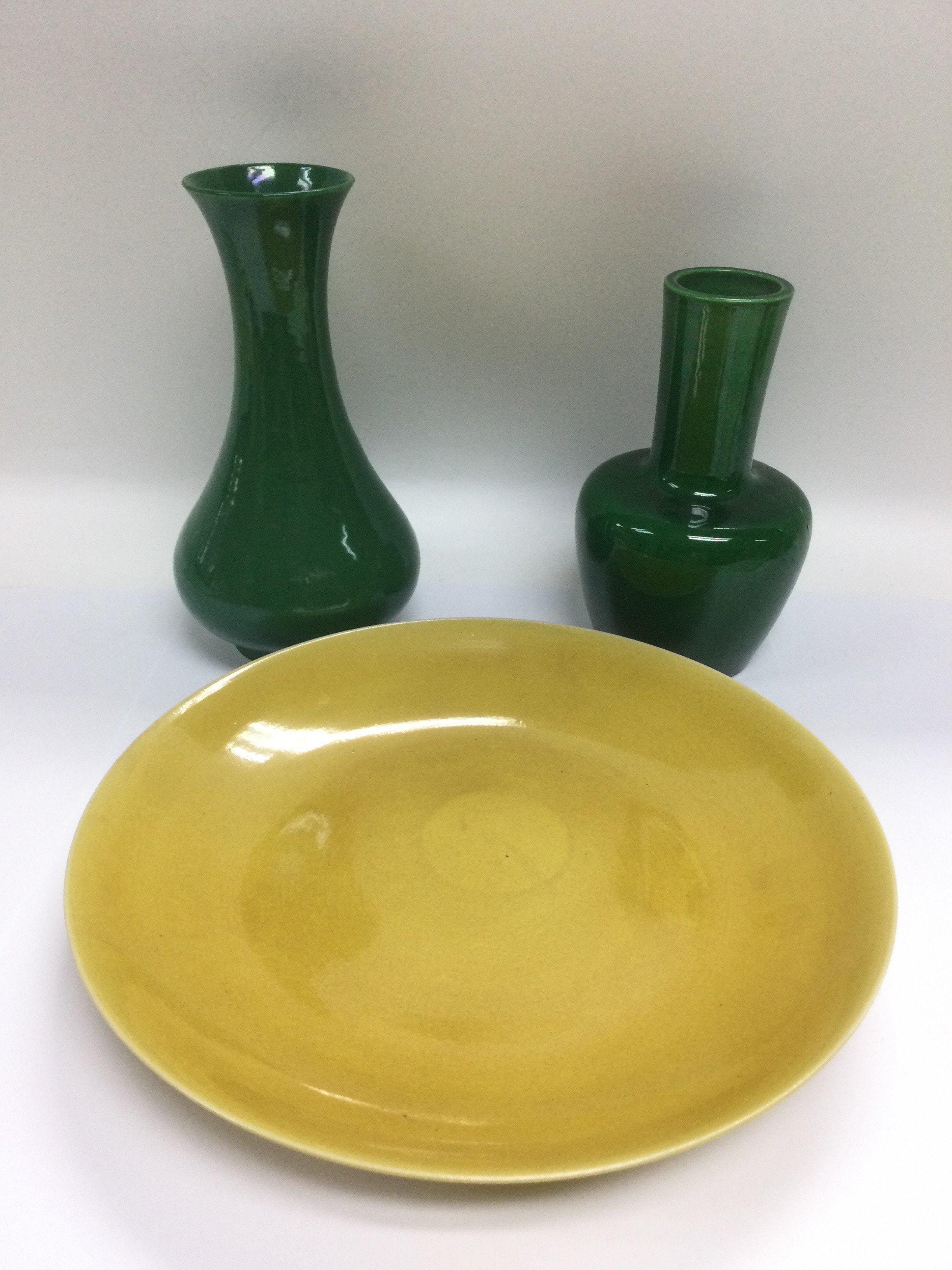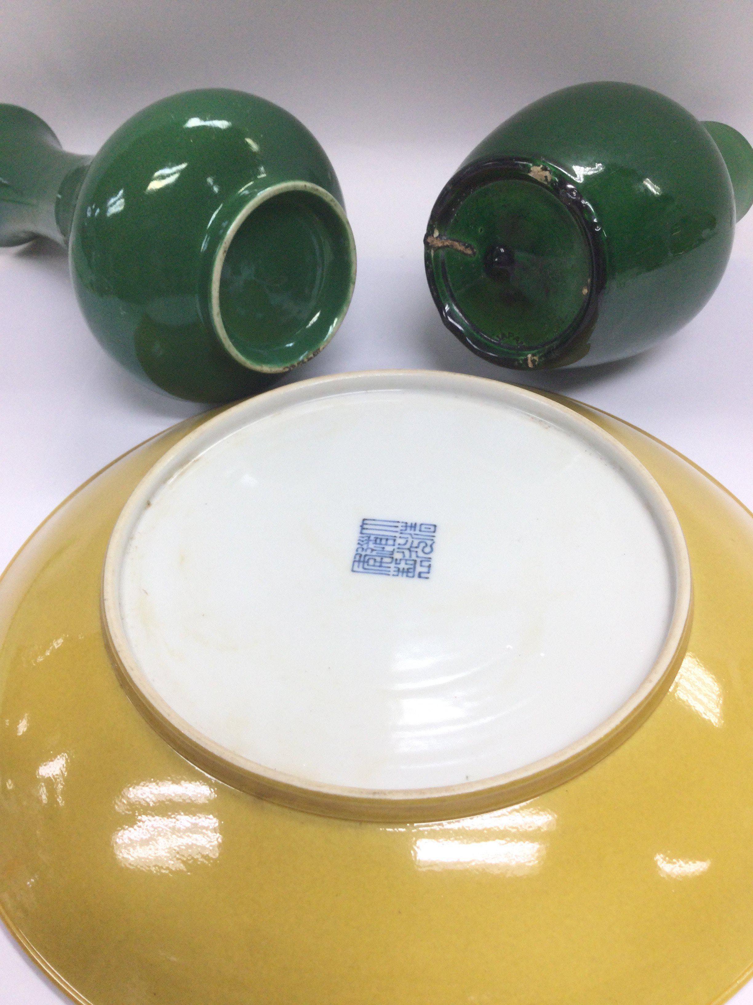 An oriental dish with character marks to base, approx diameter 27cm, together with two green vases, tallest approx 21.5cm (3). Shipping category D.