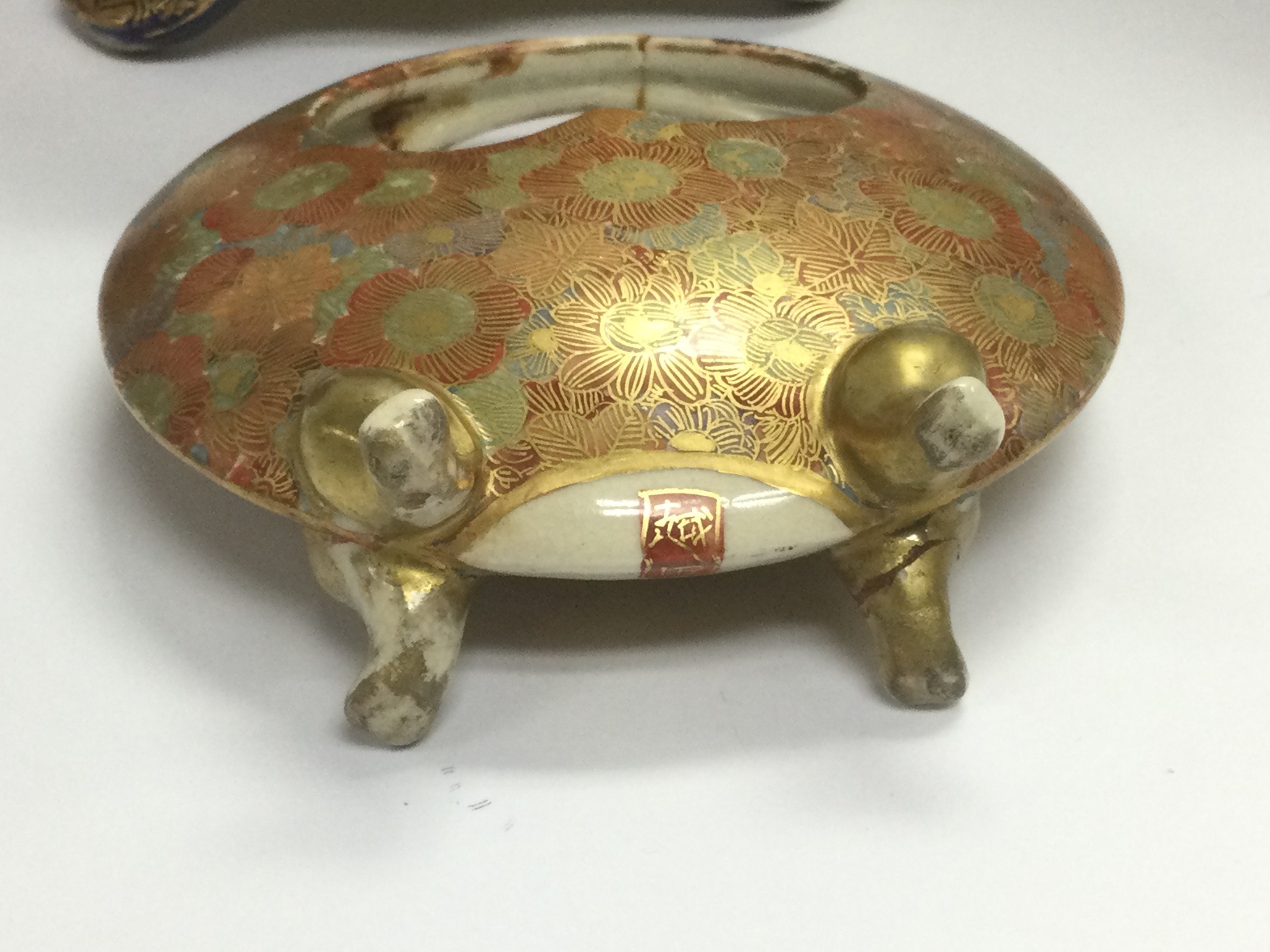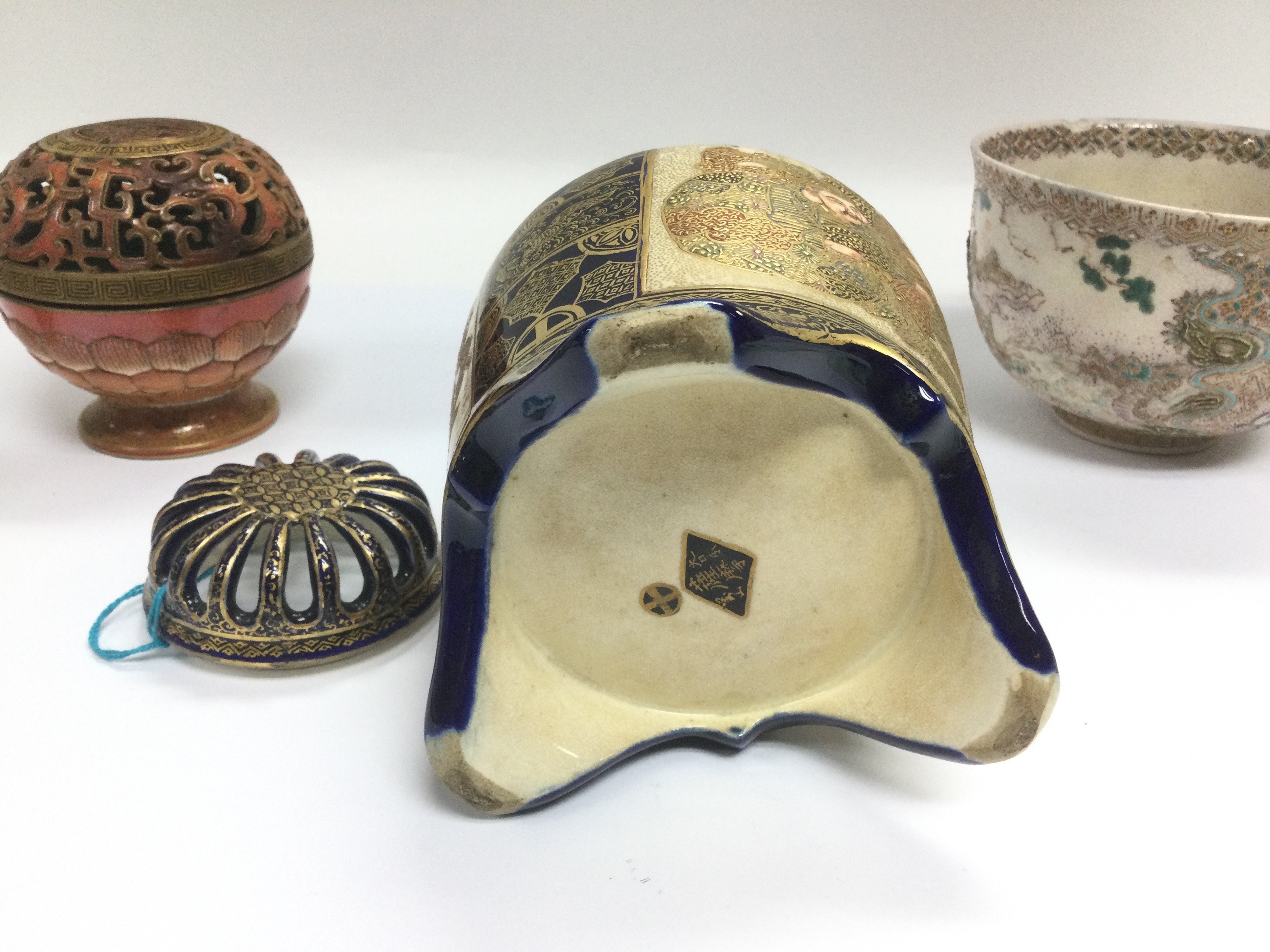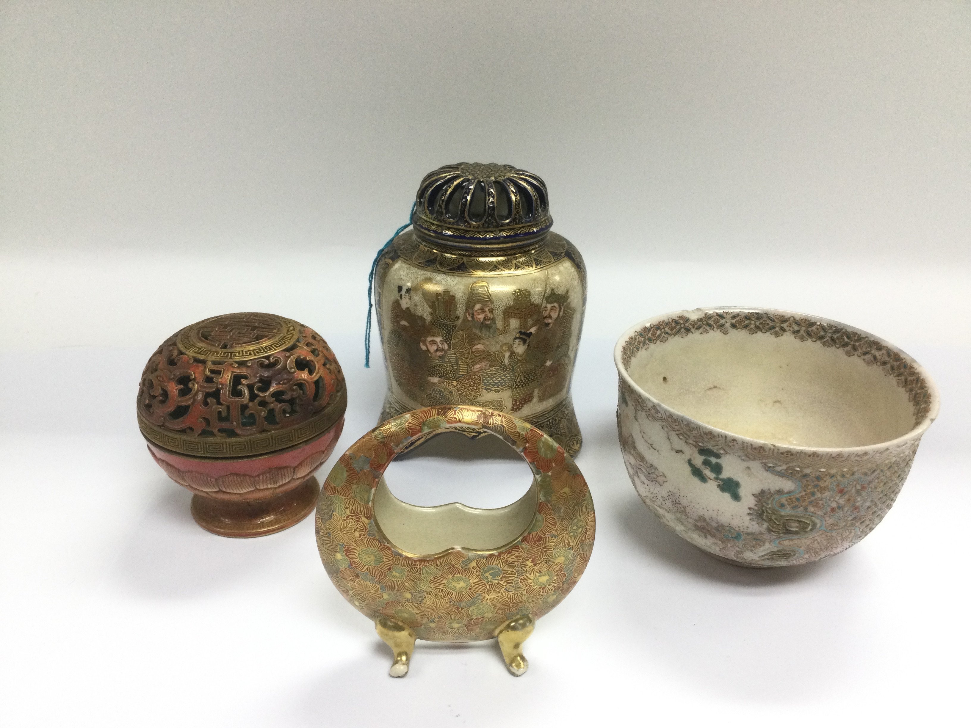 A Japanese Satsuma koro, approx height 13cm, together with three other Japanese ceramic items (4). Shipping category D.