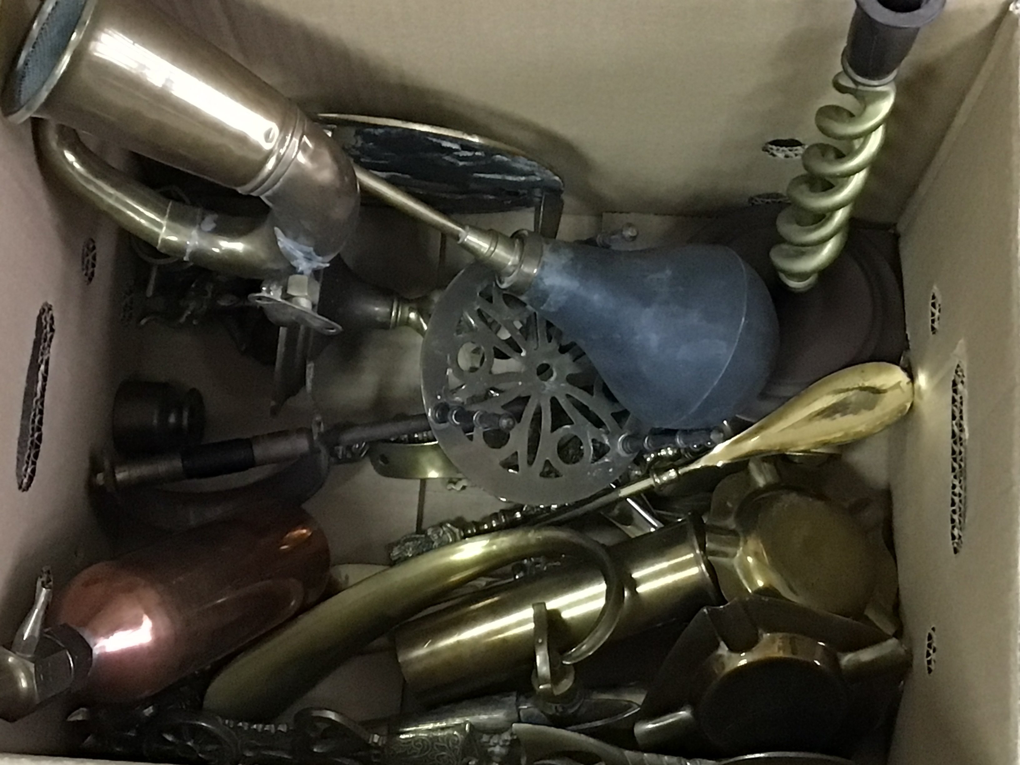 A box containing a collection of brass and copper including a vintage car horn candle sticks ammunition cases and other oddments.