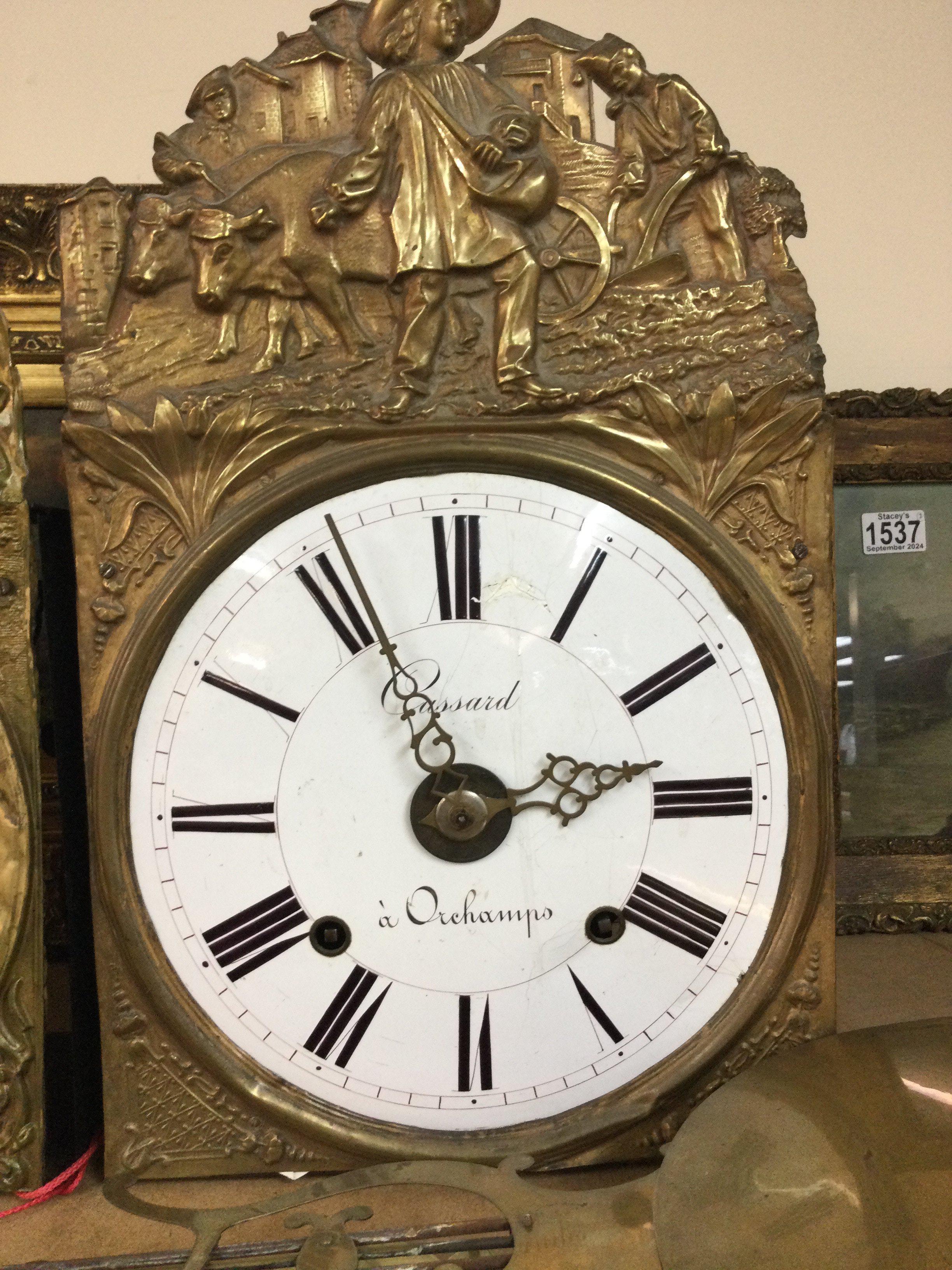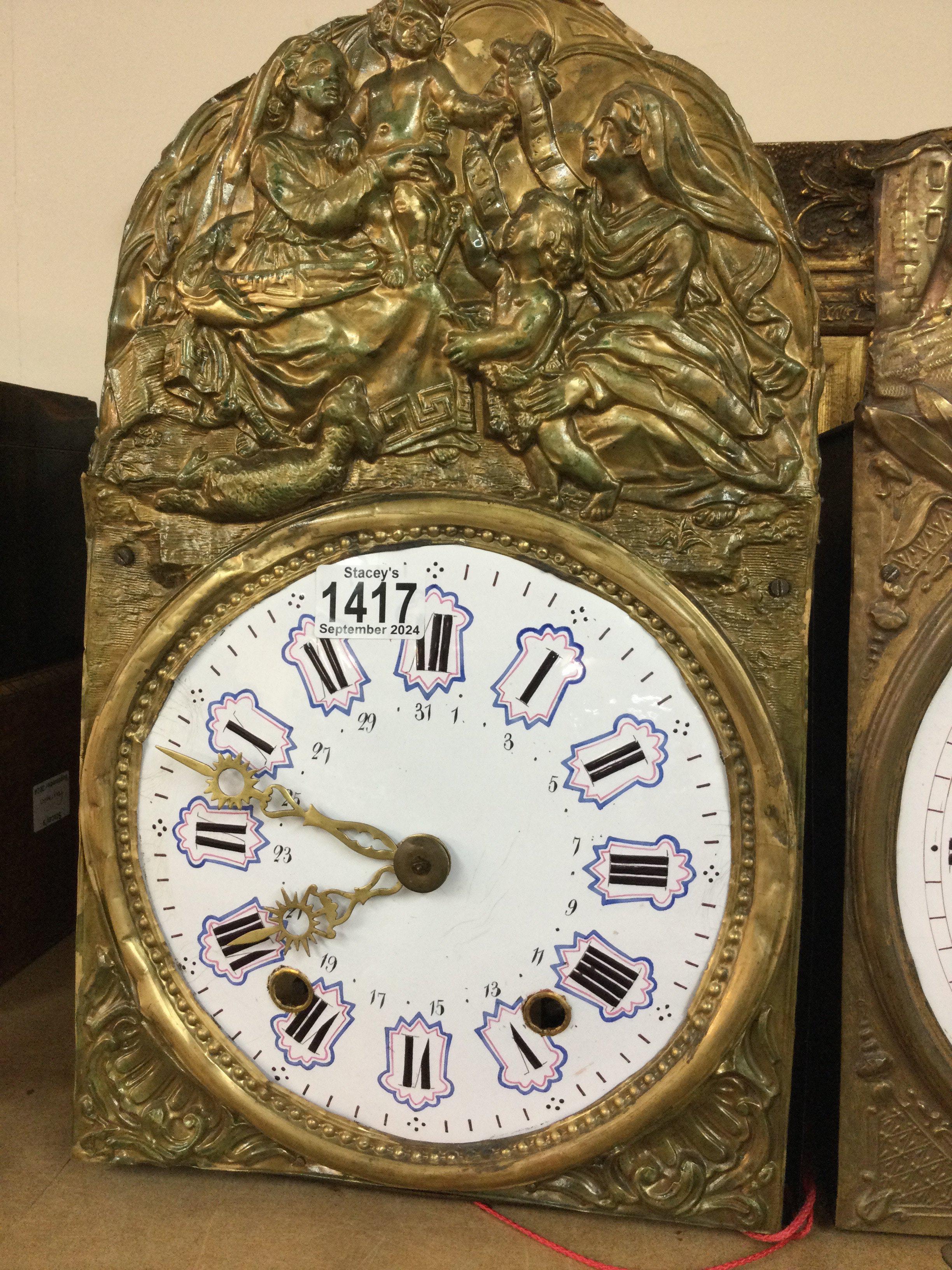 Two continental brass wall clocks with raised figures the enamel dial With Roman numerals with pendulums.