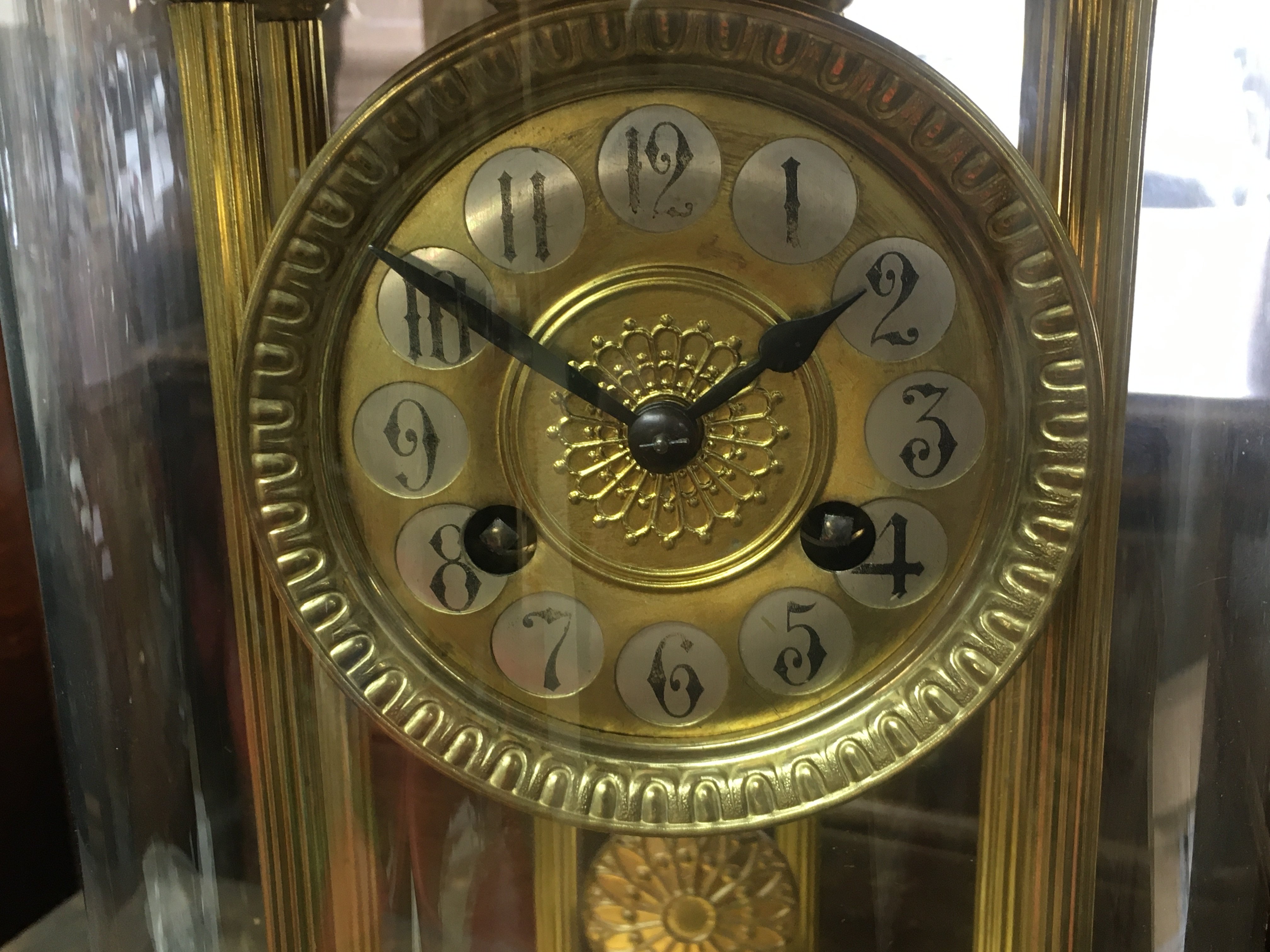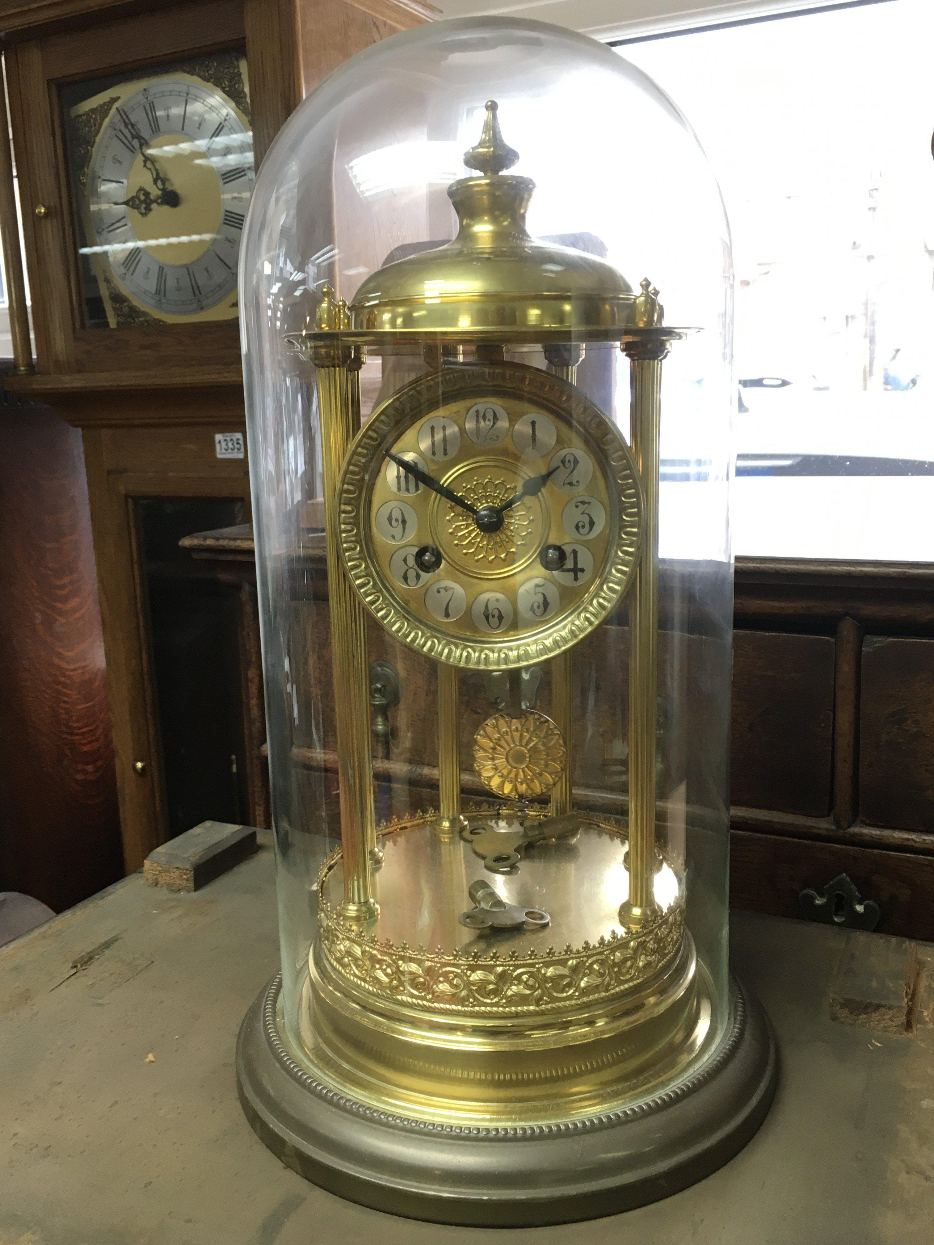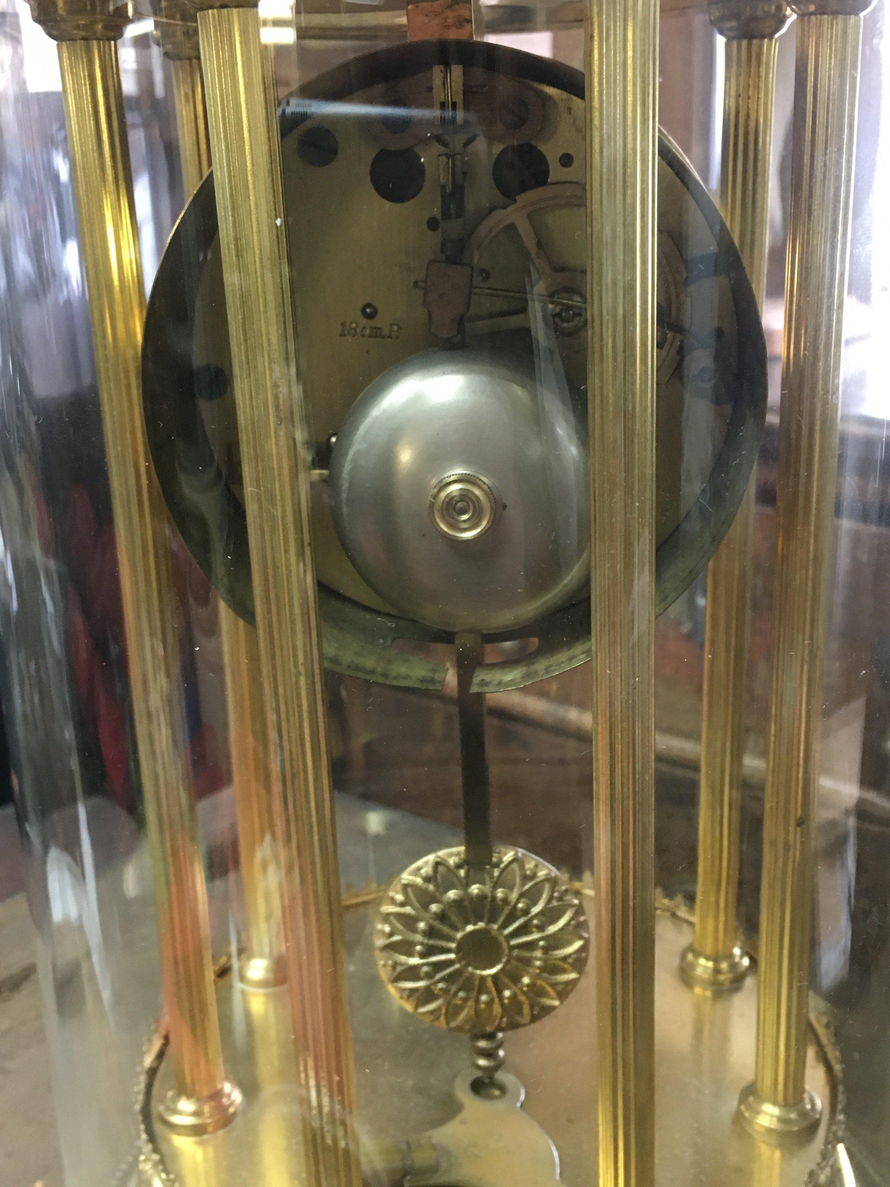 An early 20th century clock under a glass dome, 42cm tall. this lot cannot be posted