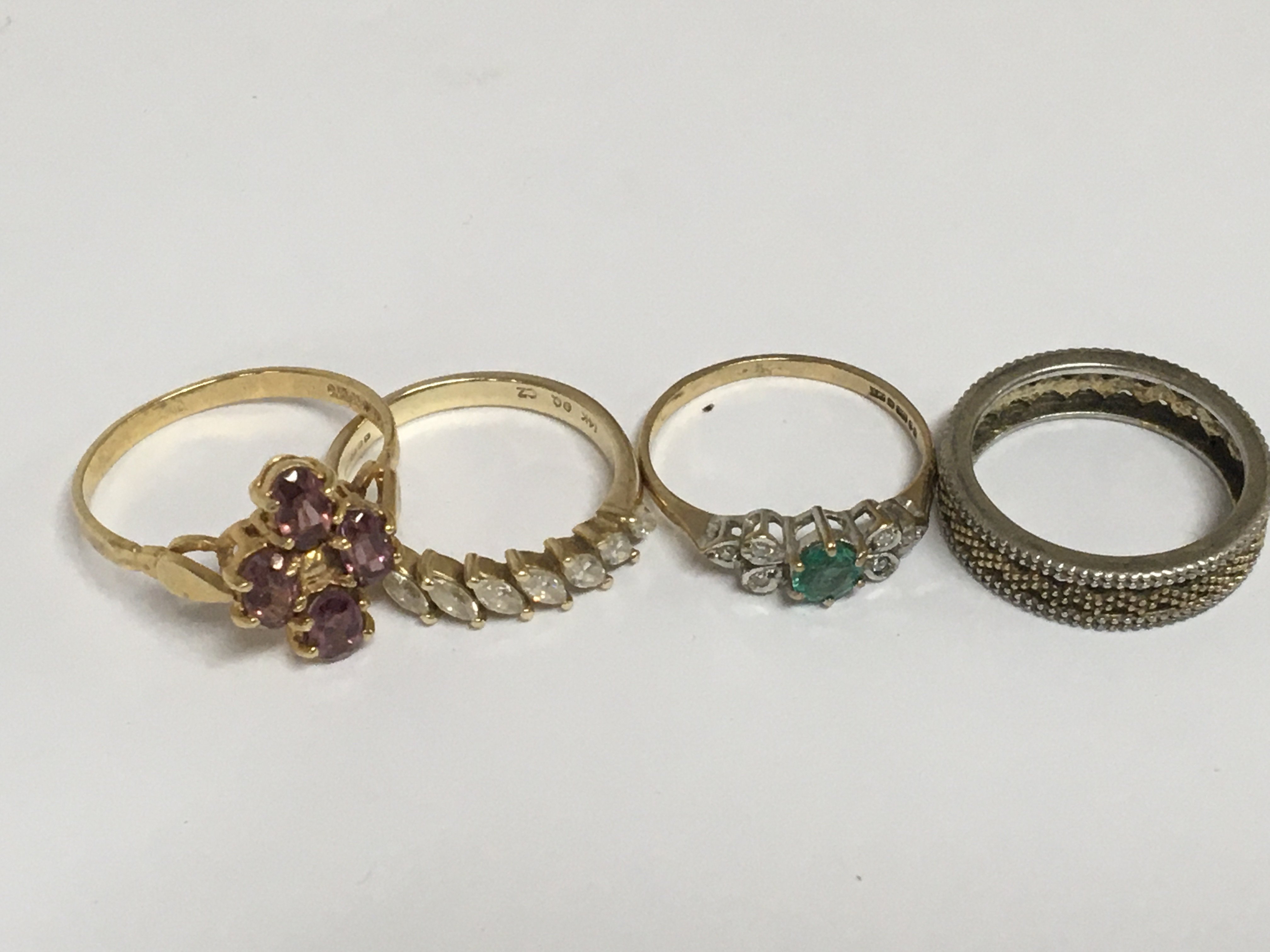A 14carat gold QVC ring set with CZ Two 9carat gold rings set with amethyst and green coloured stones and an eternity ring. total weight 7.5g