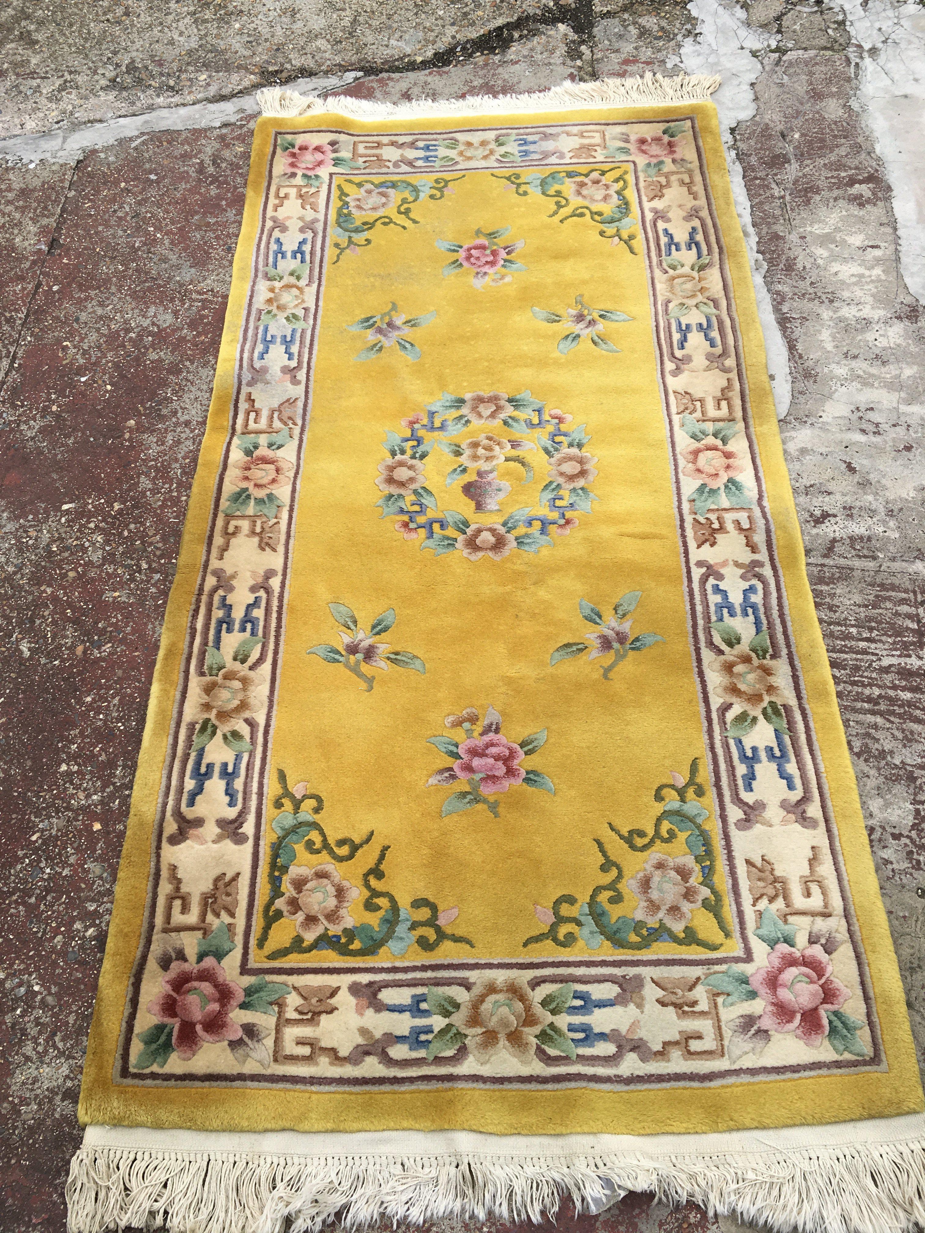 A Chinese rug with yellow floral design, dimensions 190x92cm