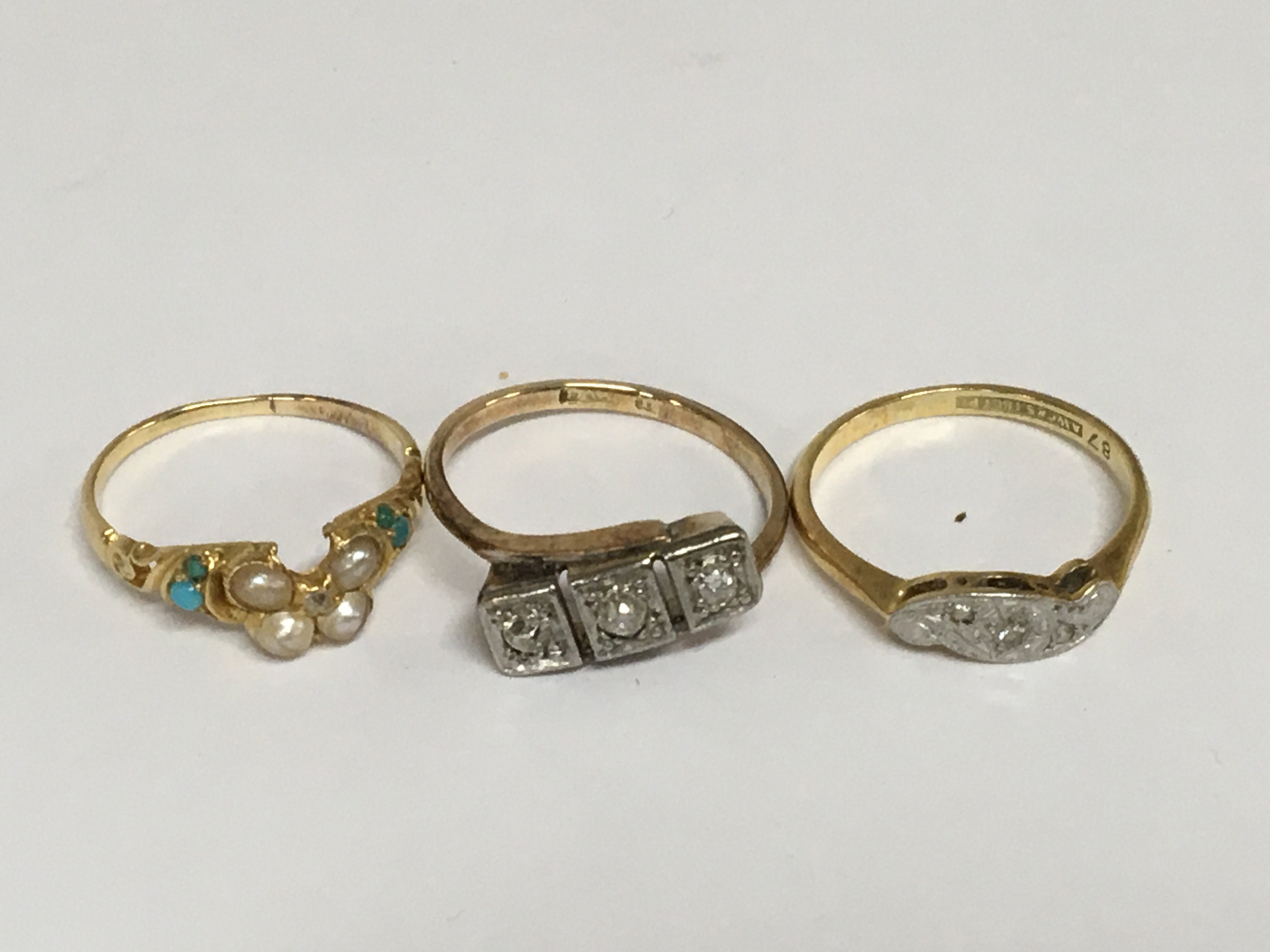Three 18carat gold rings set with small diamonds and seed pearl and turquoise weight 6g