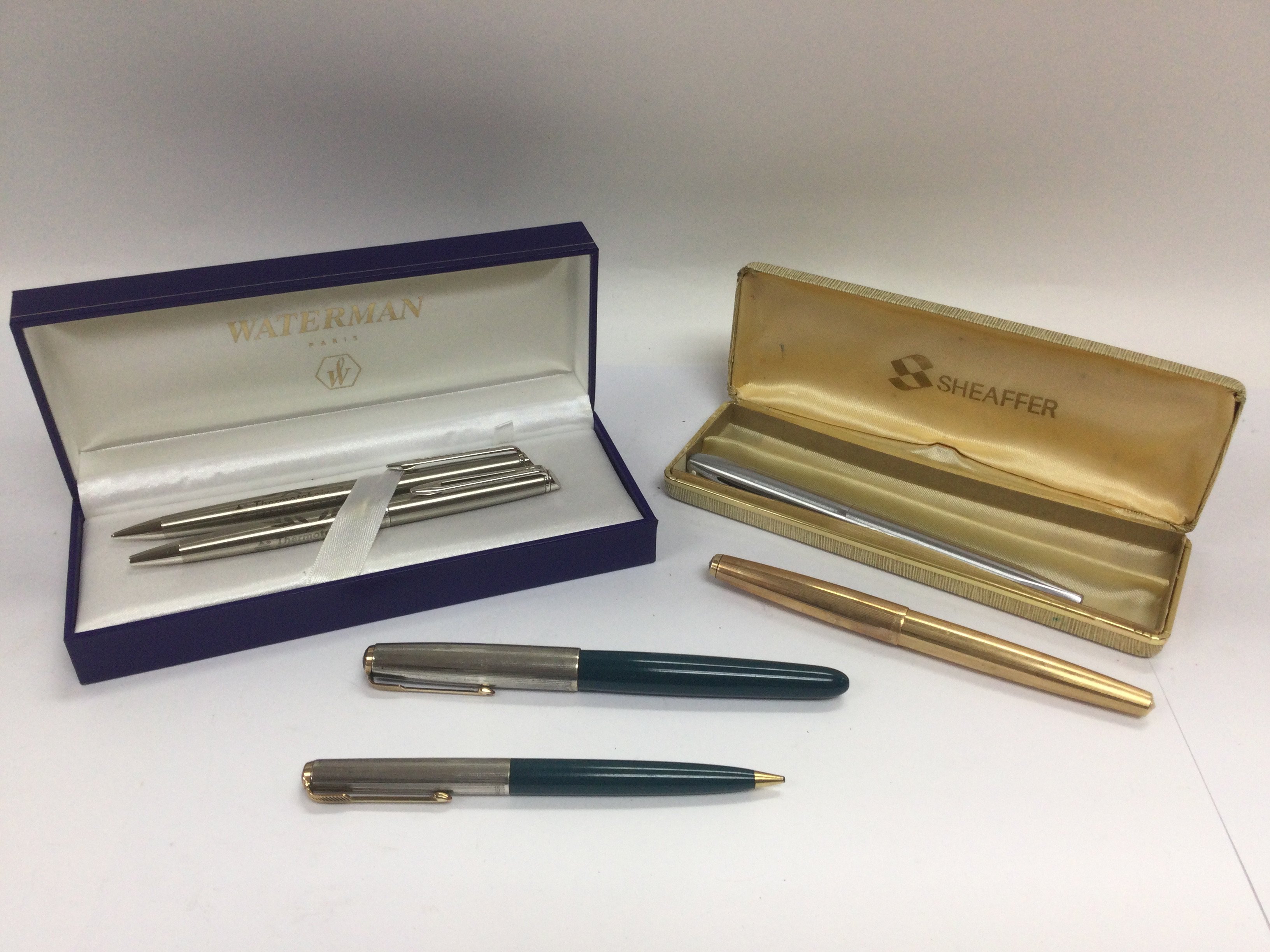 A collection of pens comprising a Parker 51 set, boxed Watermans set etc. Shipping category B.