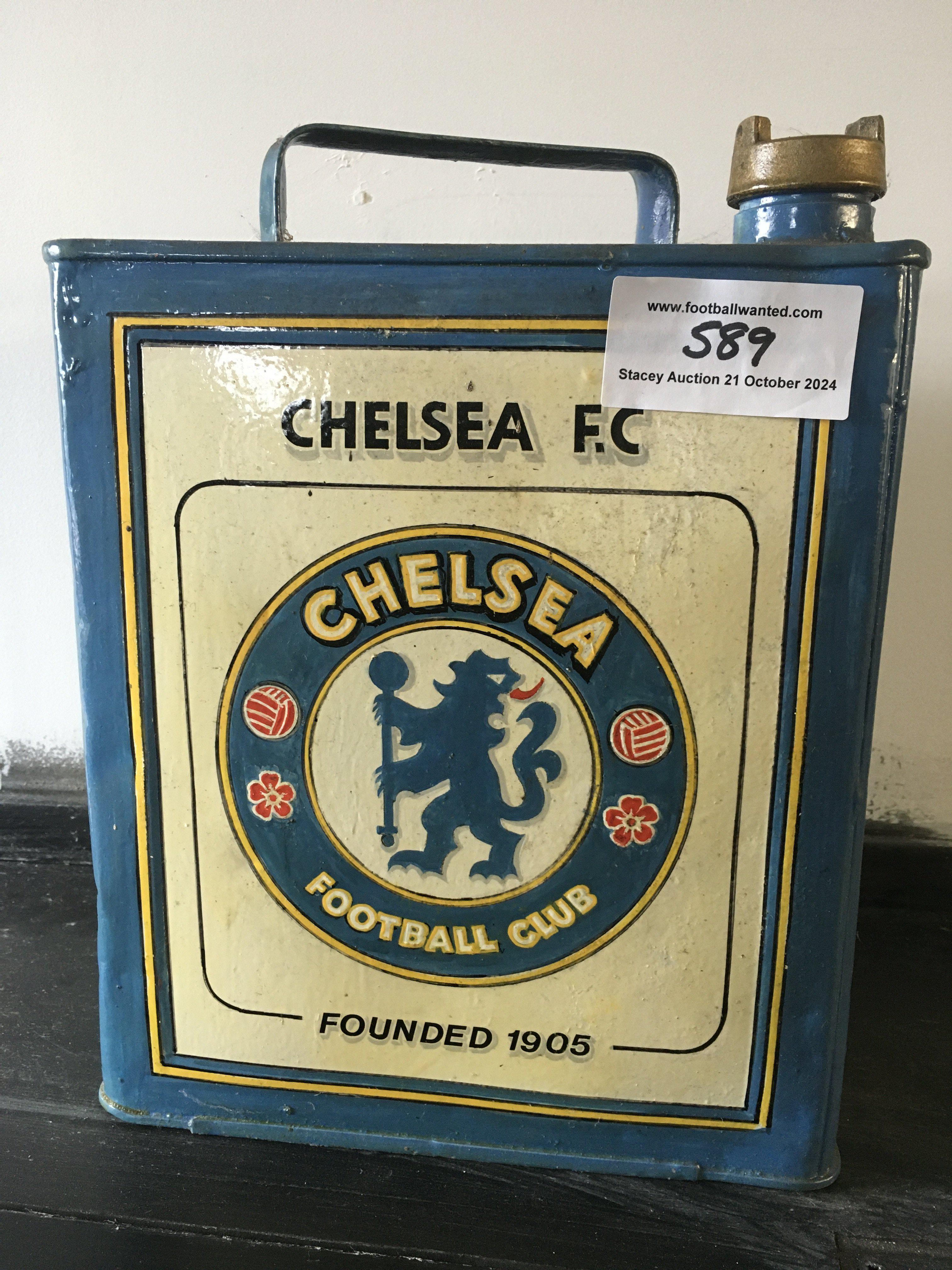 Chelsea Retro Old Petrol Can For Man Cave: Very old petrol can painted blue with Chelsea logo to whole of front. Whilst revamped around 10 years ago these 11 inch high old cans would be a great talking point in a bar or man cave.