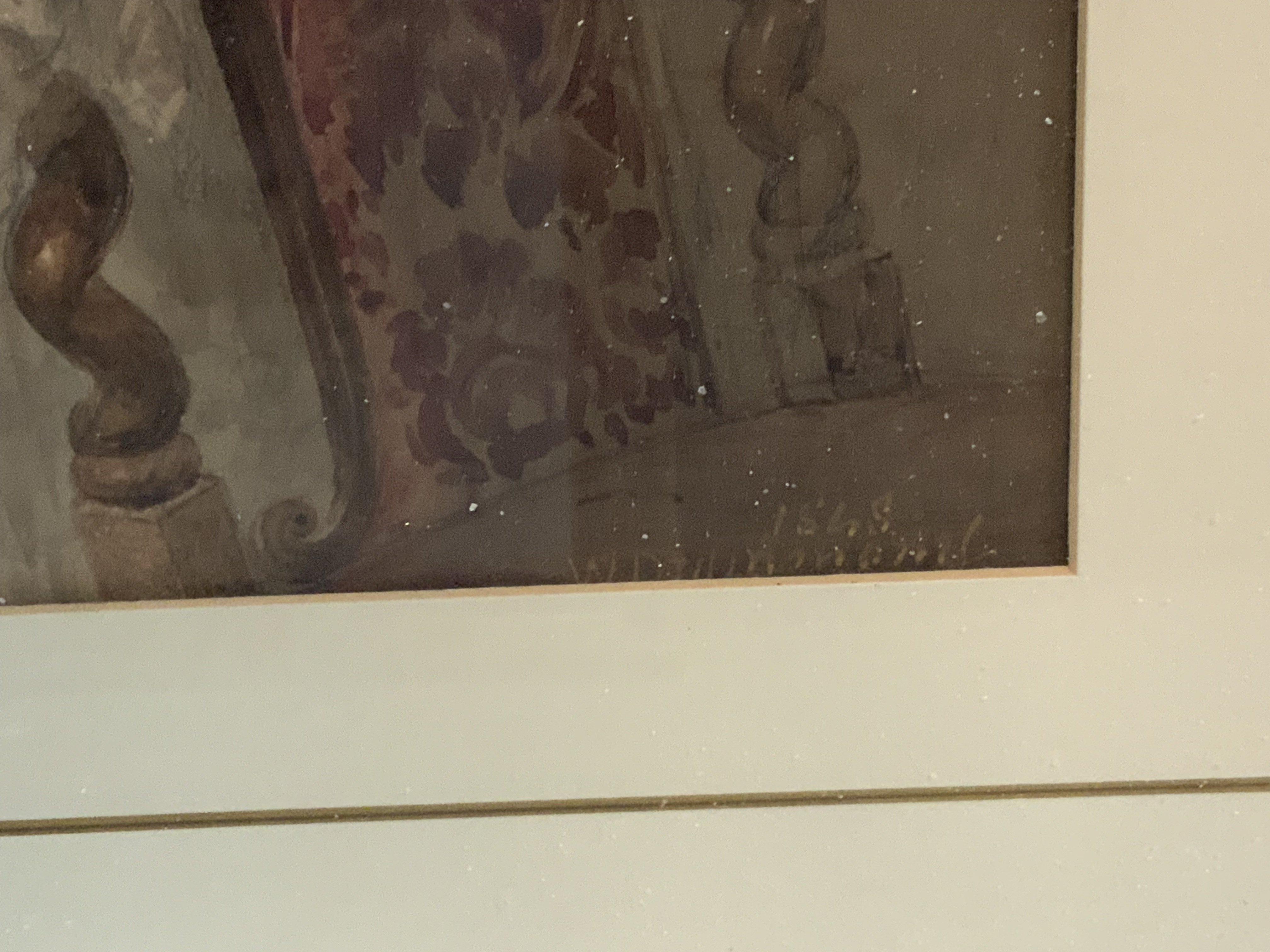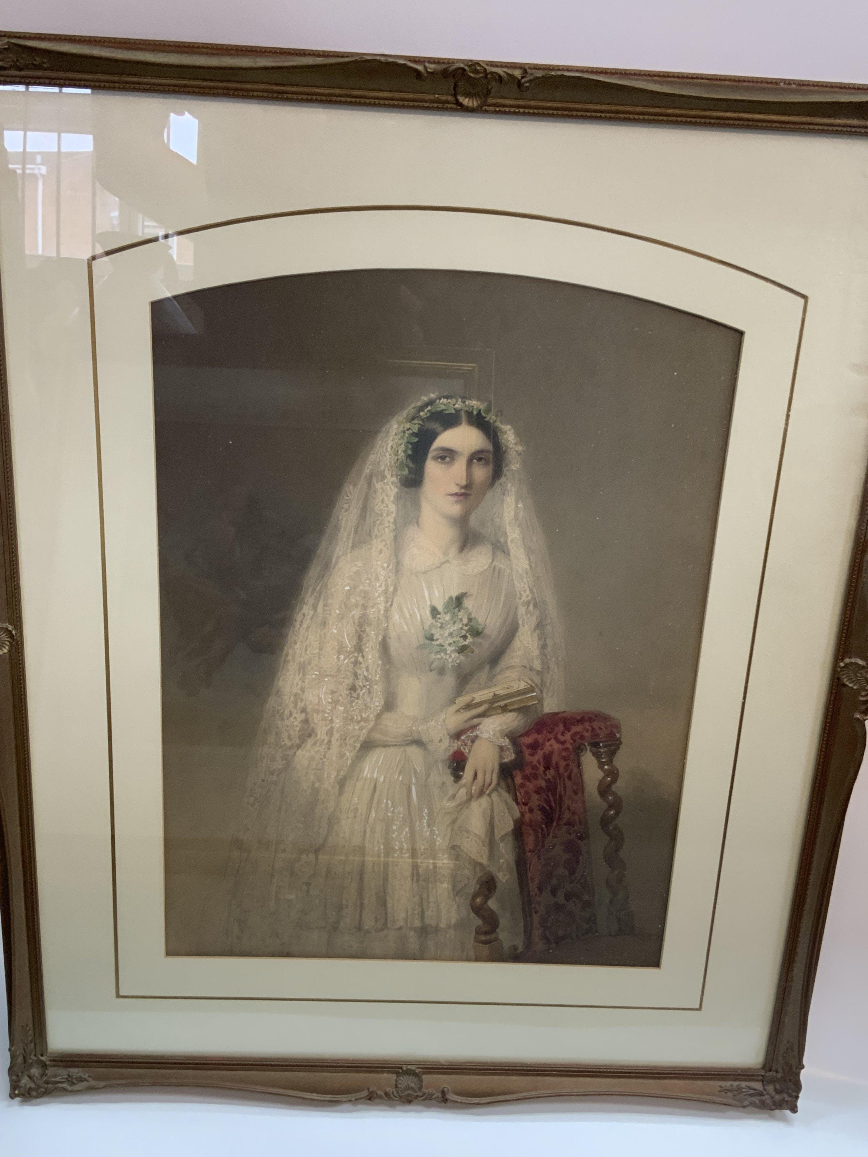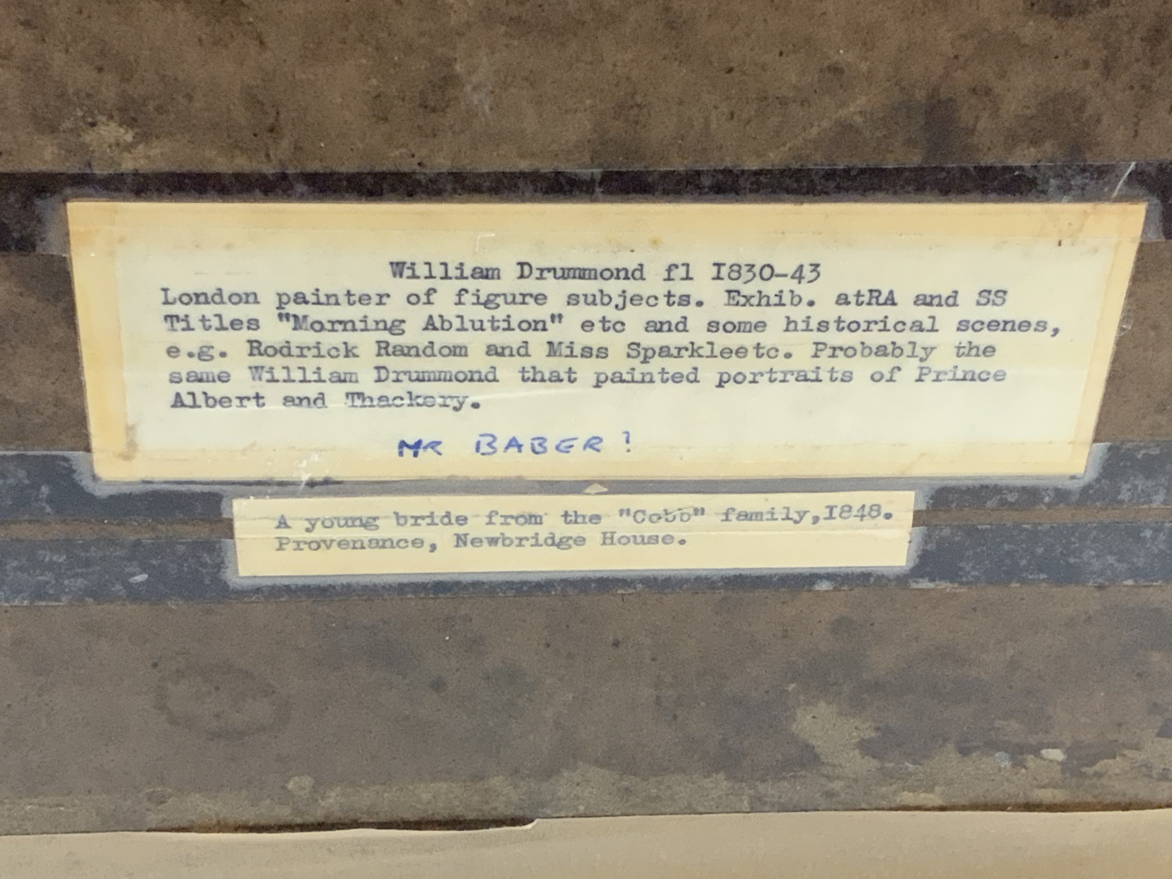 William Drummond, 1800-1850, watercolour on paper of a lady in a wedding dress. Later gilt frame. Information on reverse, a young bride from the Cobb family 1848, Newbridge house. 70cm x 56.5cm (D)
