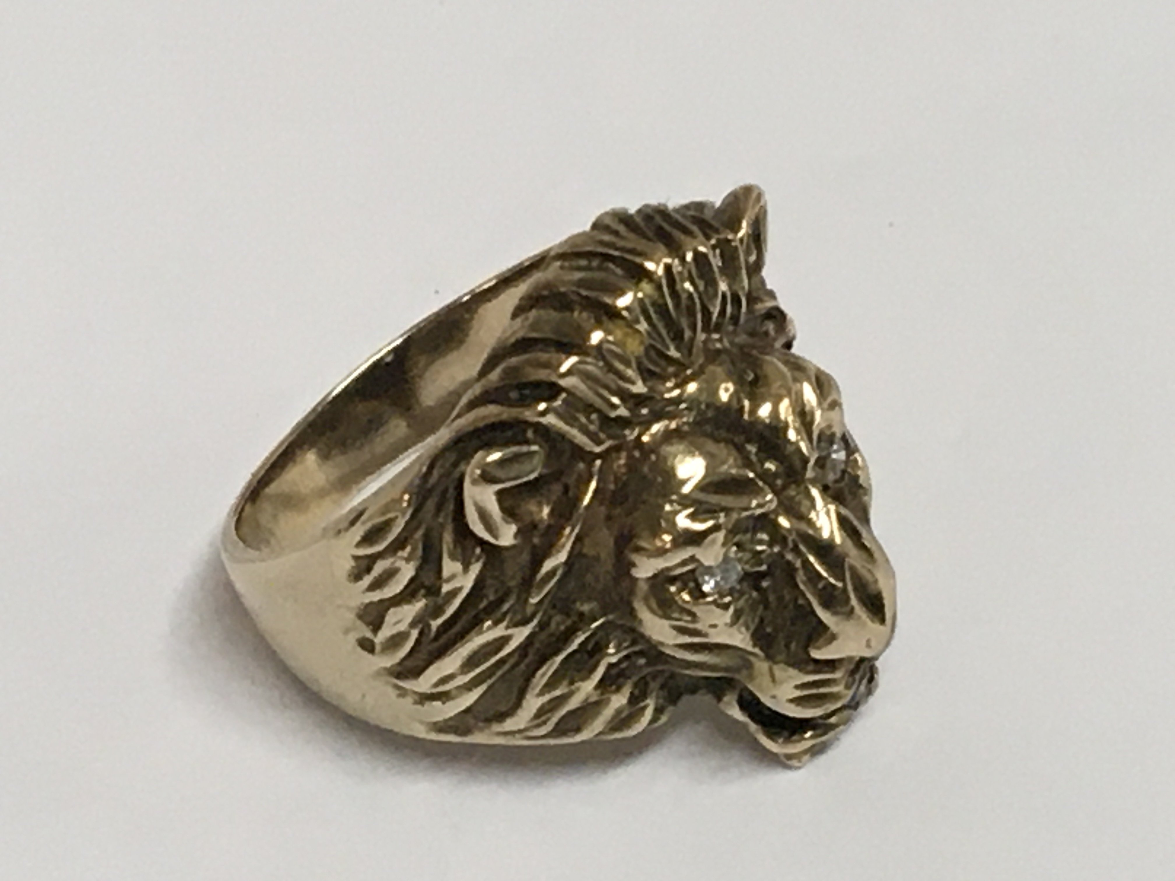 A gold 9carat unmarked ring in the form of a lions head the eyes set with diamonds. Weight 5.5g