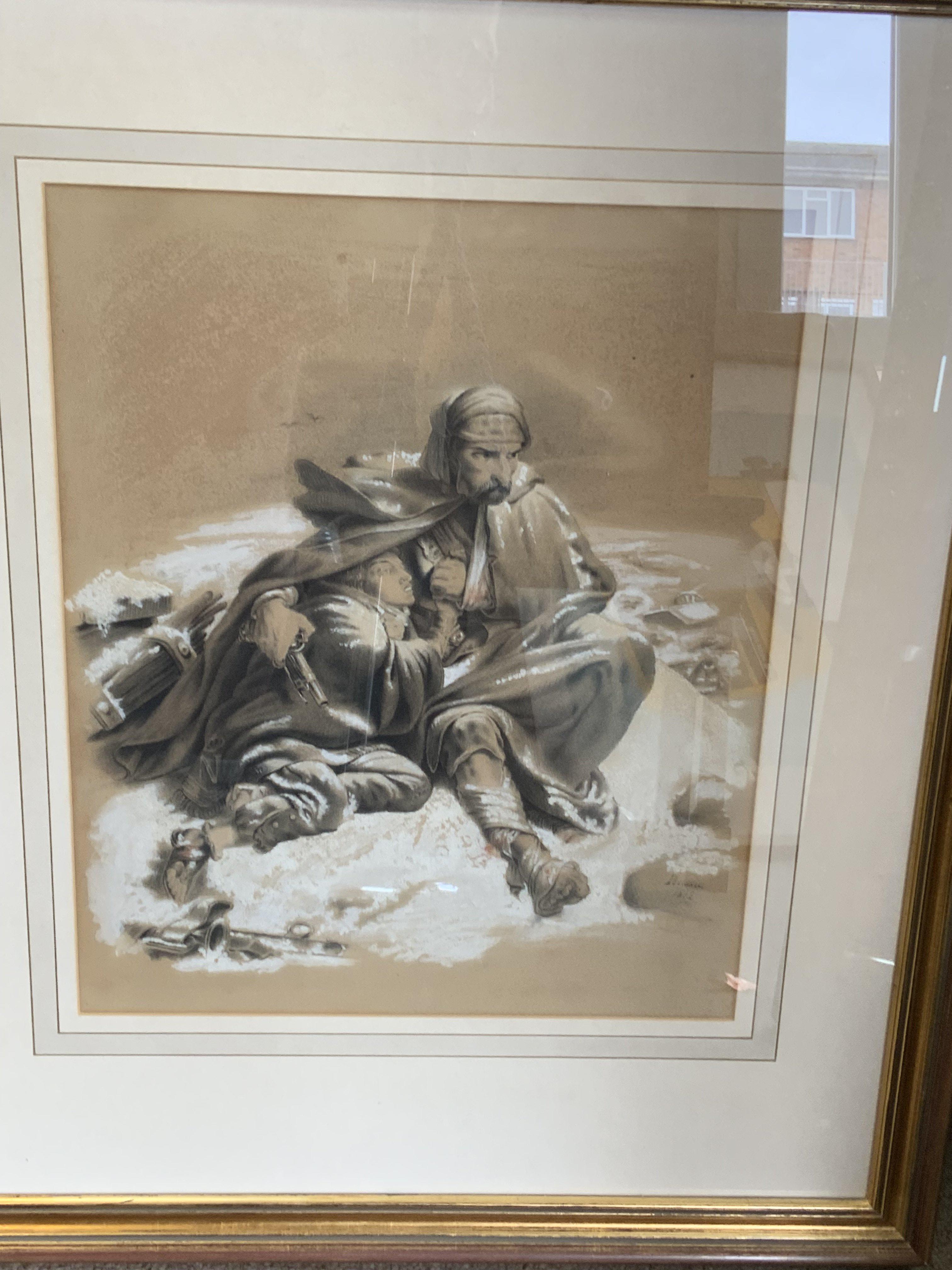 A watercolour painting of a Russian Solider, dated 1812. 67cm x 57cm (D)