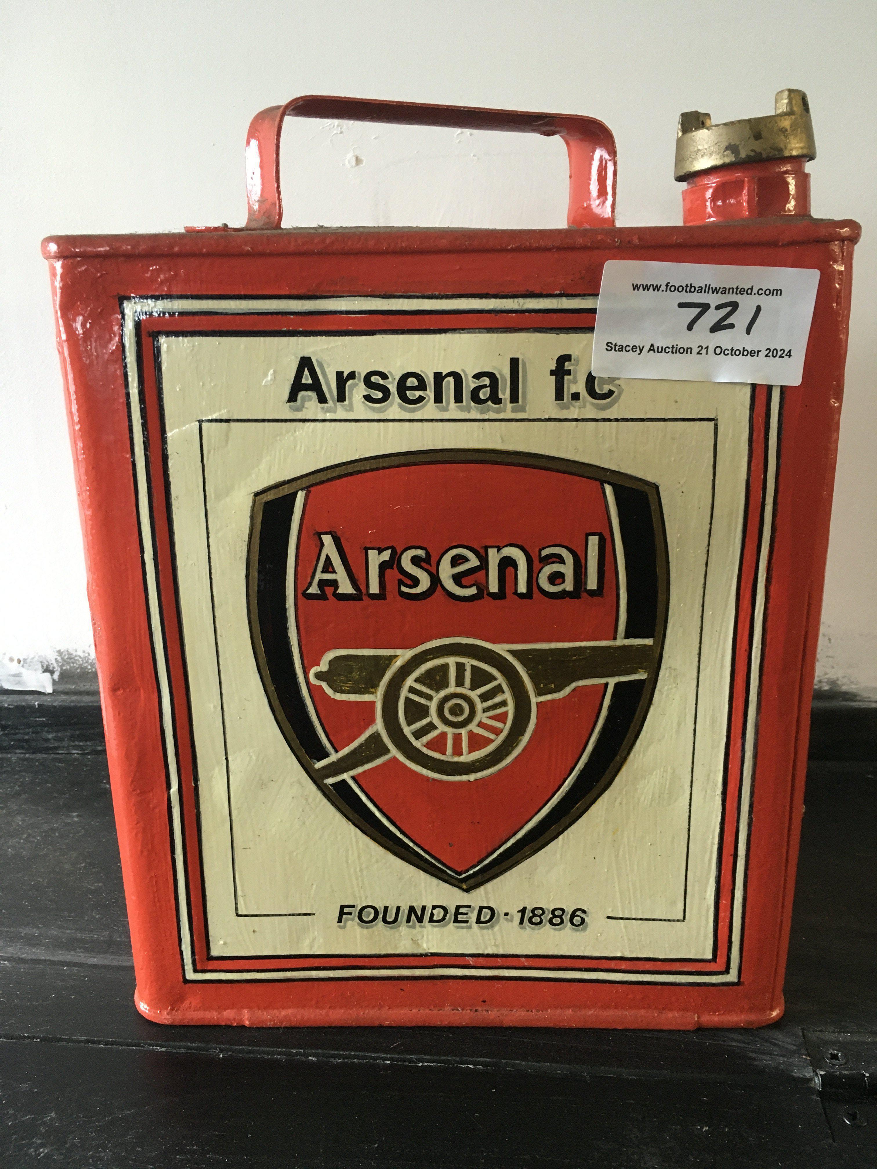 Arsenal Retro Old Petrol Can For Man Cave: Very old petrol can painted red with Arsenal logo to whole of front. Whilst revamped around 10 years ago these 11 inch high old cans would be a great talking point in a bar or man cave.