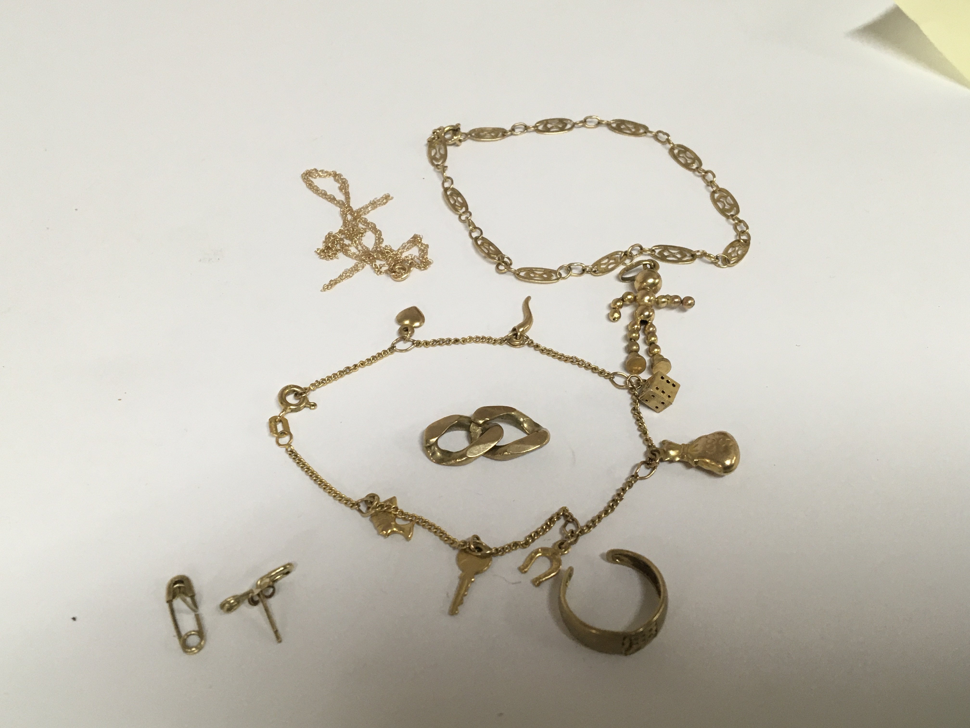 A 9carat gold charm bracelet one other gold bracelet a gold charm and other gold oddments. 10.5g