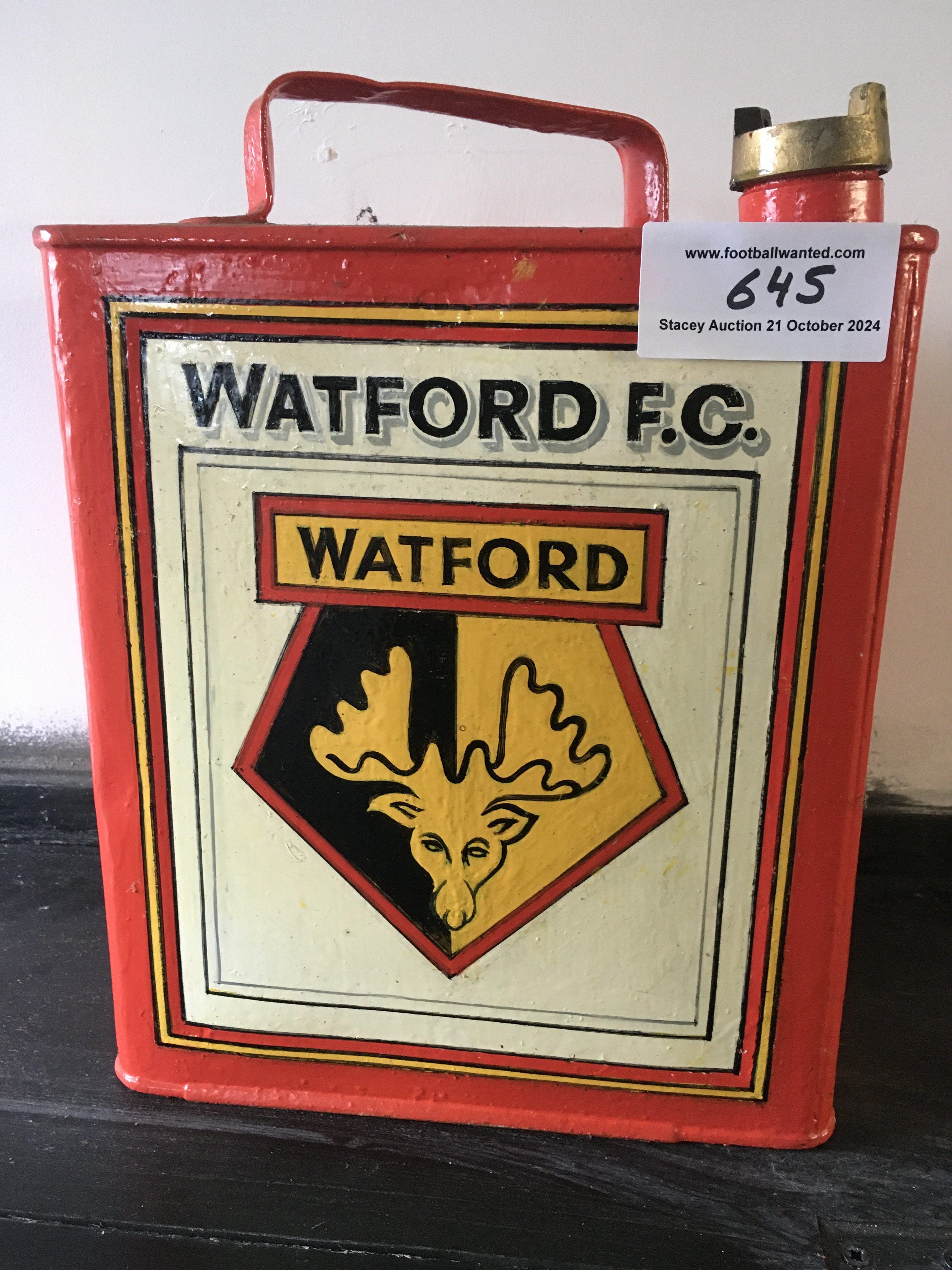 Watford Retro Old Petrol Can For Man Cave: Very old petrol can painted orange with Watford logo to whole of front. Whilst revamped around 10 years ago these 11 inch high old cans would be a great talking point in a bar or man cave.