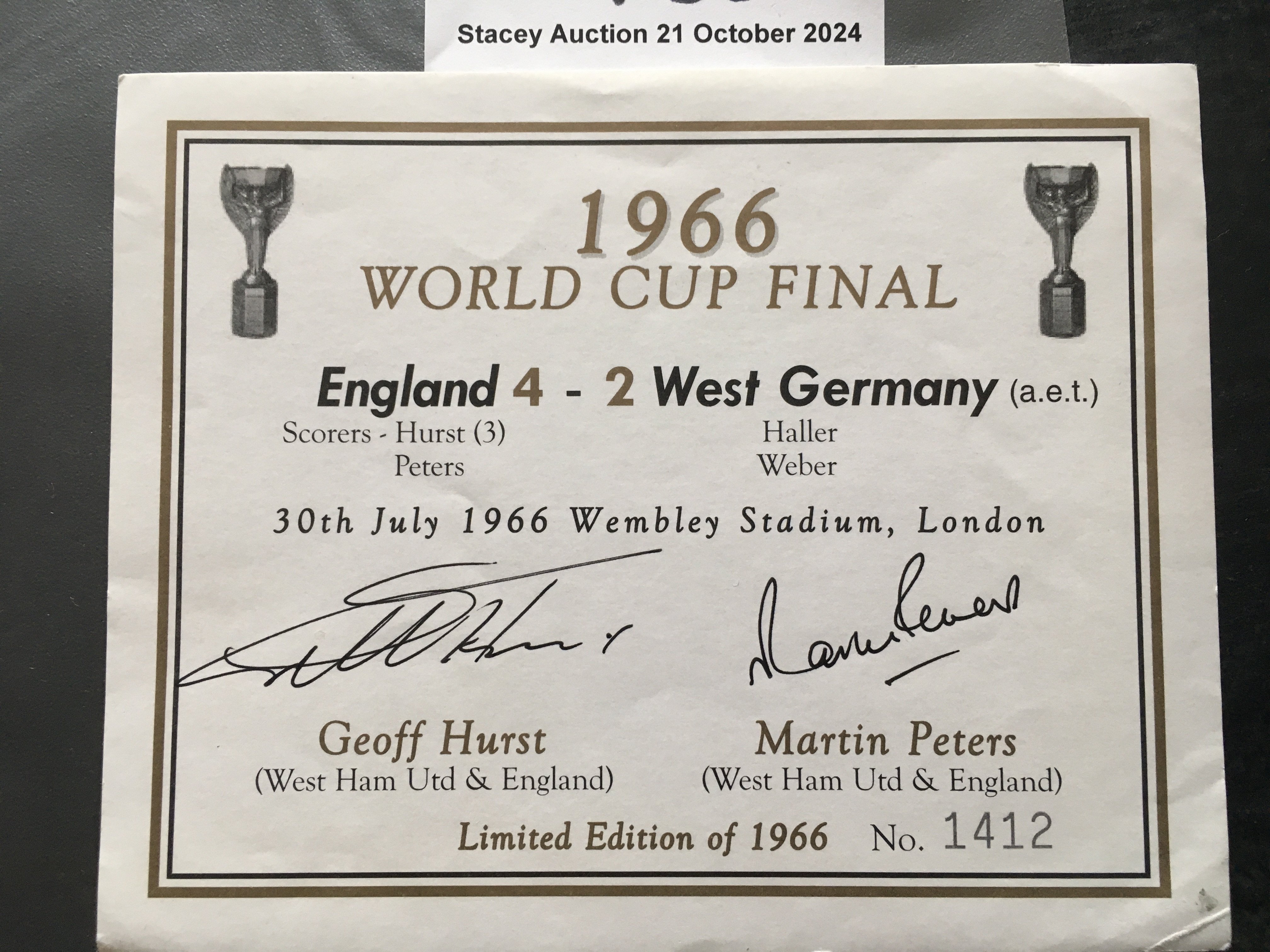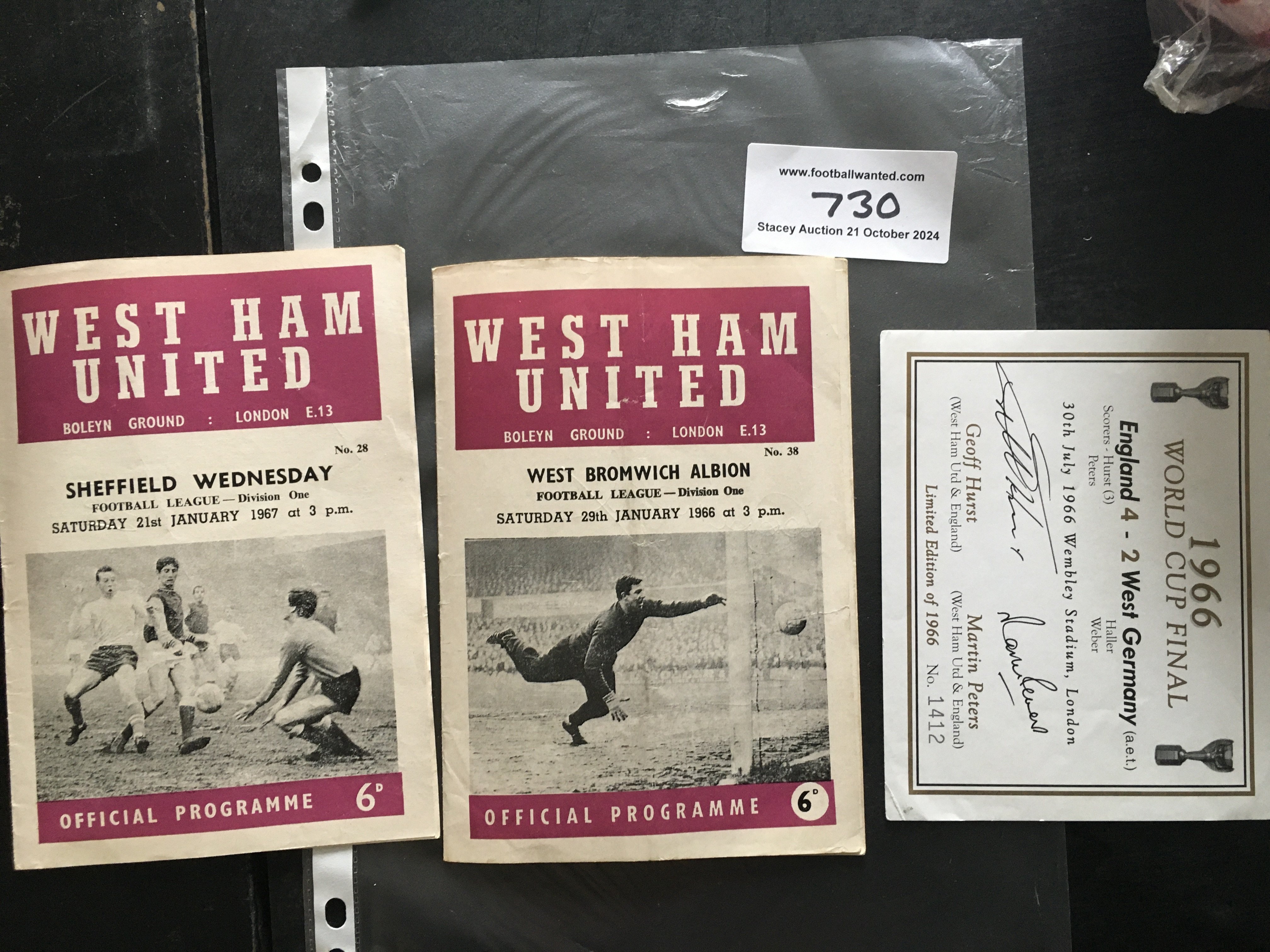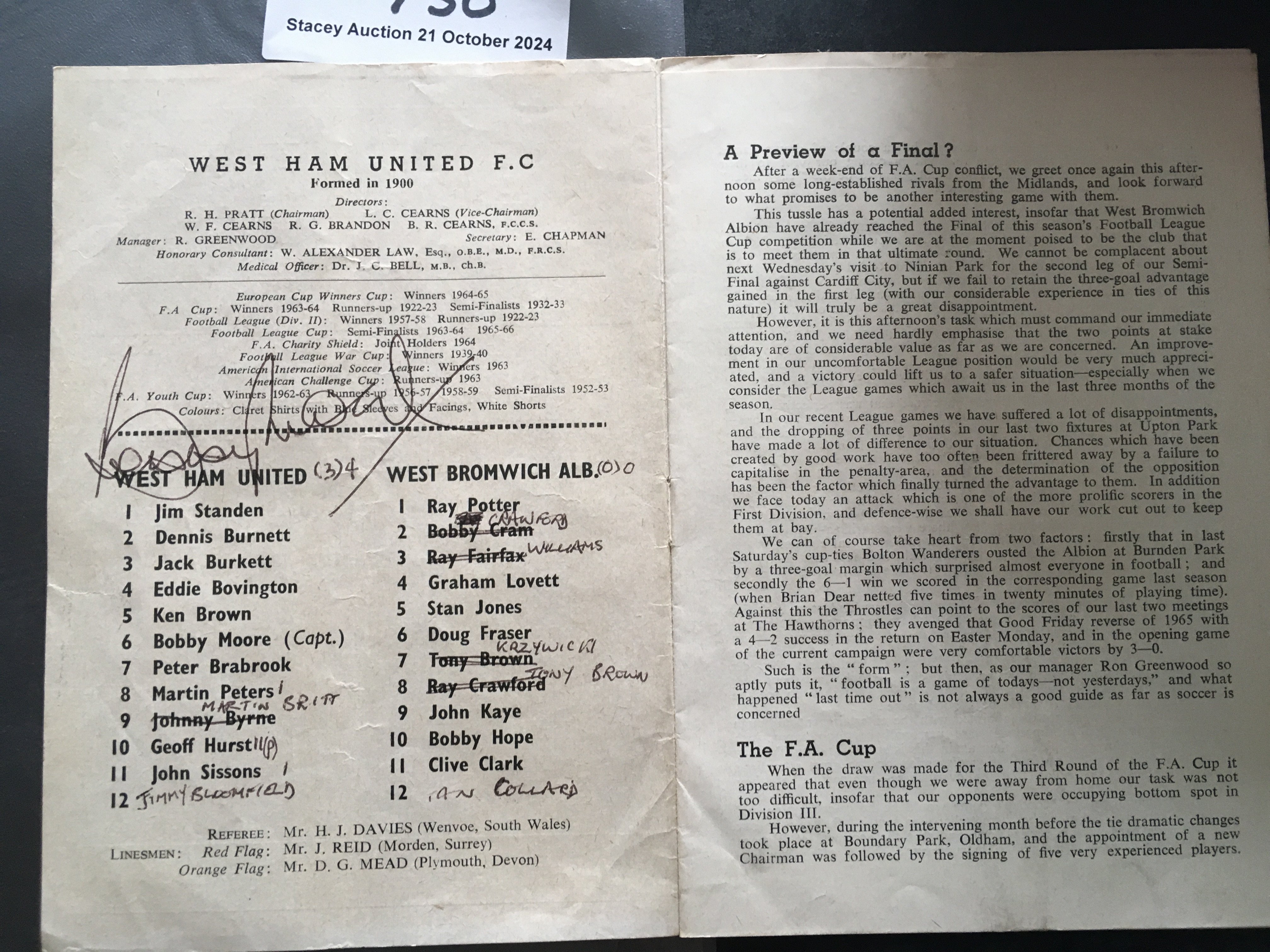 Moore Hurst + Peters Signed West Ham + England Football Items: West Ham home programme signed to team page by Bobby Moore. C/W label which could be used for a wine bottle signed by other World Cup winners Hurst and Peters.