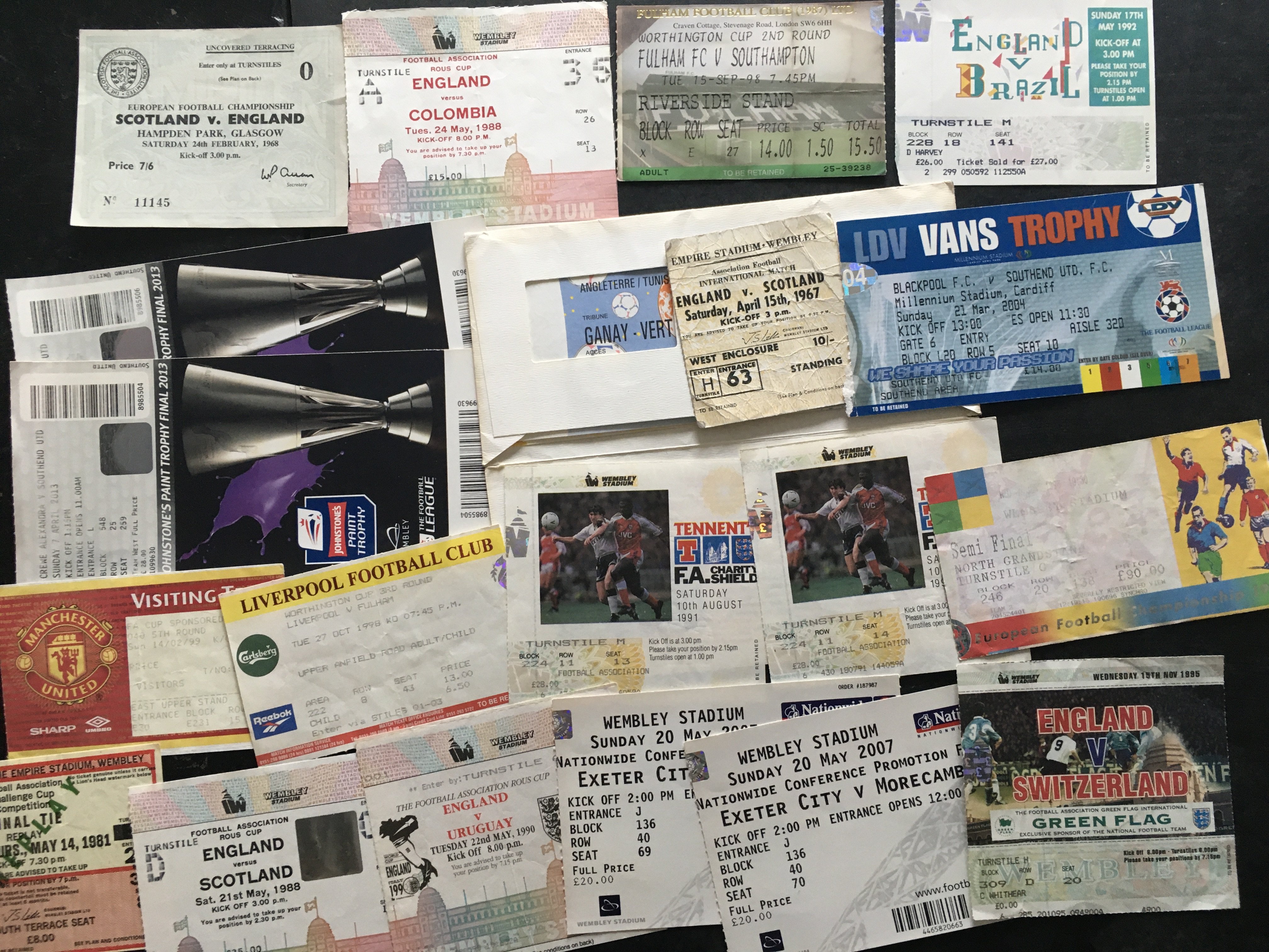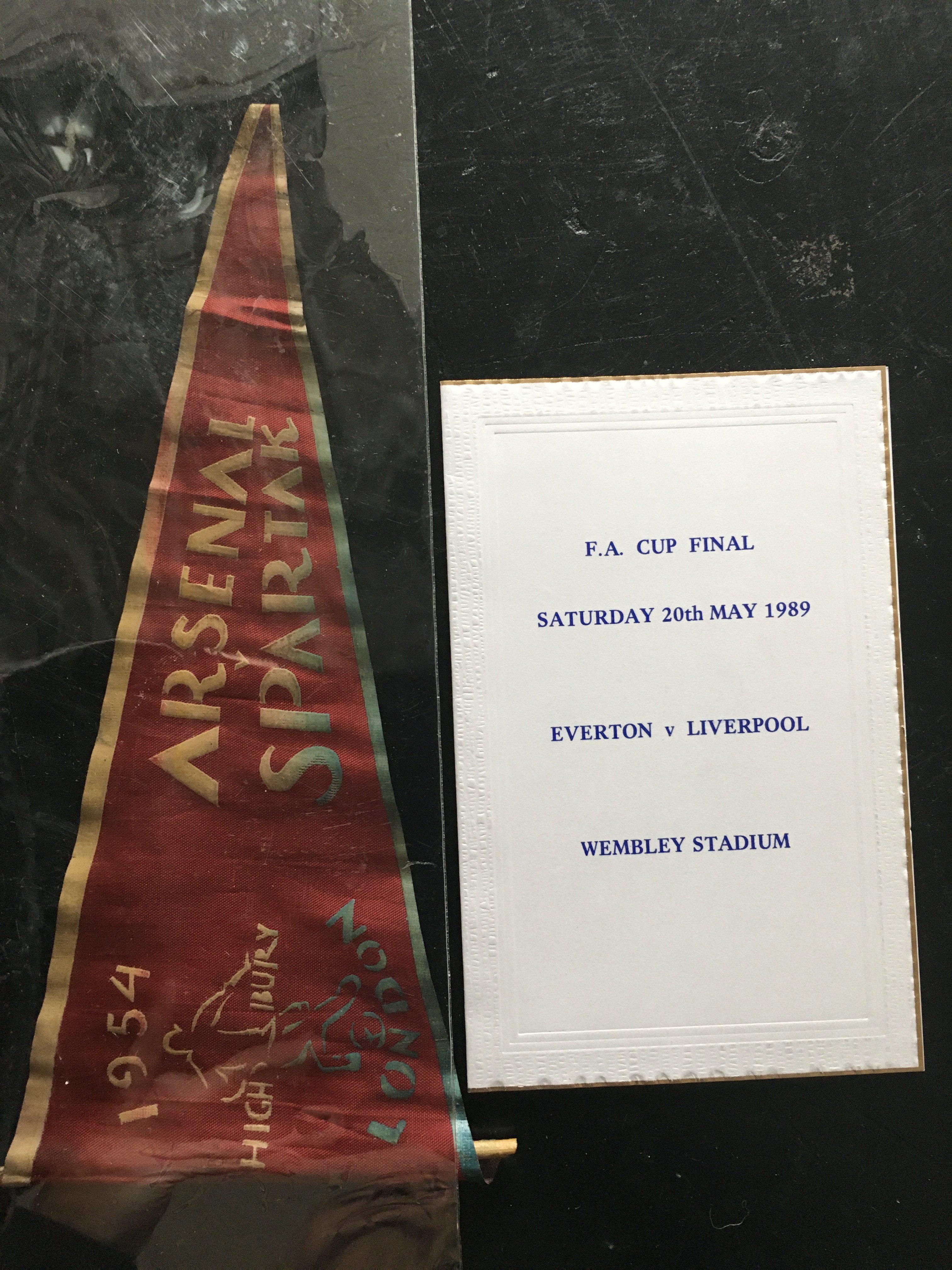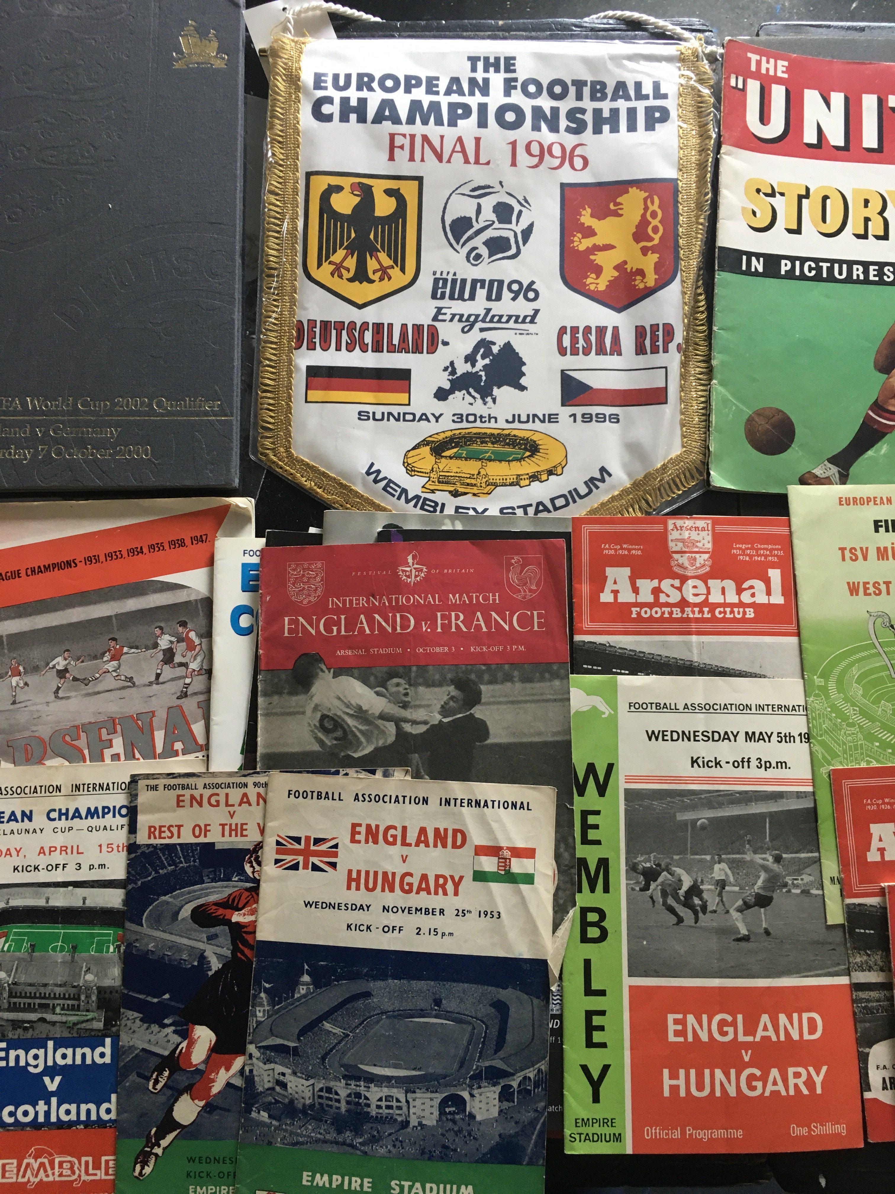 Football Memorabilia Box: Worth a look as wide range of nice items. Includes hardback version programme of last match at Wembley England v West Germany, Euro 96 pennant, big match programmes, Arsenal 47/48 championship brochure, 54/55 table decoration for match v Spartak, 1989 FA Cup final menu. C/W some big match tickets.