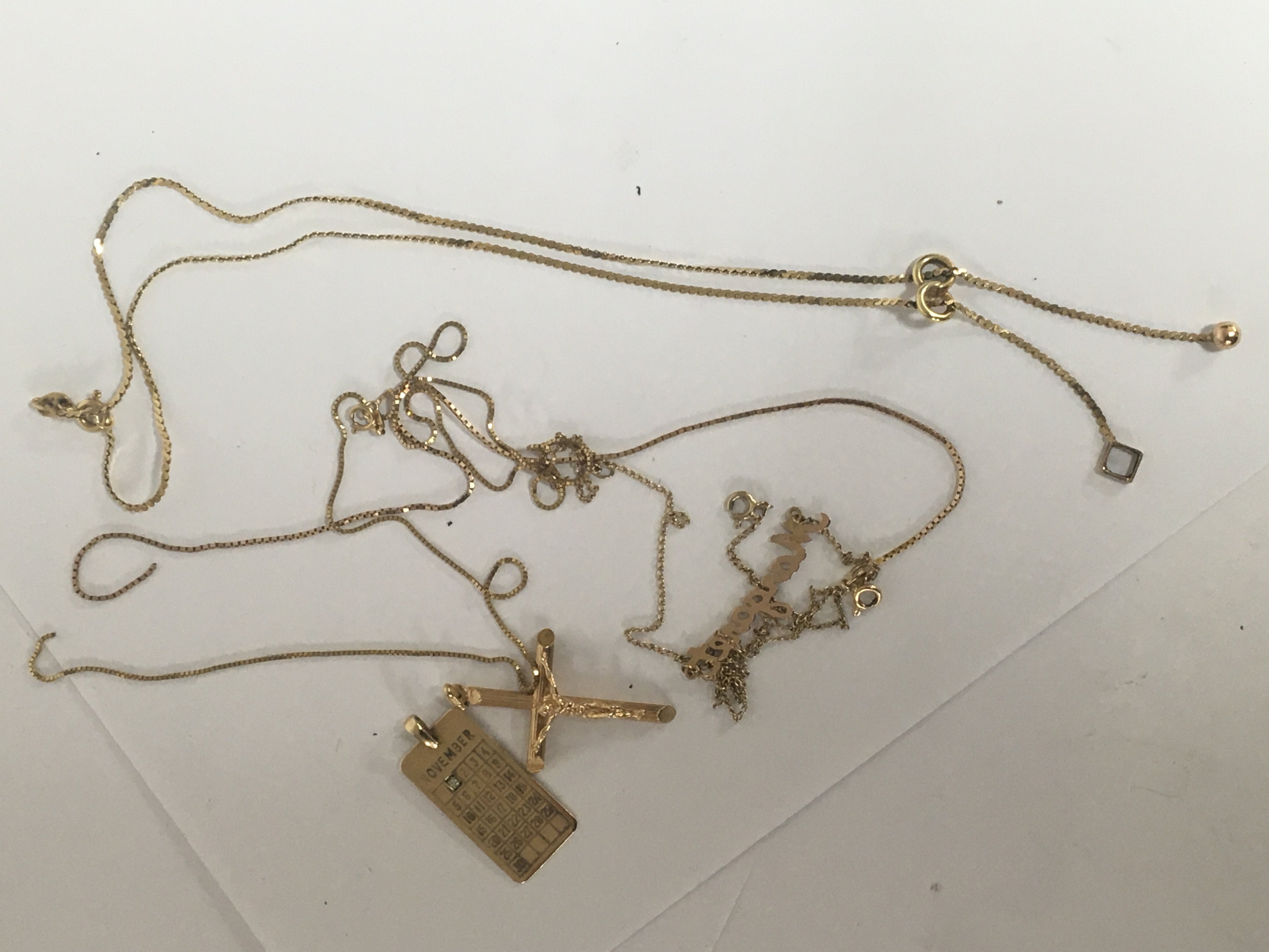 A collection of 9carat gold jewellery necklace a pendent cross pendant. necklaces Weight 14g