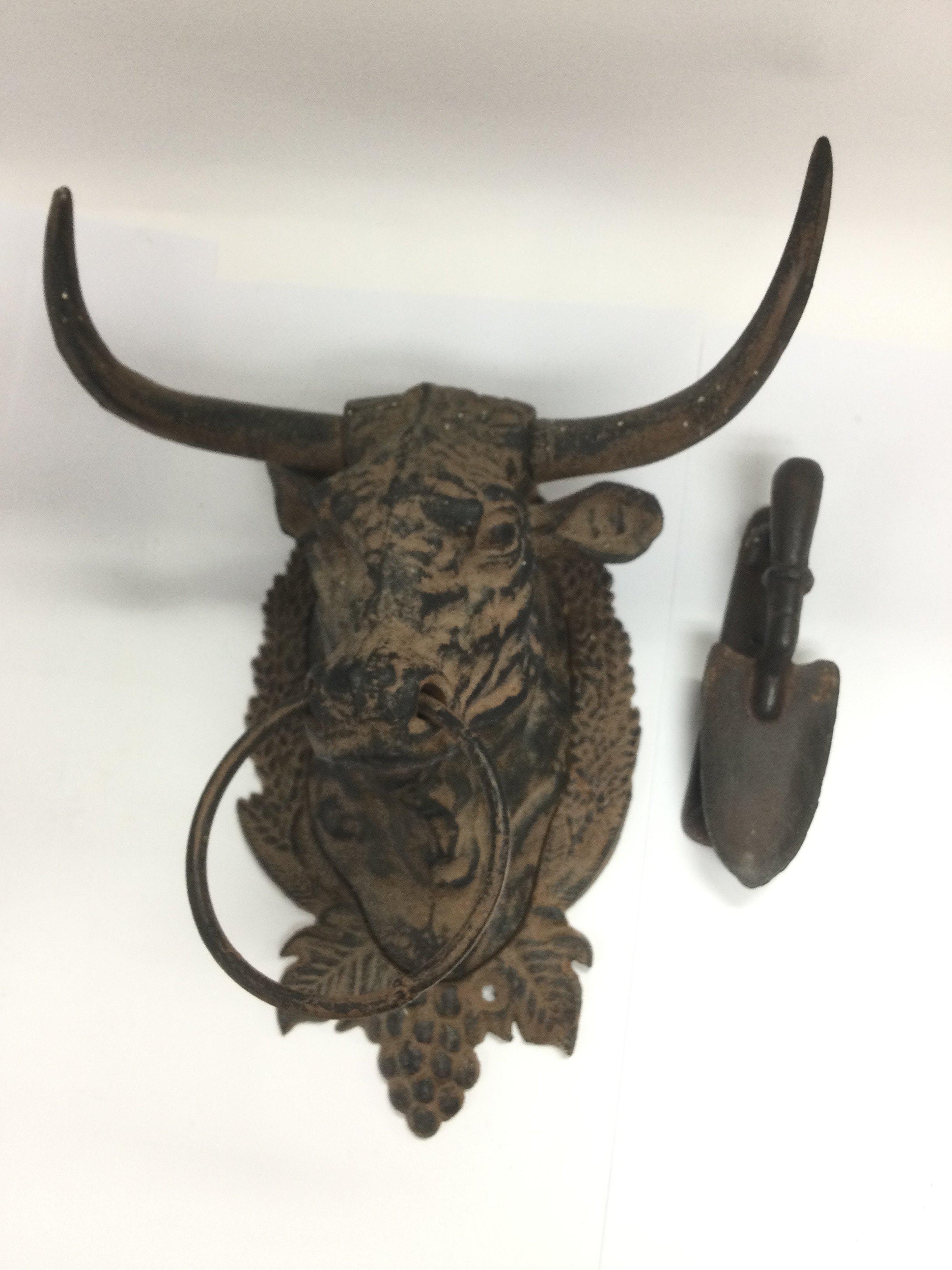 A cast metal wall mounted bull's head and a novelty door knocker in the form of a trowel (2). Shipping category D.