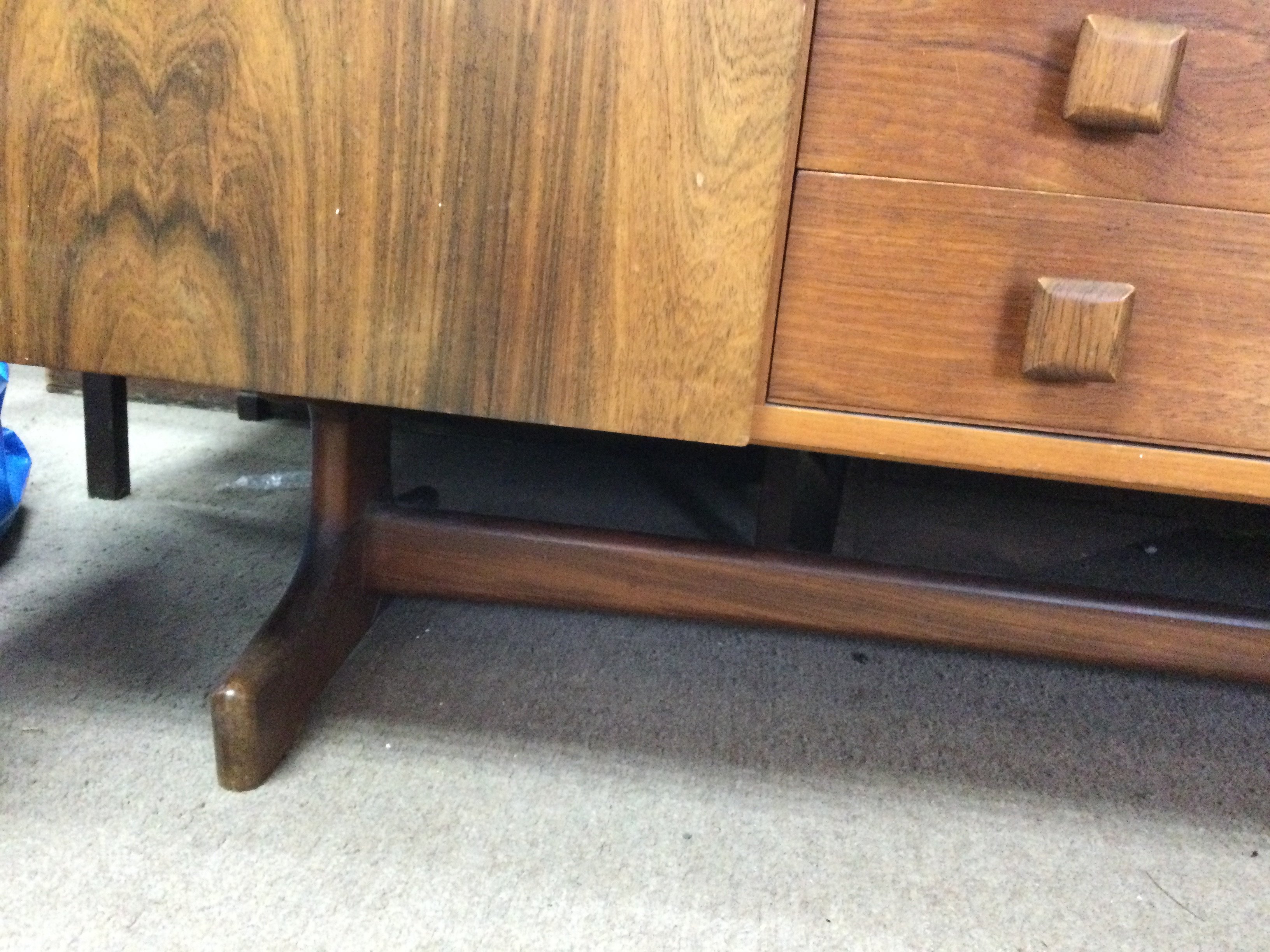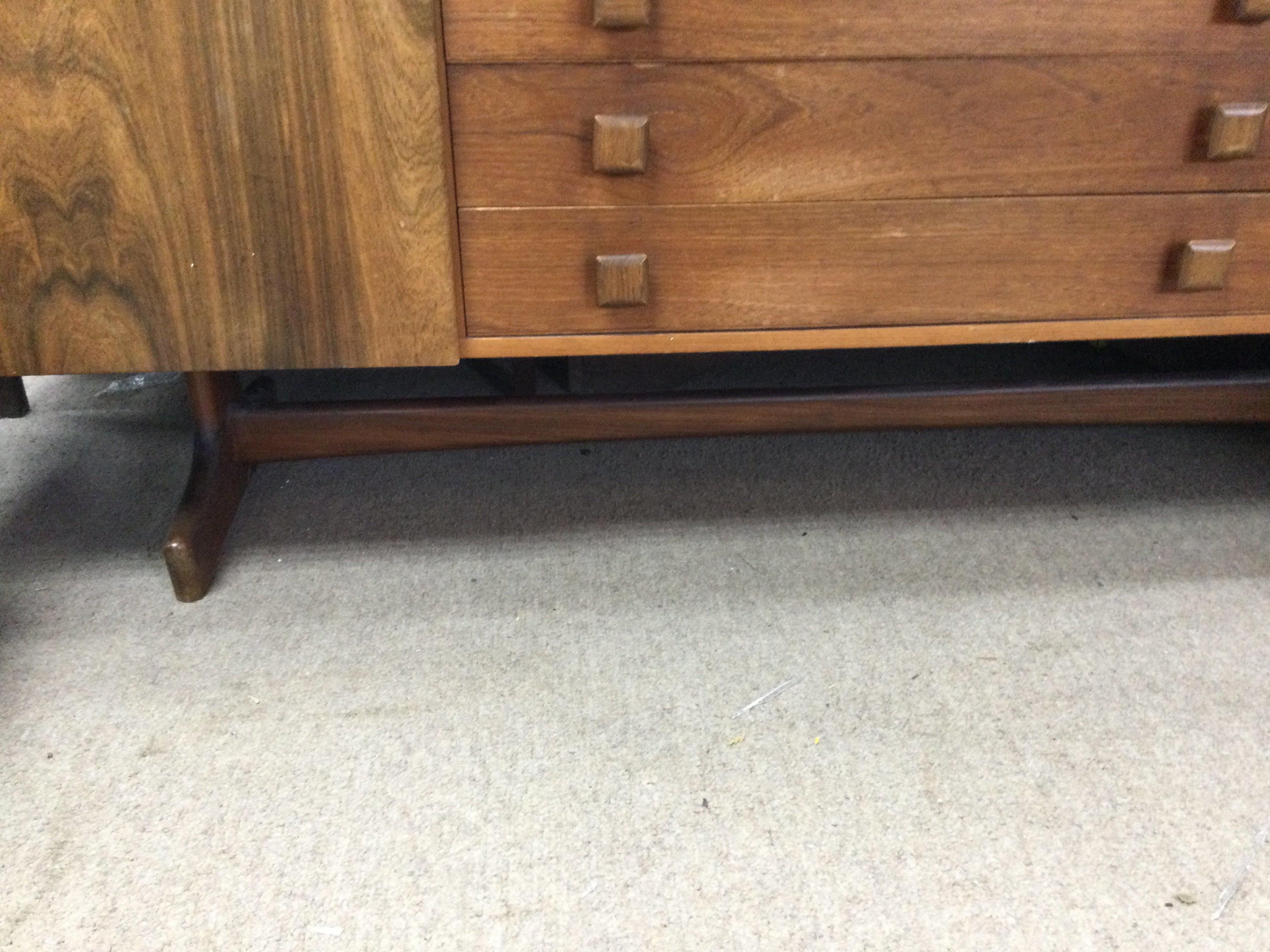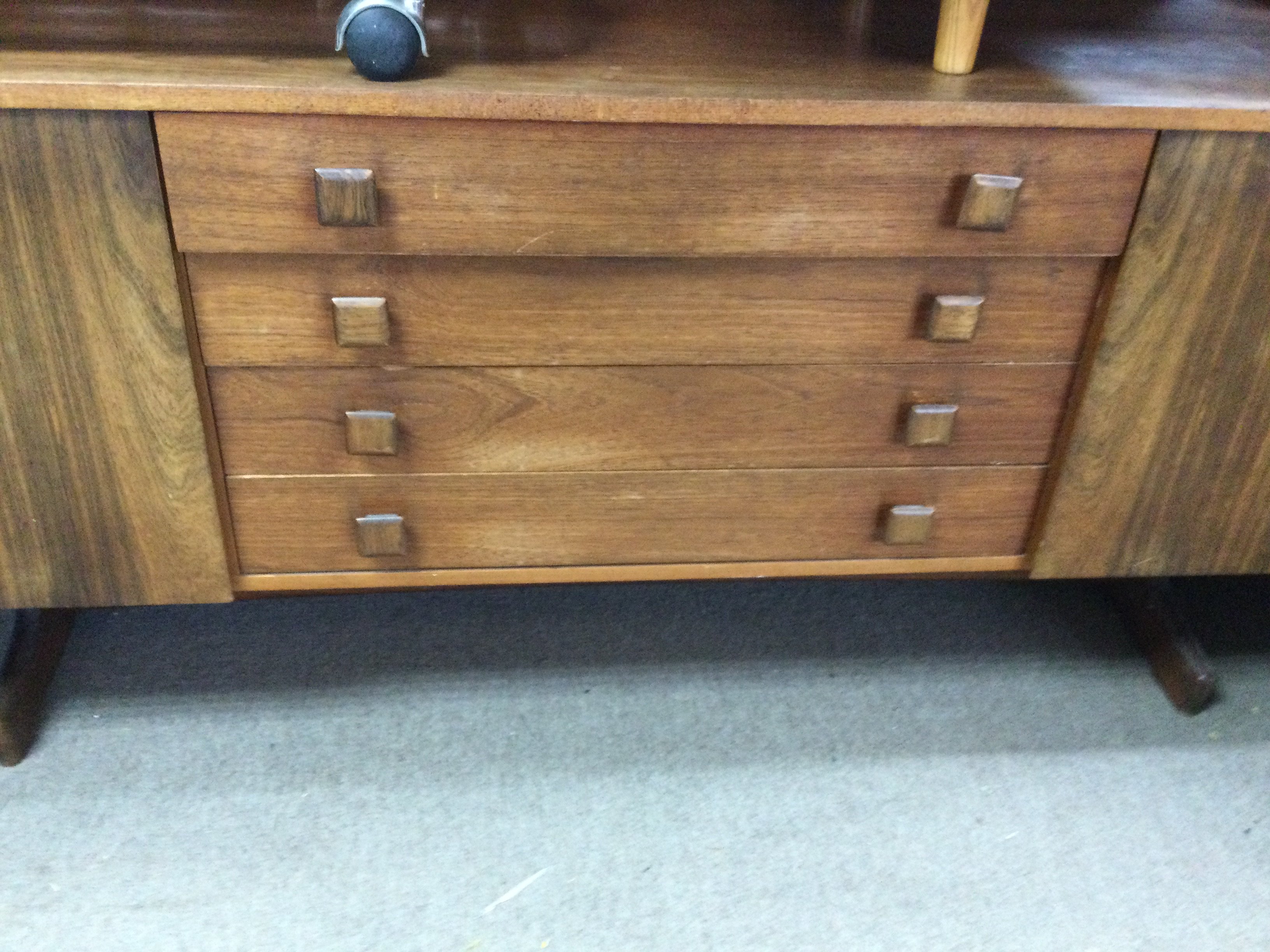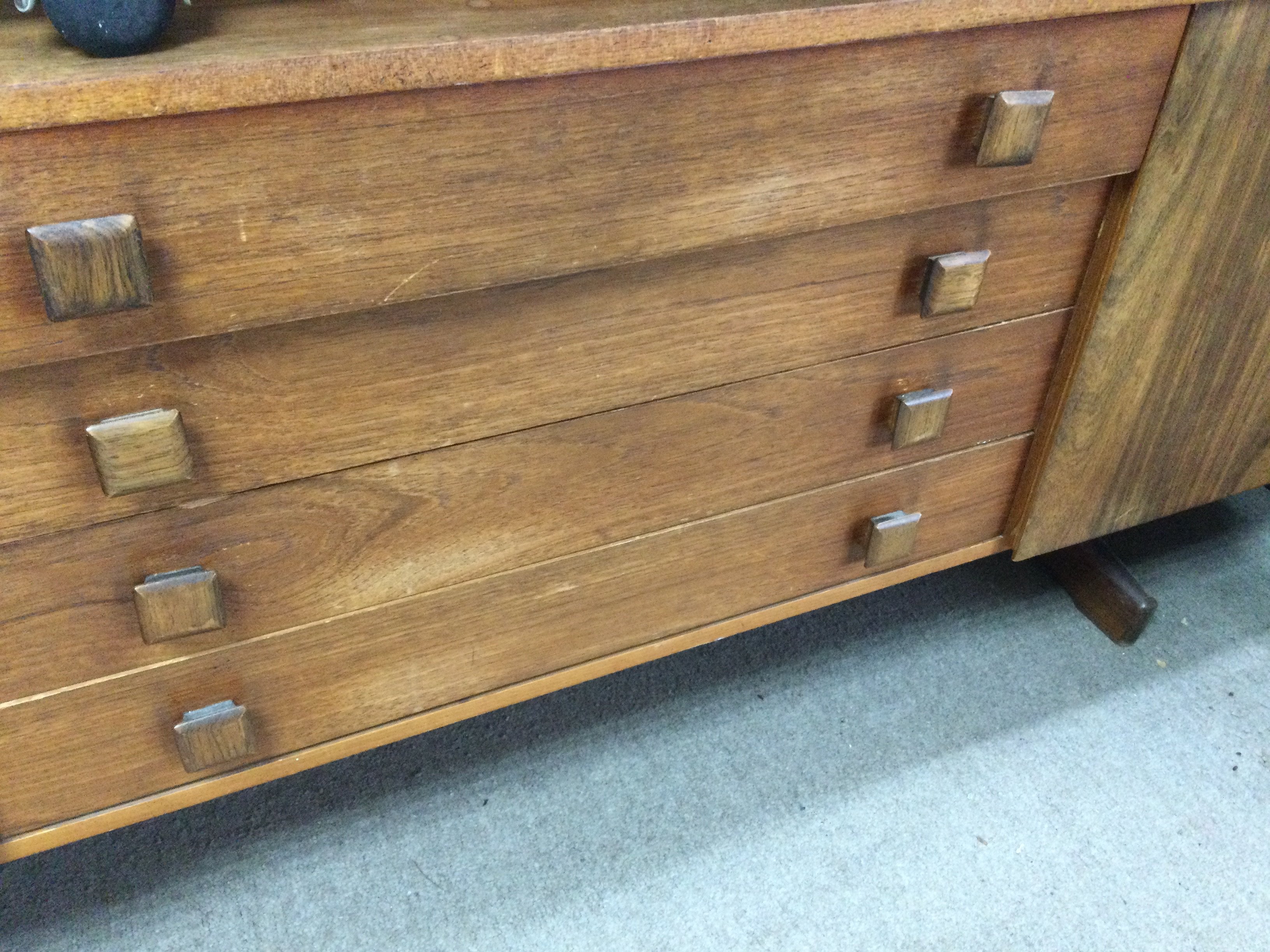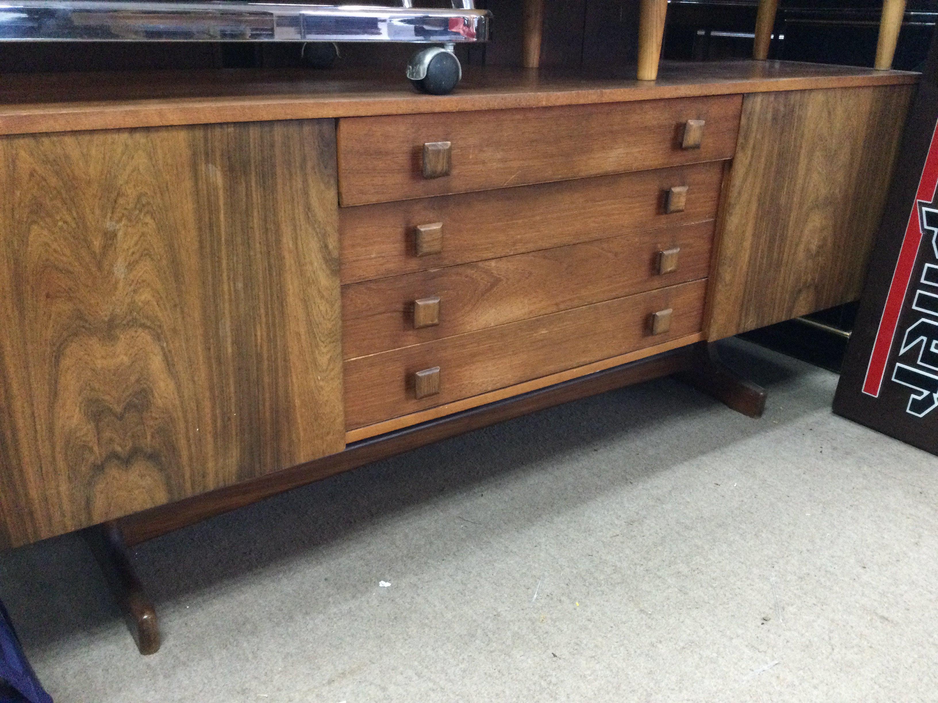 A Morden design sideboard the rectangular top above four drawers flanked by cupboards on shaped legs United by a under stretcher. With applied label Vanson . 6.2 ft 1.5 ft