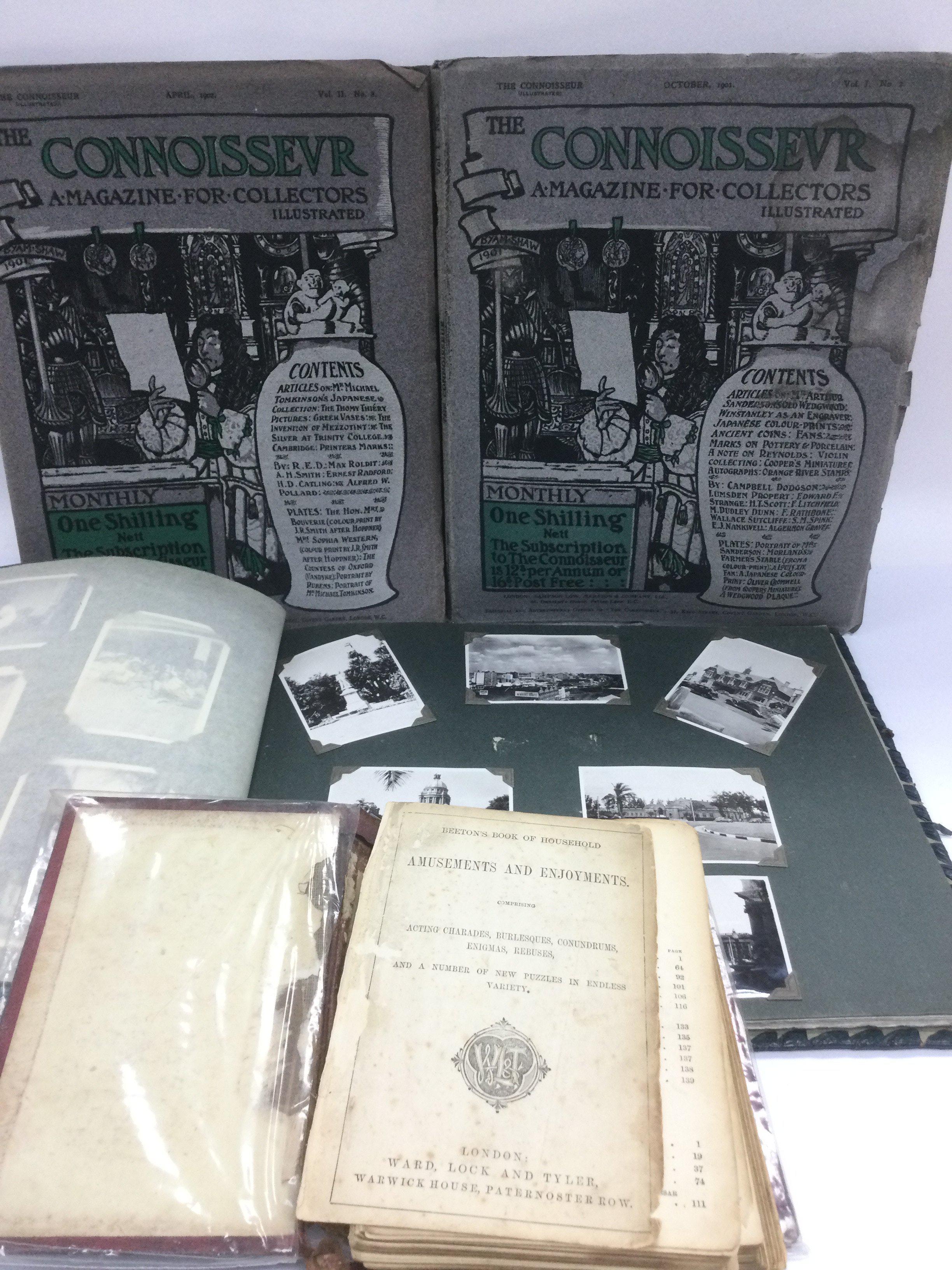 A box of Edwardian Connoisseur magazines, a photograph album and a Mrs Beeton book of household amusements and enjoyments. Shipping category C.