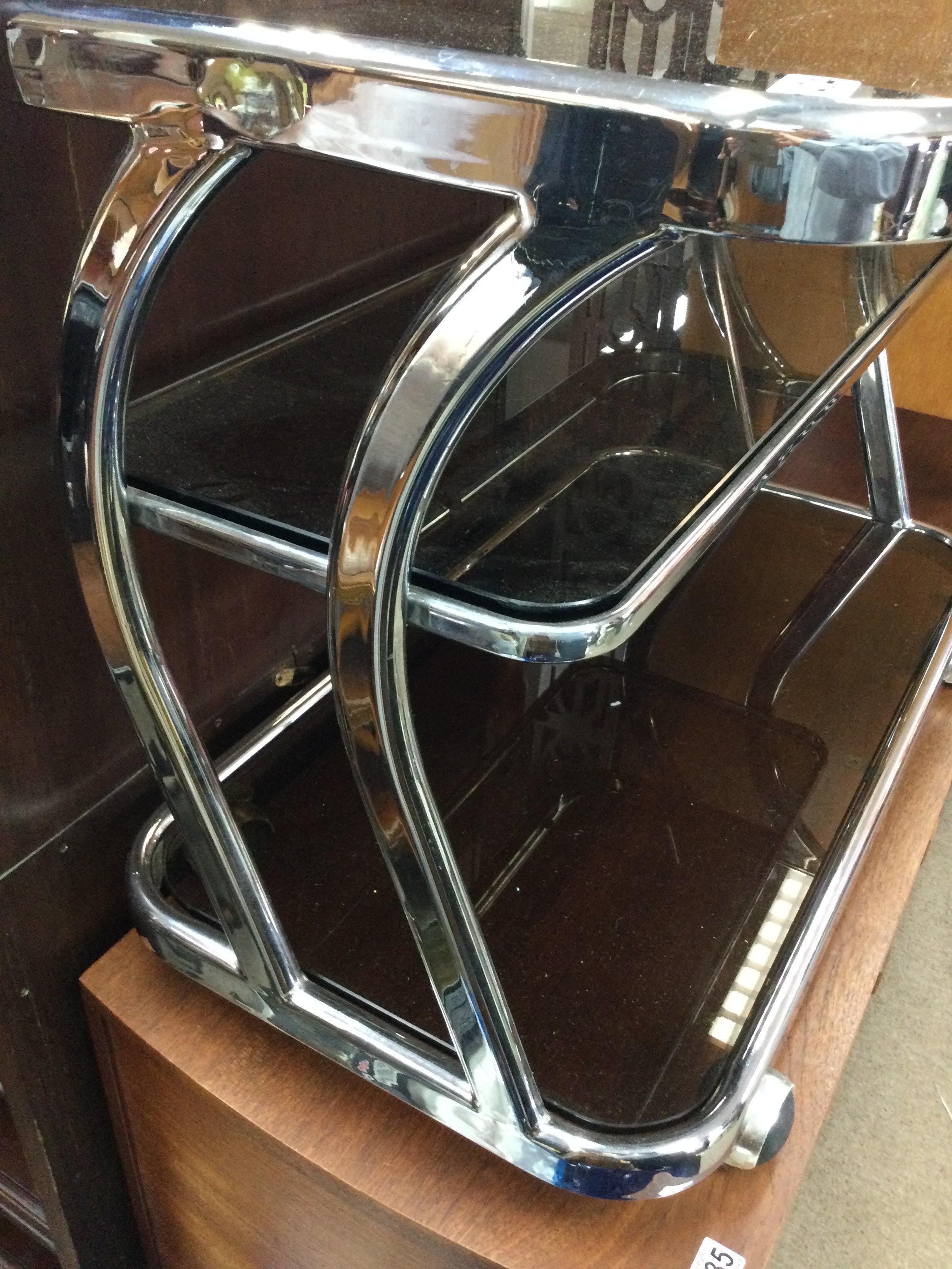 A three tier chrome trolley inset with glass tops on casters . 83cm x 44 cm .