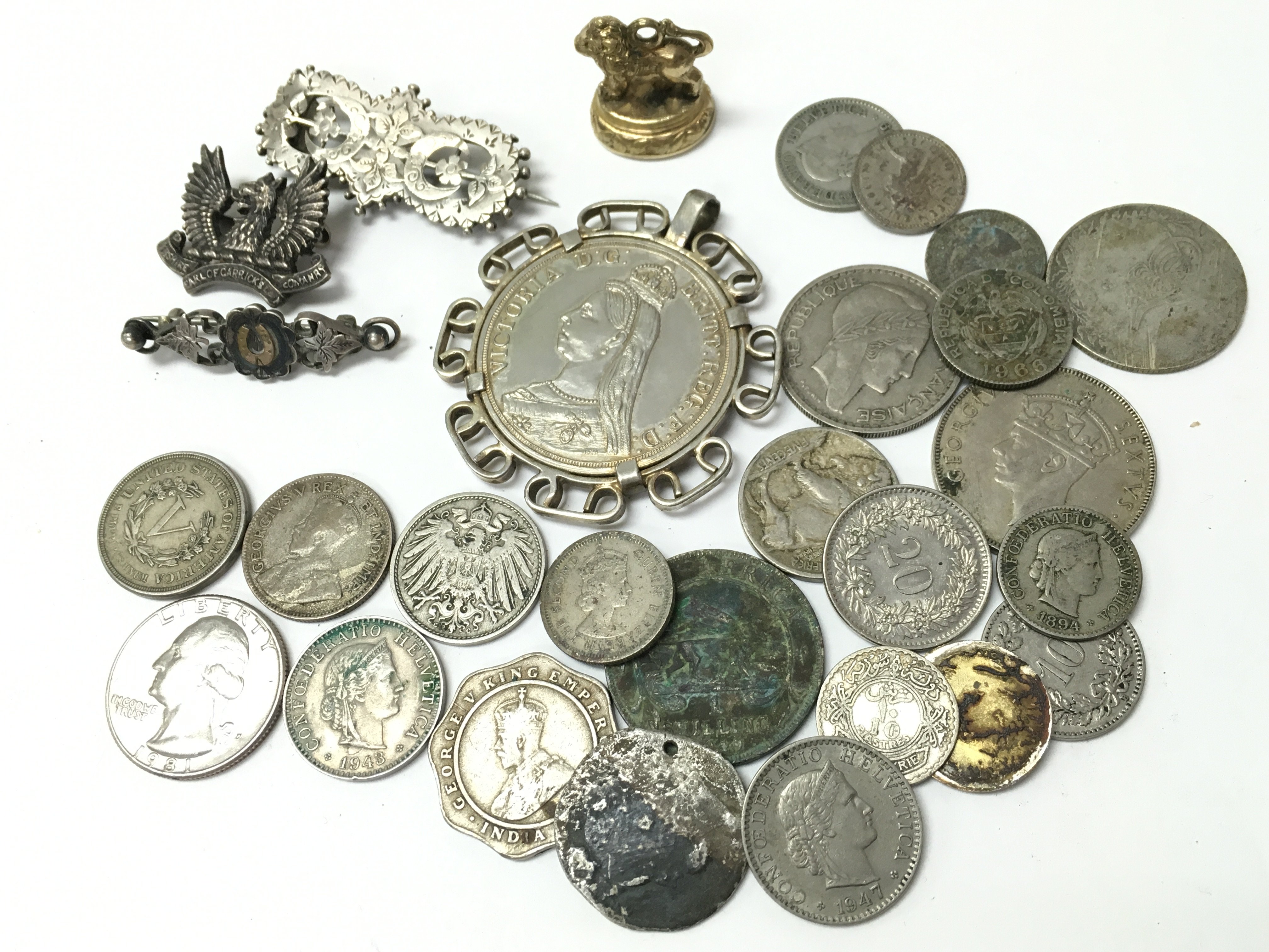 A collection of british and world coins including an 1887 mounted crown and pins including a silver hallmarked example. Postage category a