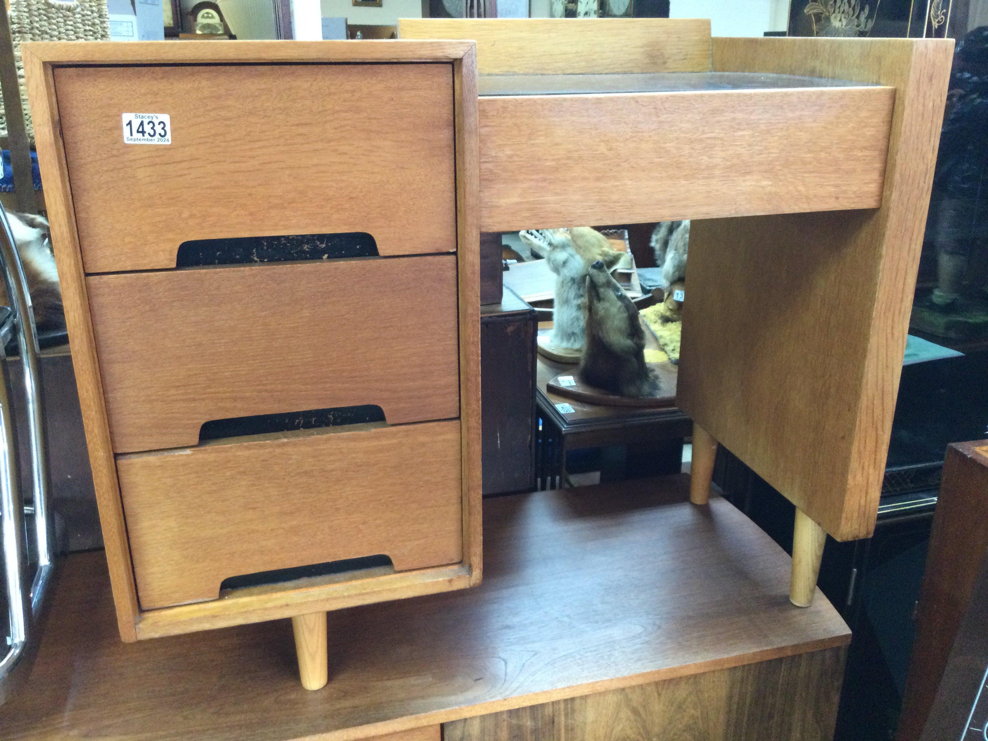 A small teak kneehole desk fitted with three drawers on turned legs . 45 cm x 88 cm