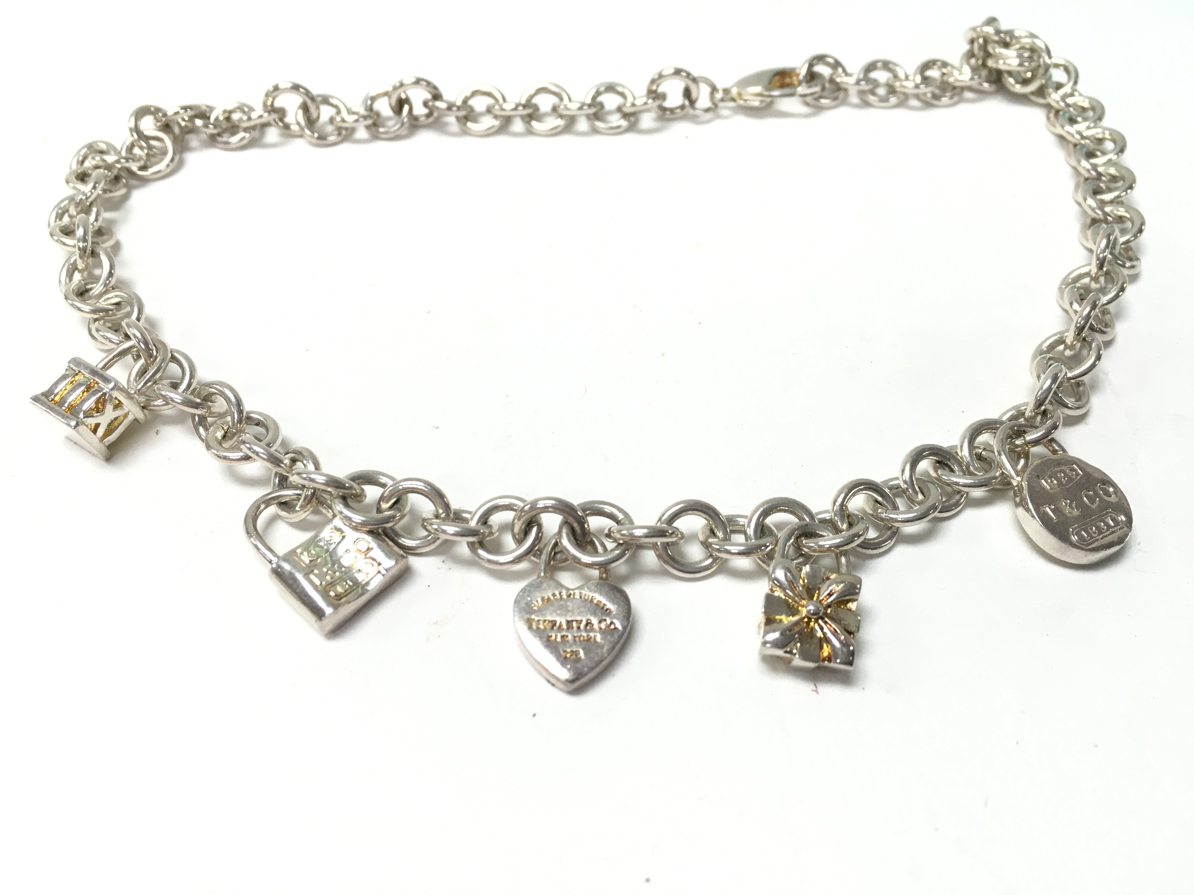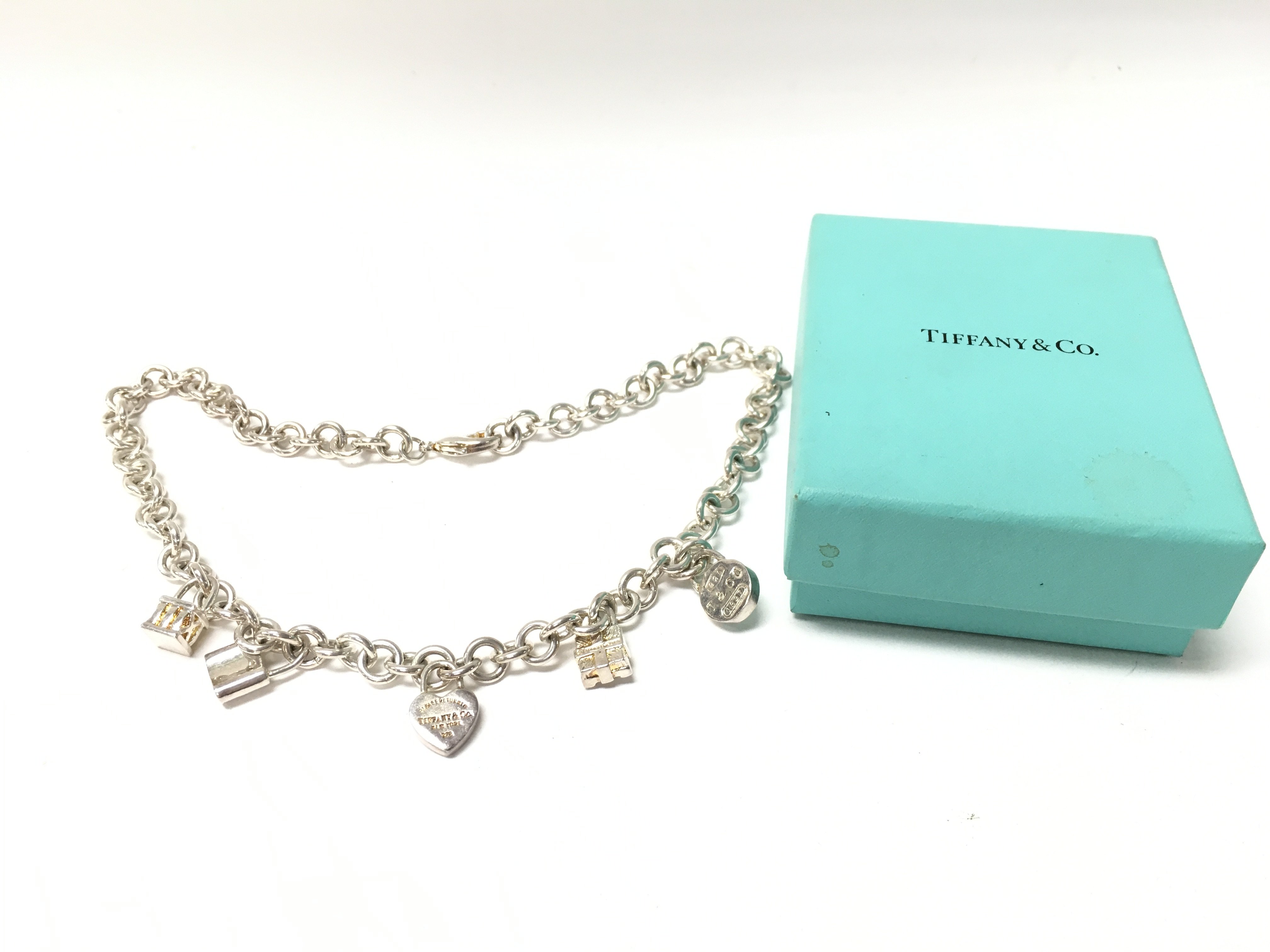 A boxed silver charm necklace marked Tiffany. Postage category a