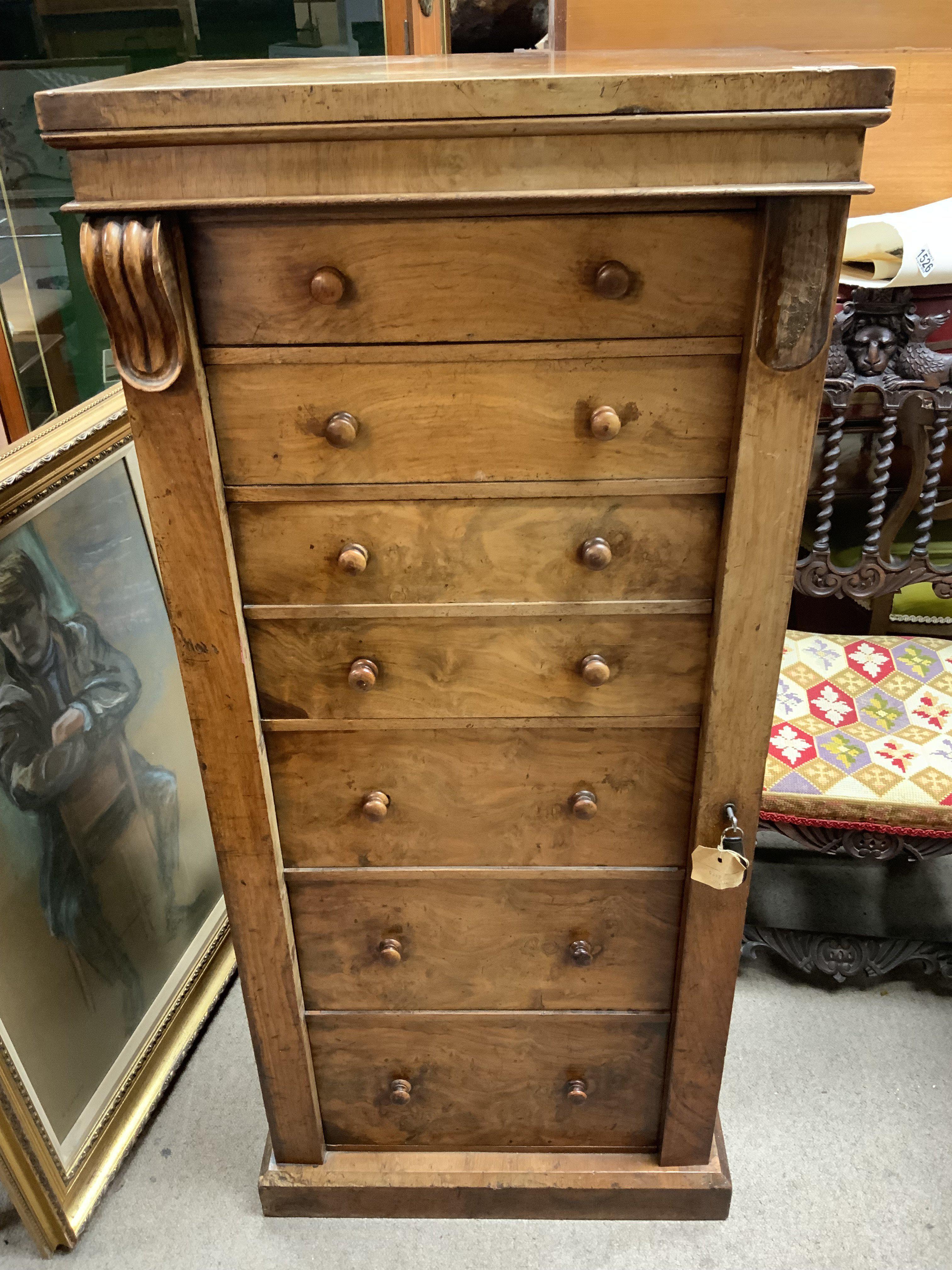 A large mahogany veneered wellington chest of drawers. 127cm x 55cm x 39cm.