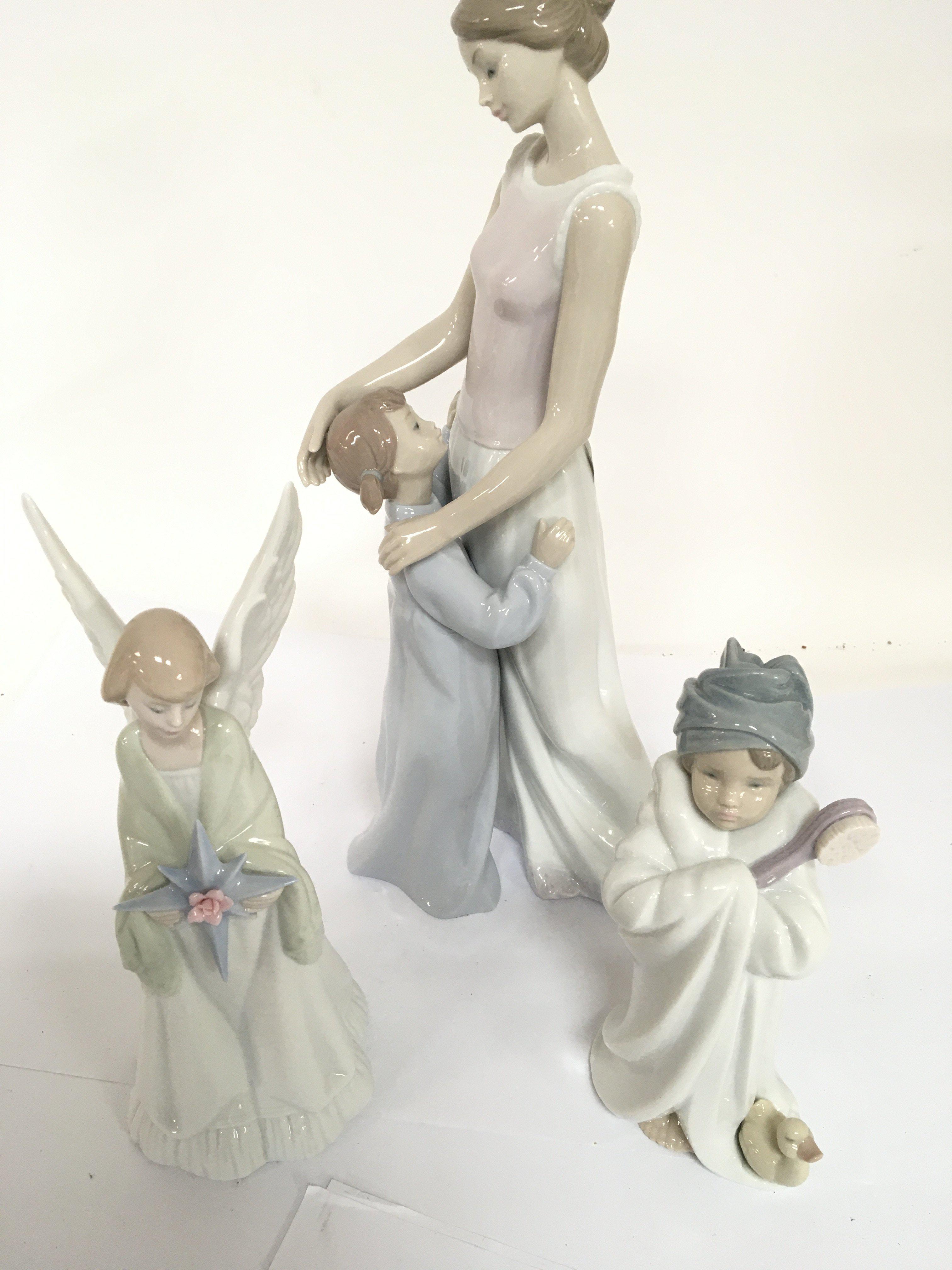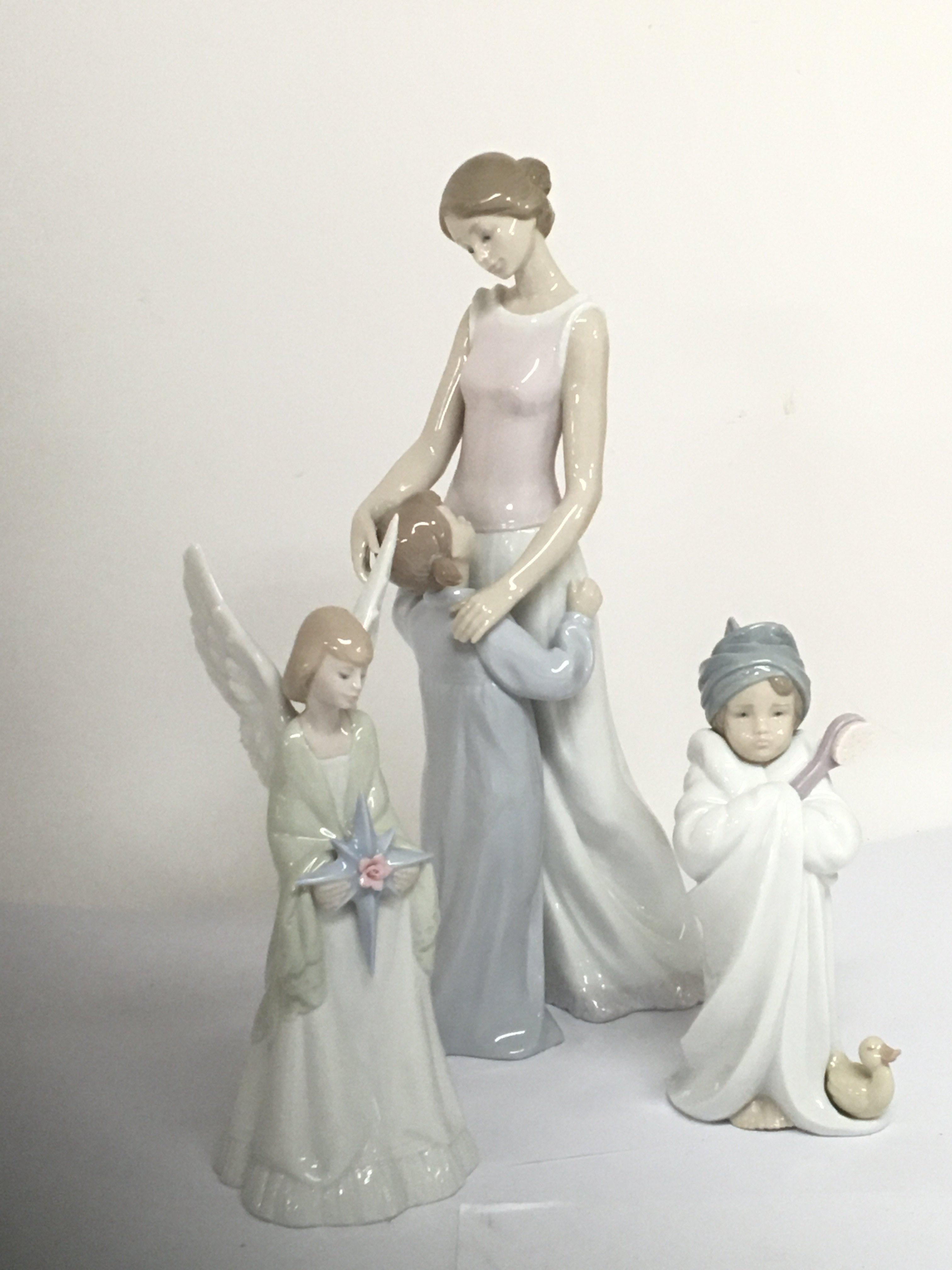 Three Lladro figures a large figure group of a mother and child Hight 36cm an angle holding a star and bed time bath a figure of a child with small duck at foot no obvious damage.