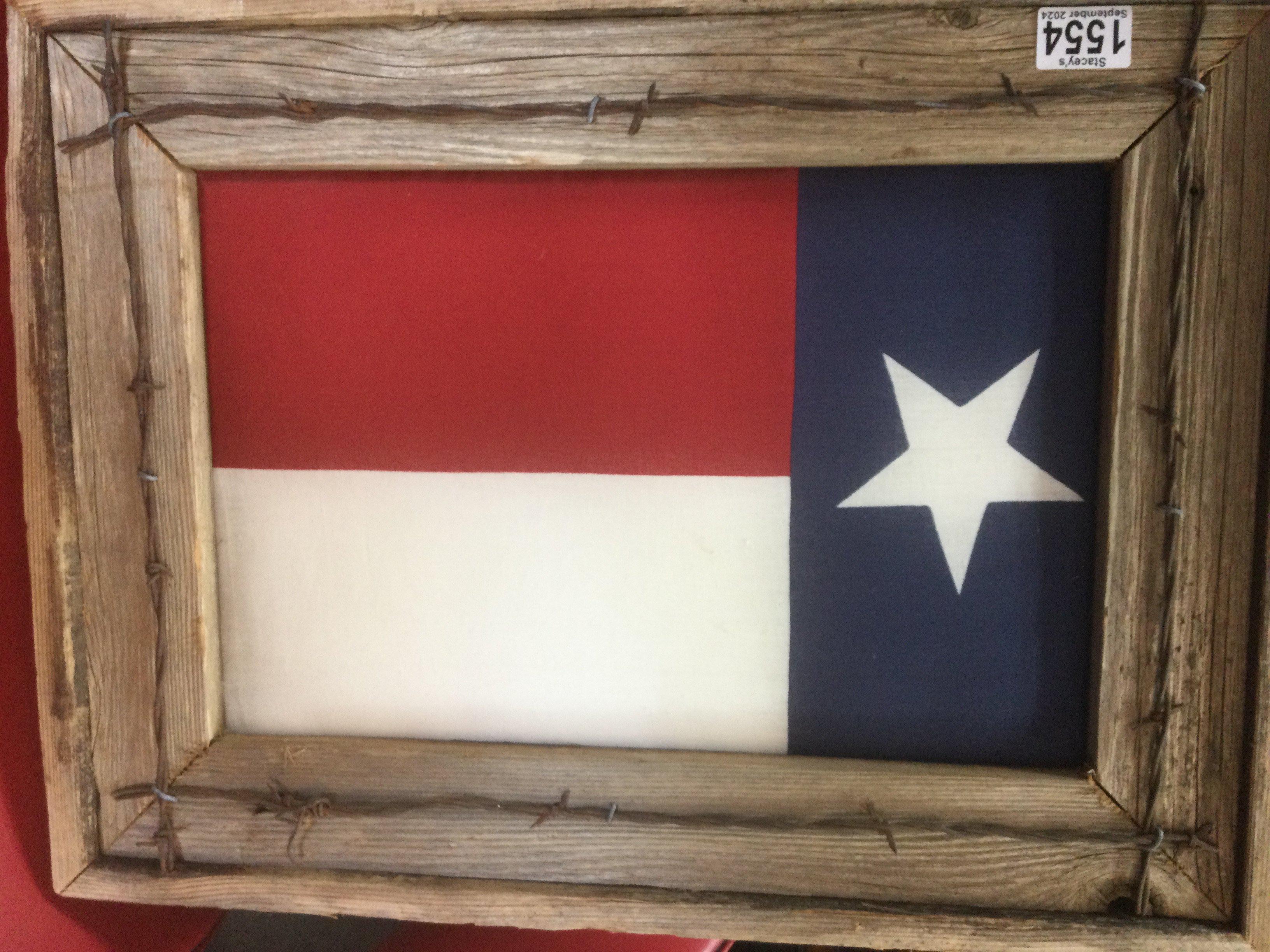 Texas’s cloth flag in pine frame surrounded by barb wire ,