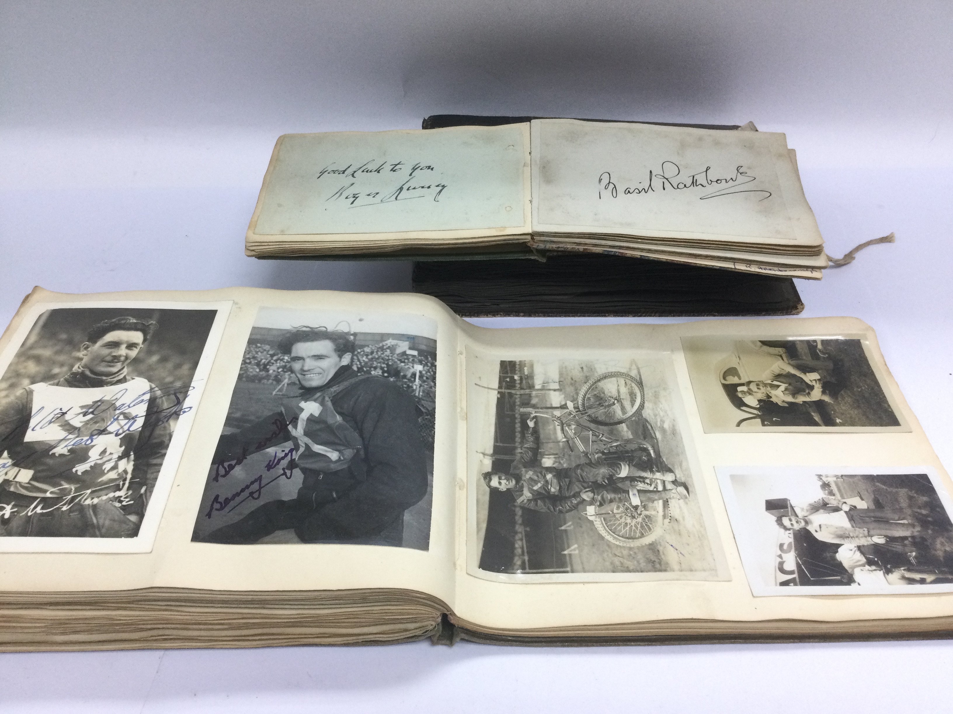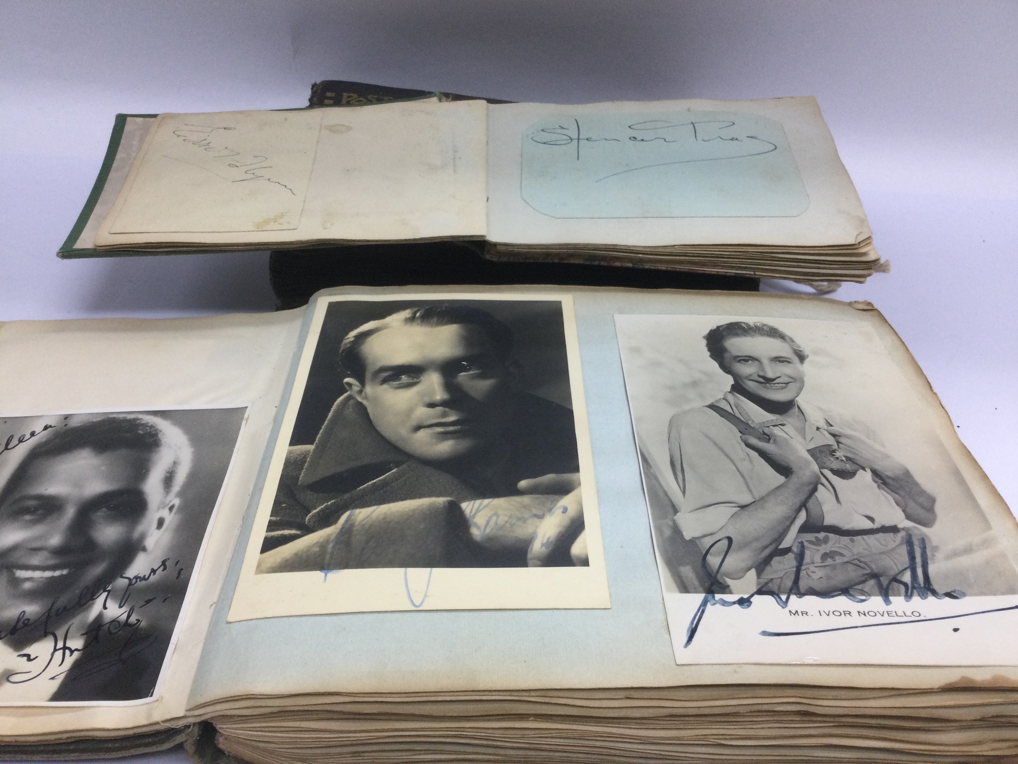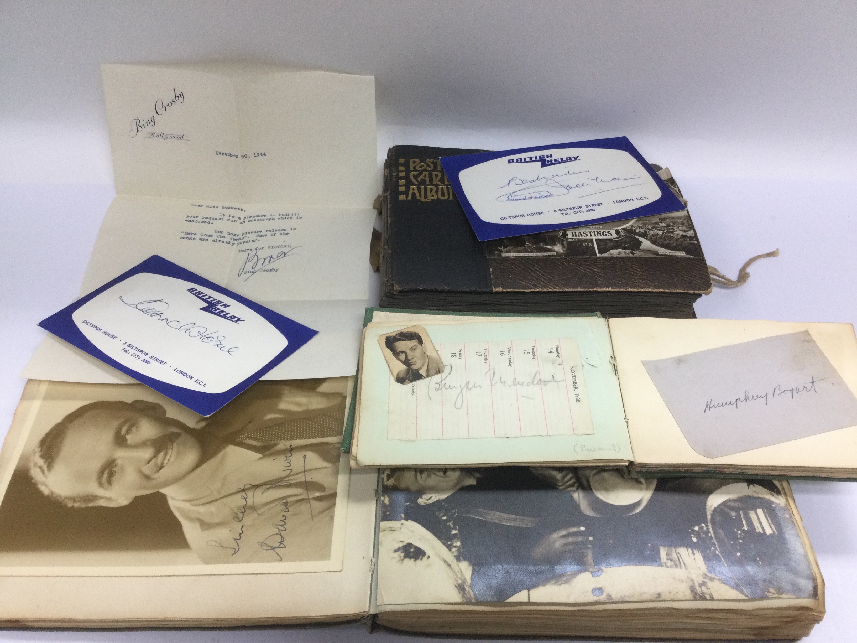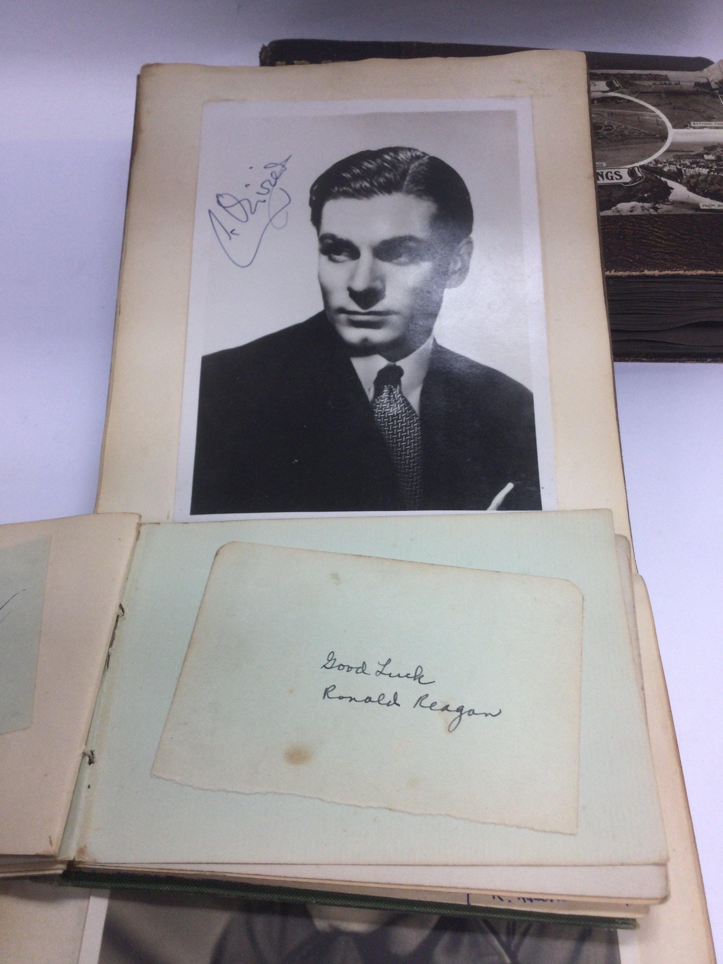 Two autograph booklets and a vintage postcard album. Names include Laurence Olivier, David Niven, Humphrey Bogart, Ronald Reagan and many more. Shipping category B.
