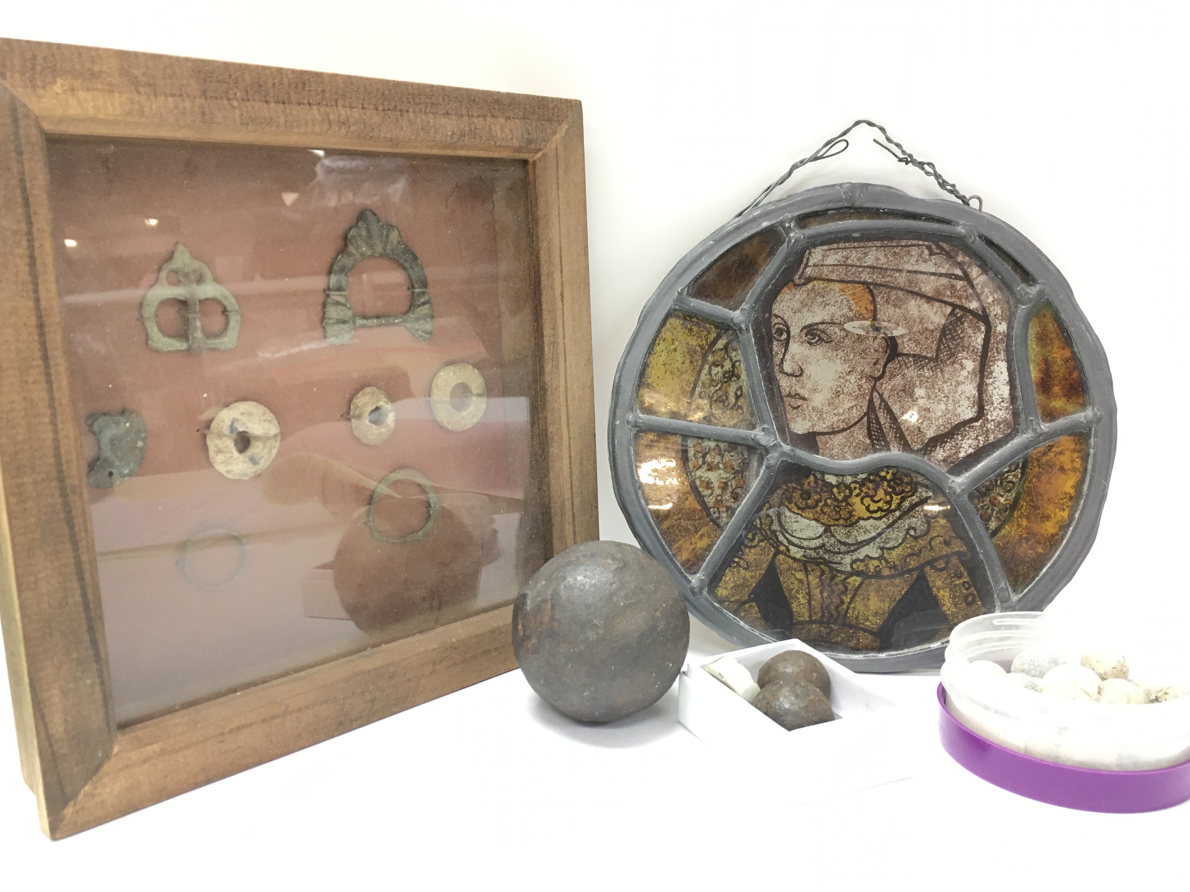 An assortment of Medieval and 17th century items including a panel of a medieval lady