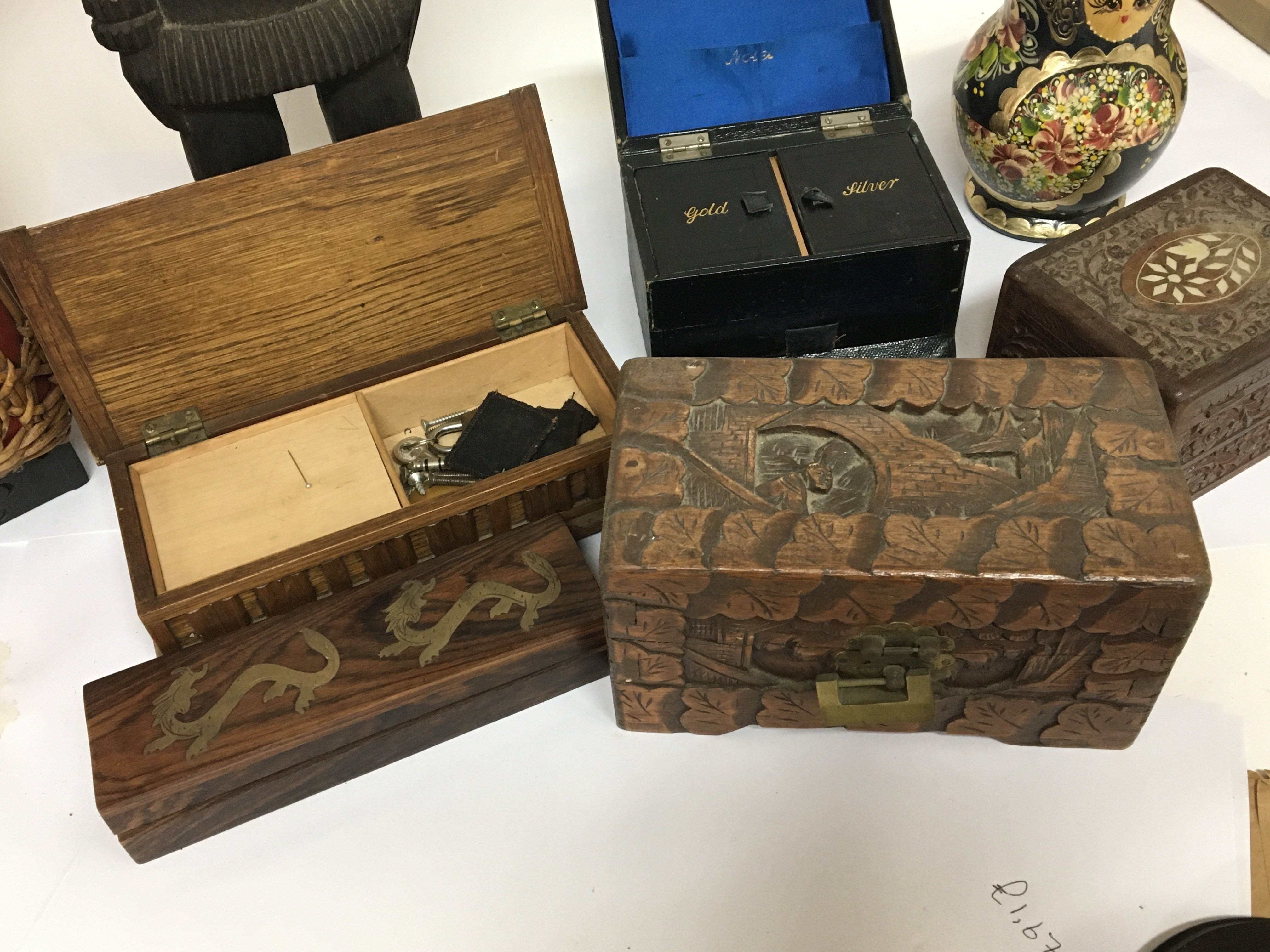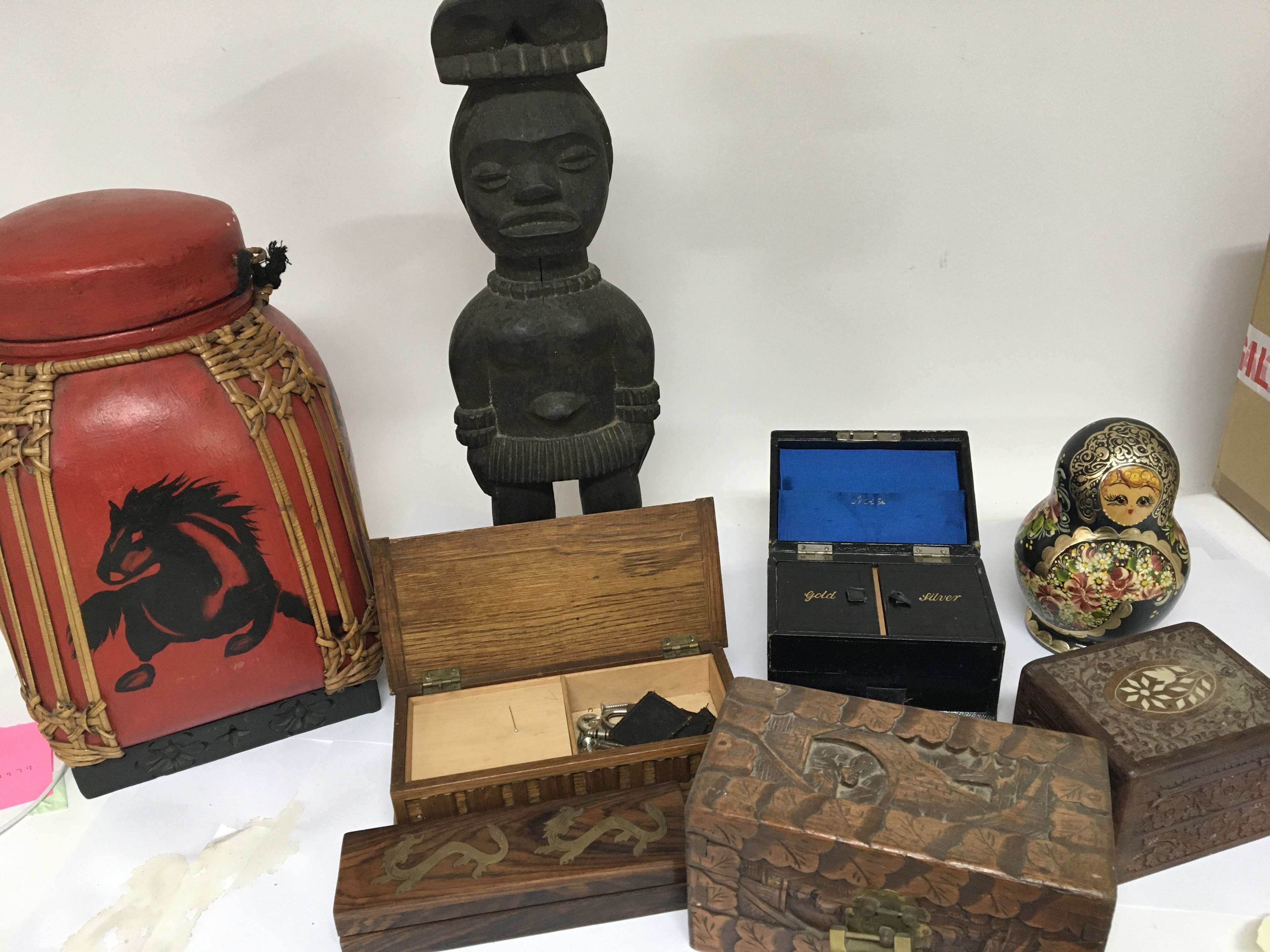 A carved hardwood tribal figure carved wood boxes a leather jewellery box and Russian doll and other items.