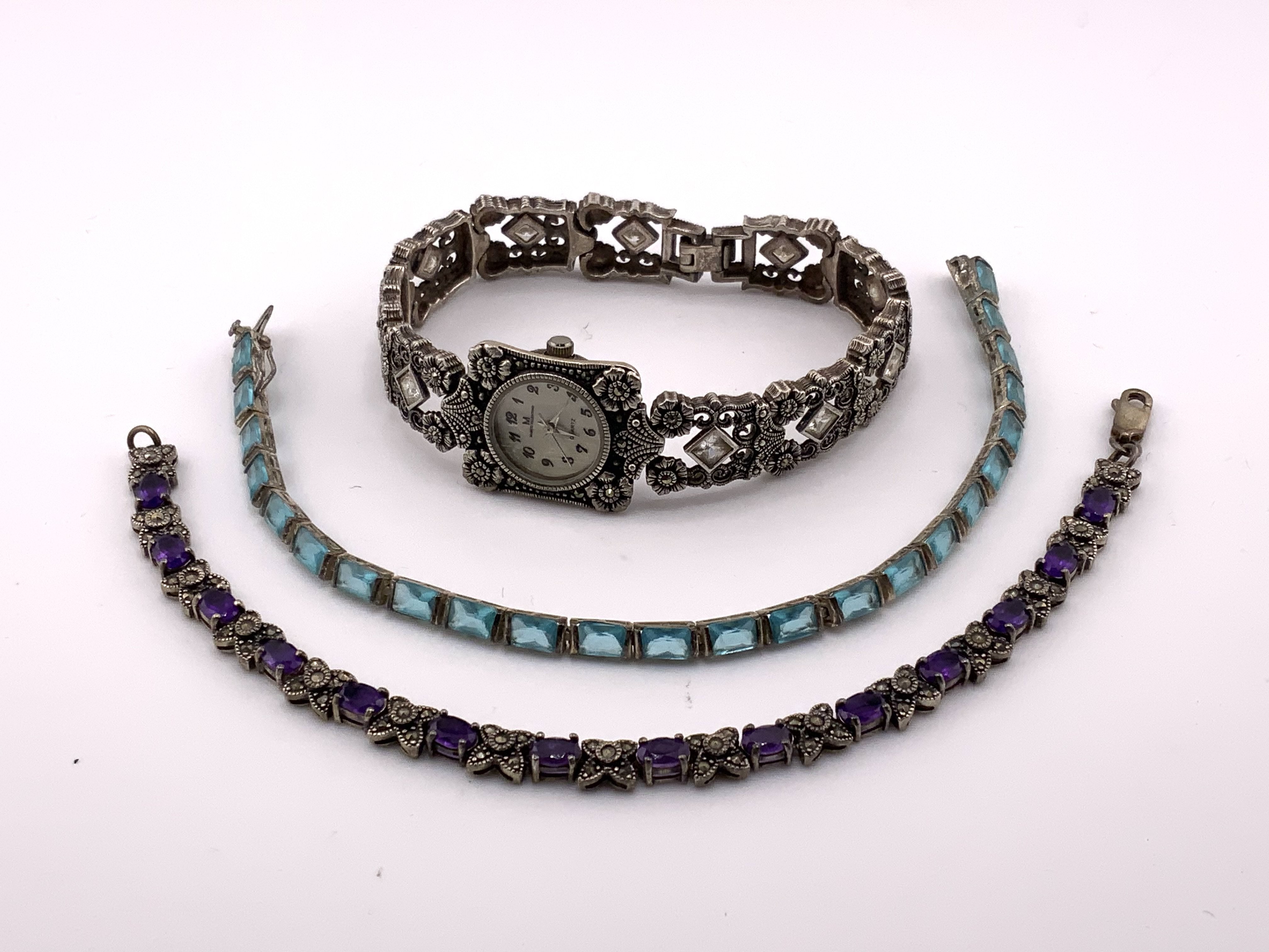 A Silver and marcasite ladies wristwatch together with 2 silver and stone set line bracelets. (A)