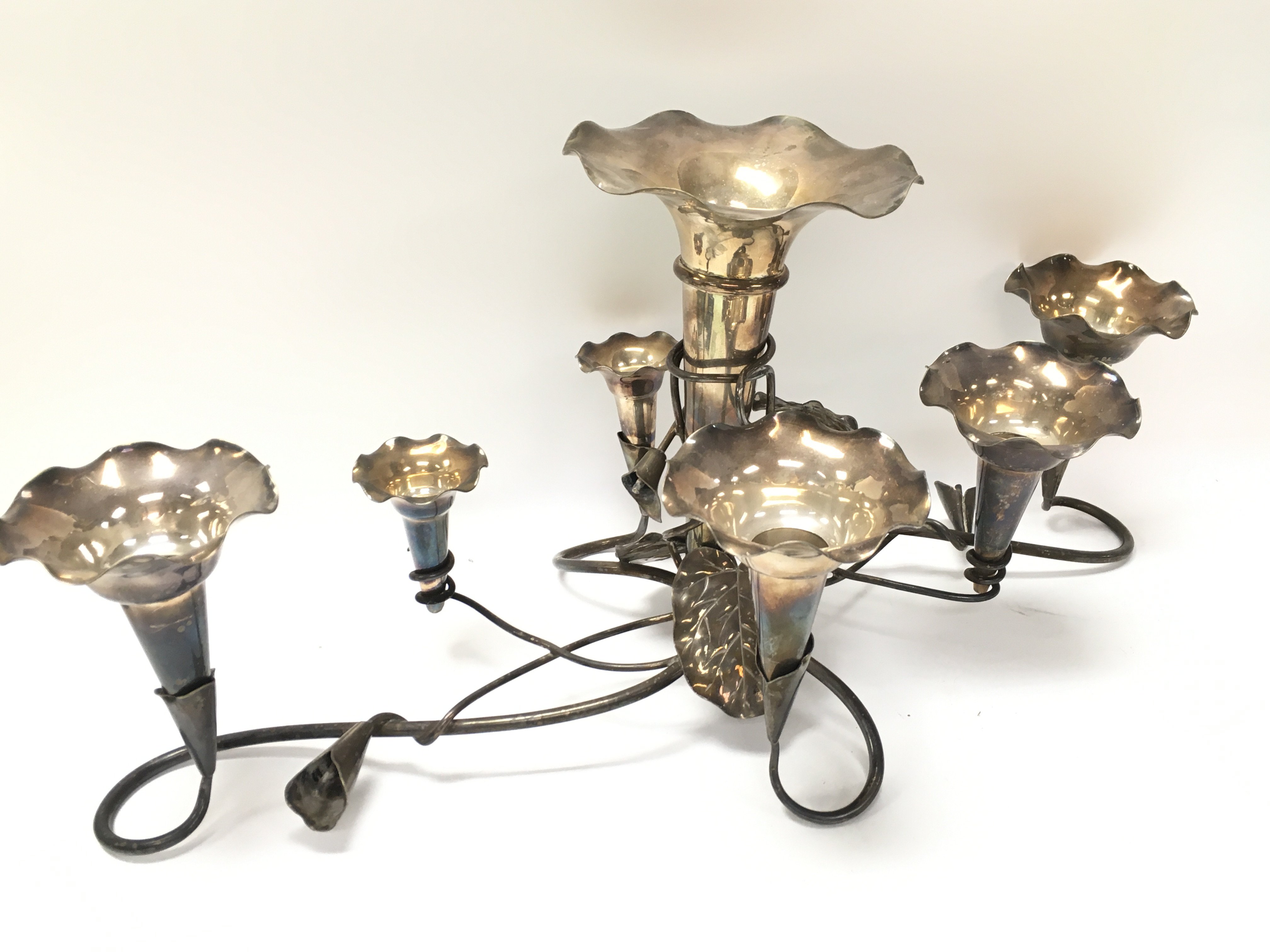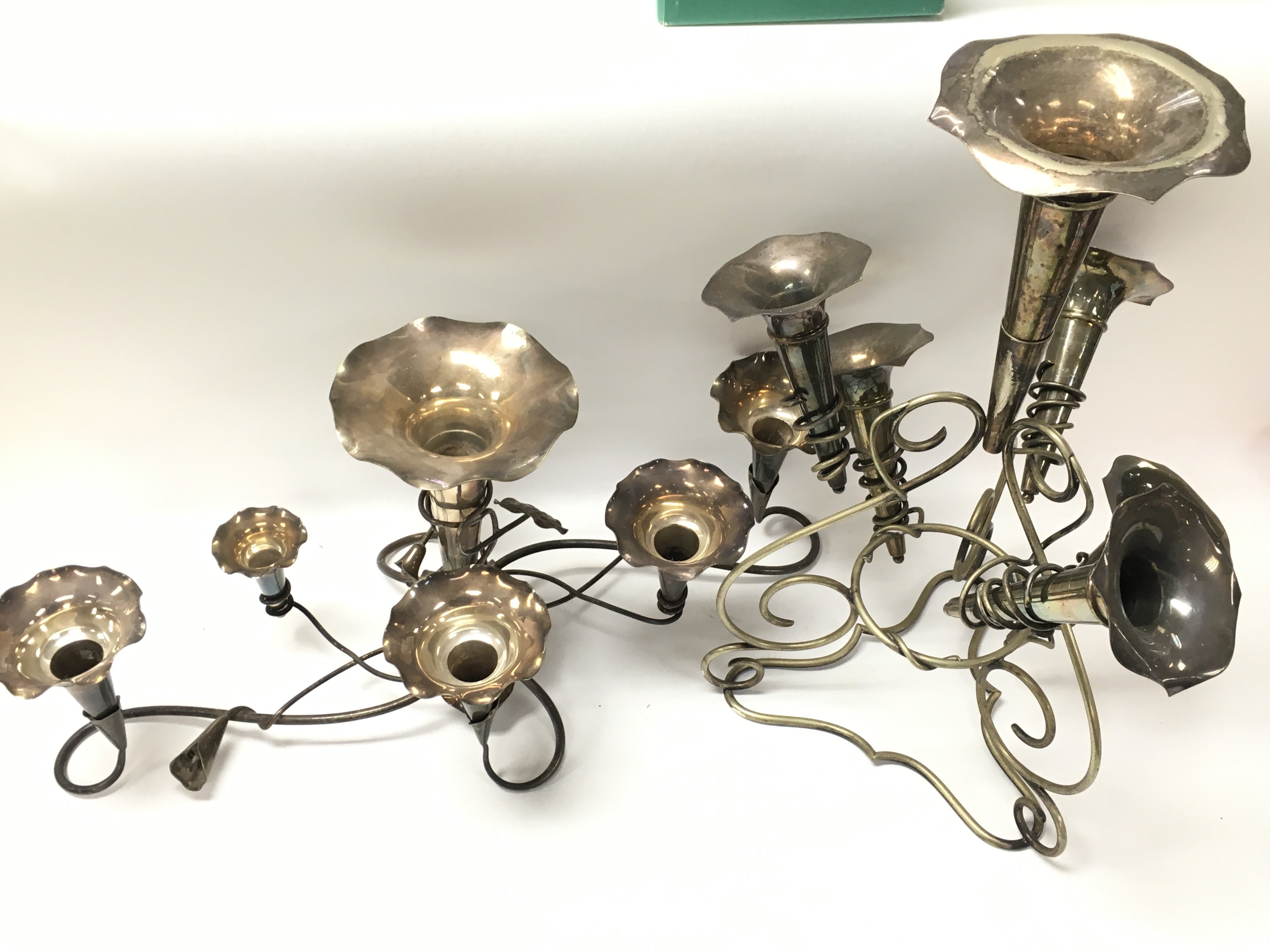 Silver plated table epergnes, one being a Mappin and Webb example. 24 and 44cm tall. Postage category C