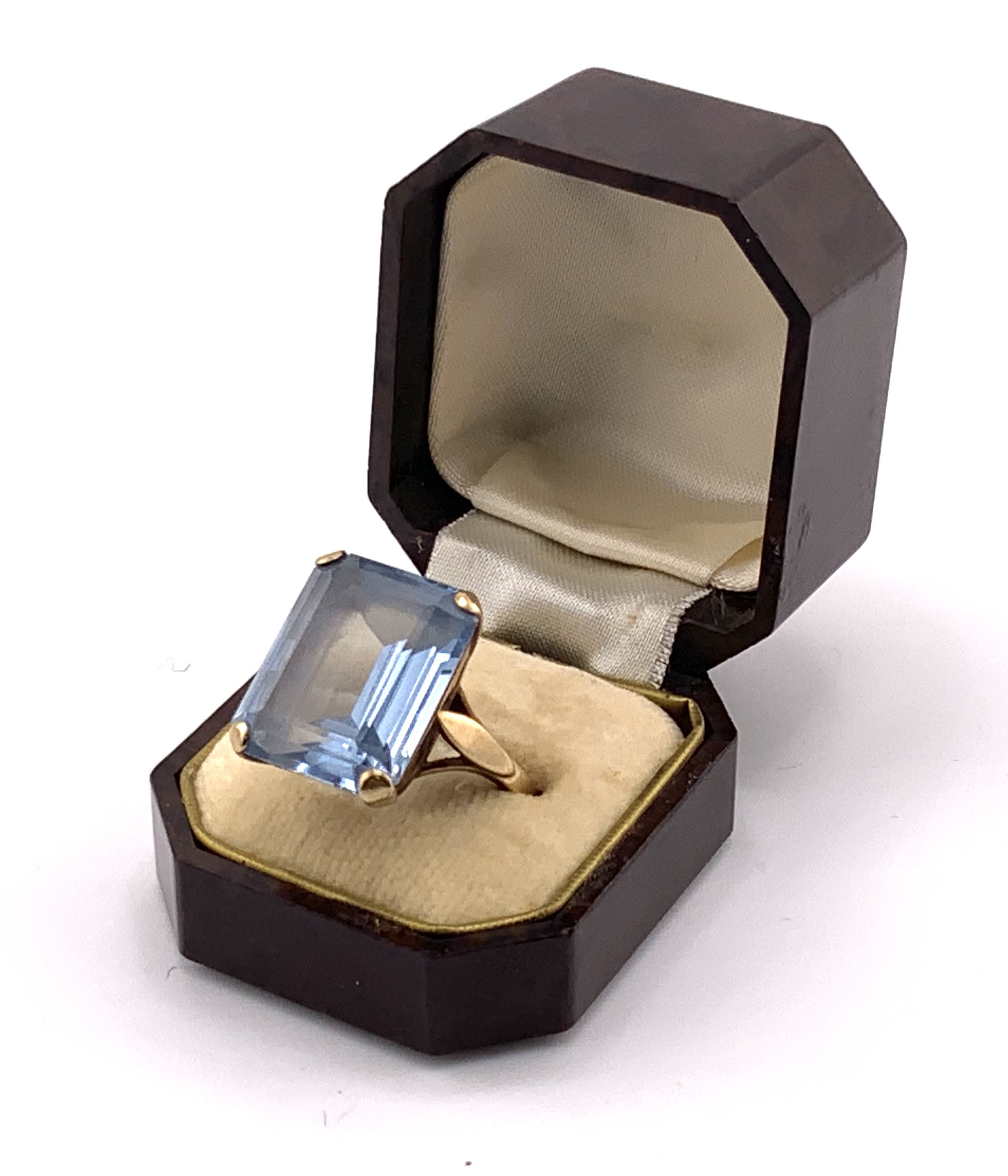 A 9ct gold and faceted blue stone dress ring. (Split shank), (A)