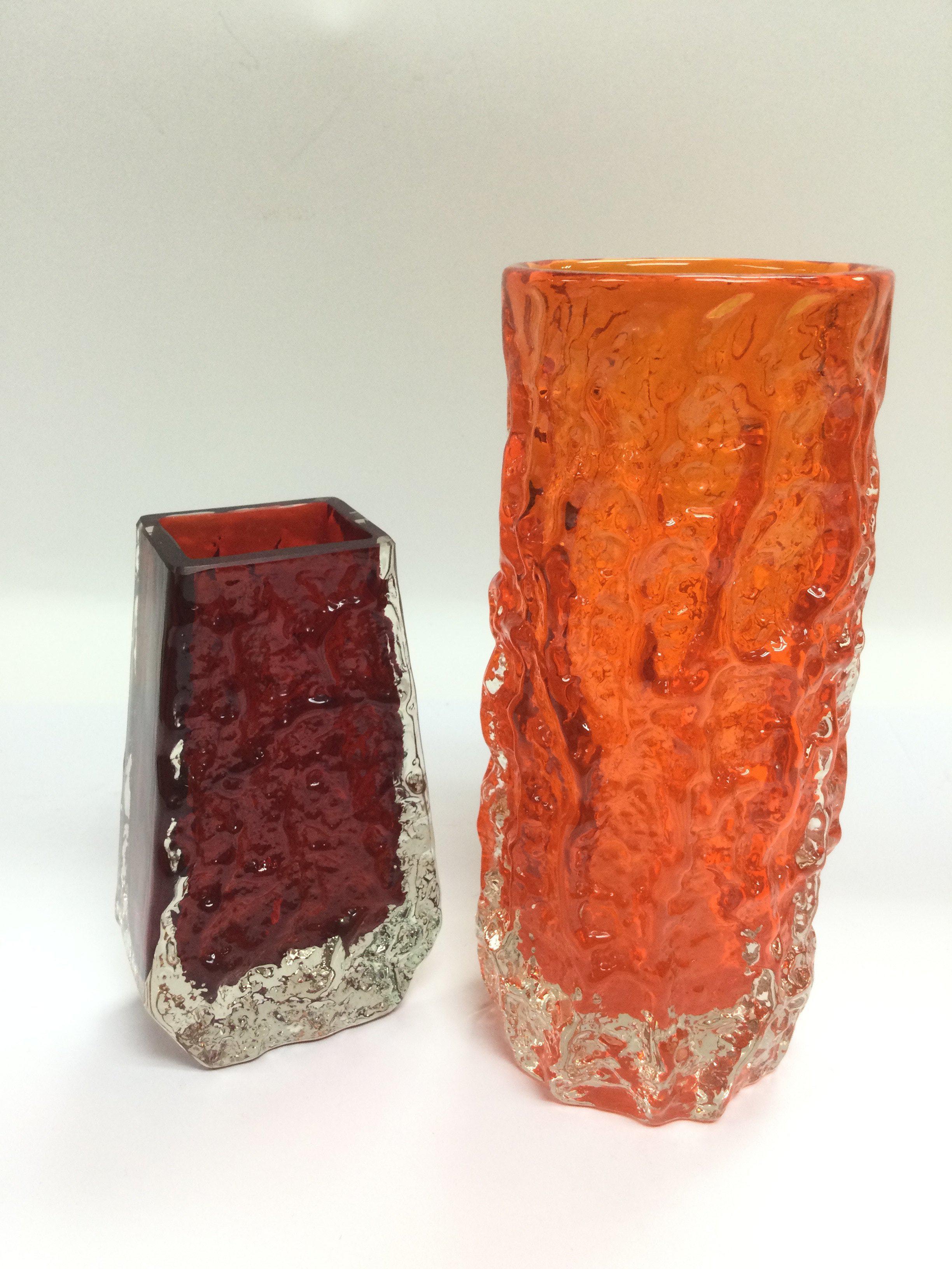 Two Whitefriars vases comprising a tangerine bark vase, approx 19cm and a smaller coffin vase, approx 13cm. Shipping category D.