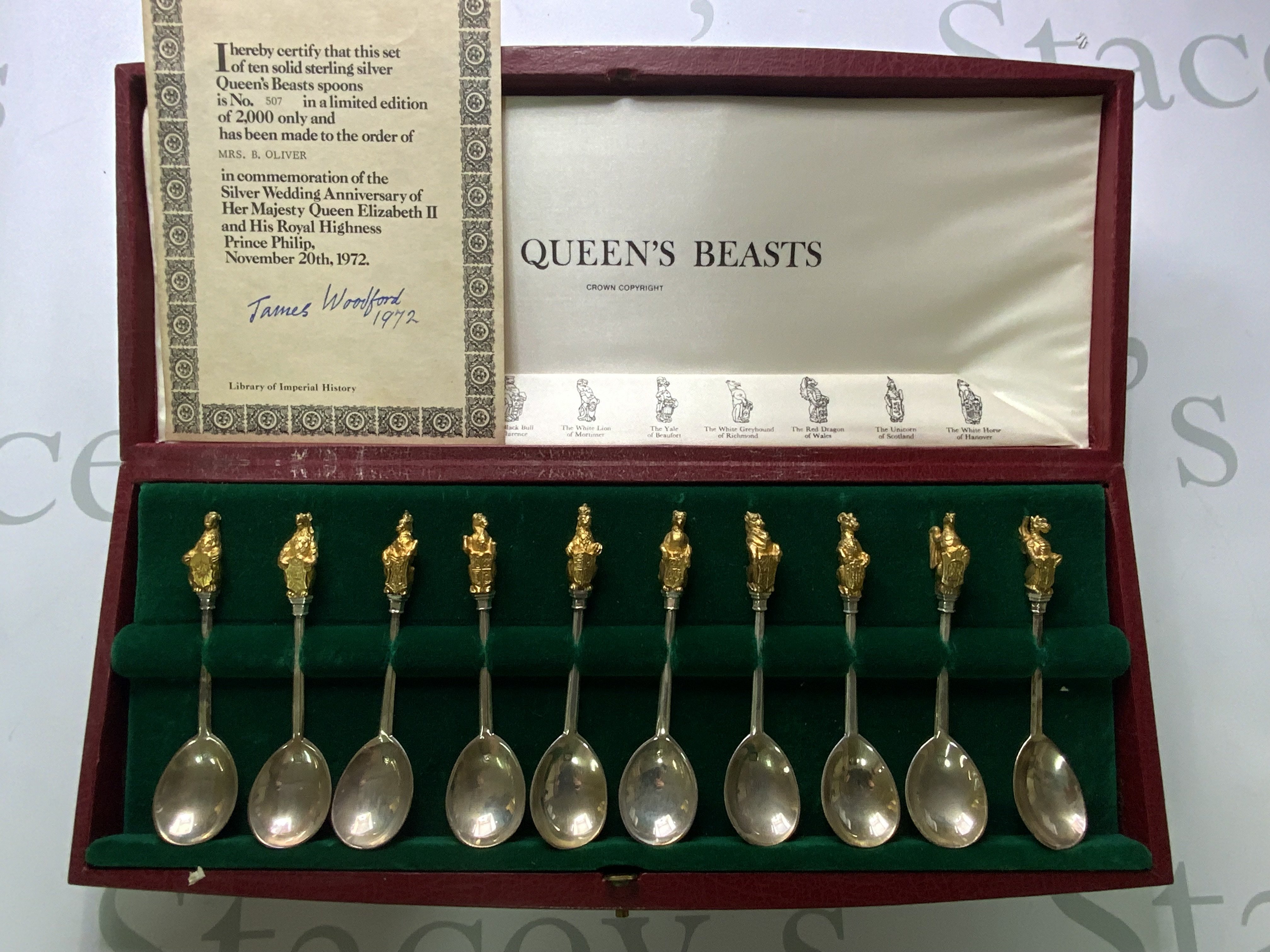 A cased set of 12 hallmarked silver Queens Beasts spoons. (B)