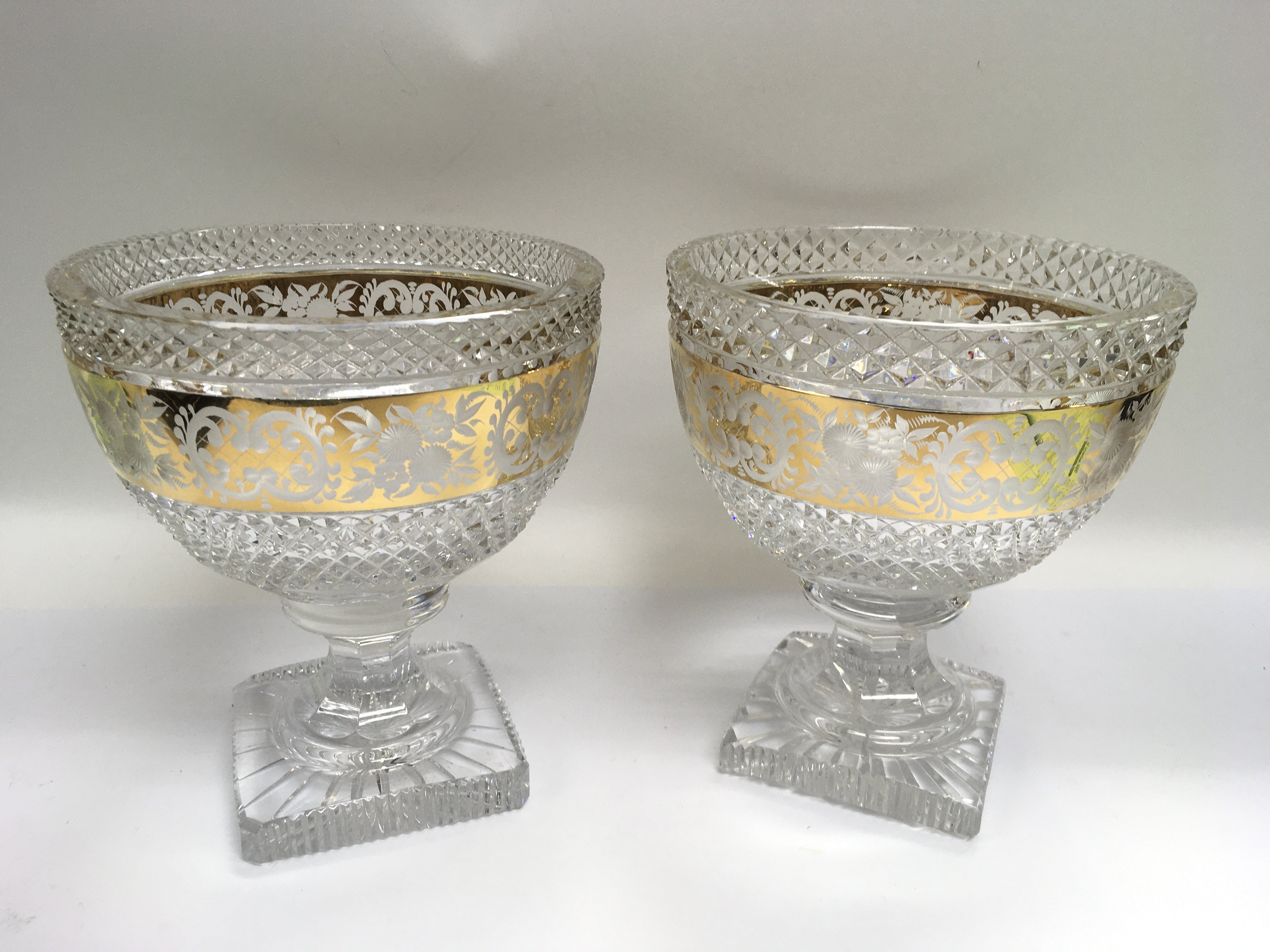 A pair of decorative glass bowls with giltwork decoration, approx height 19cm. Shipping category D.