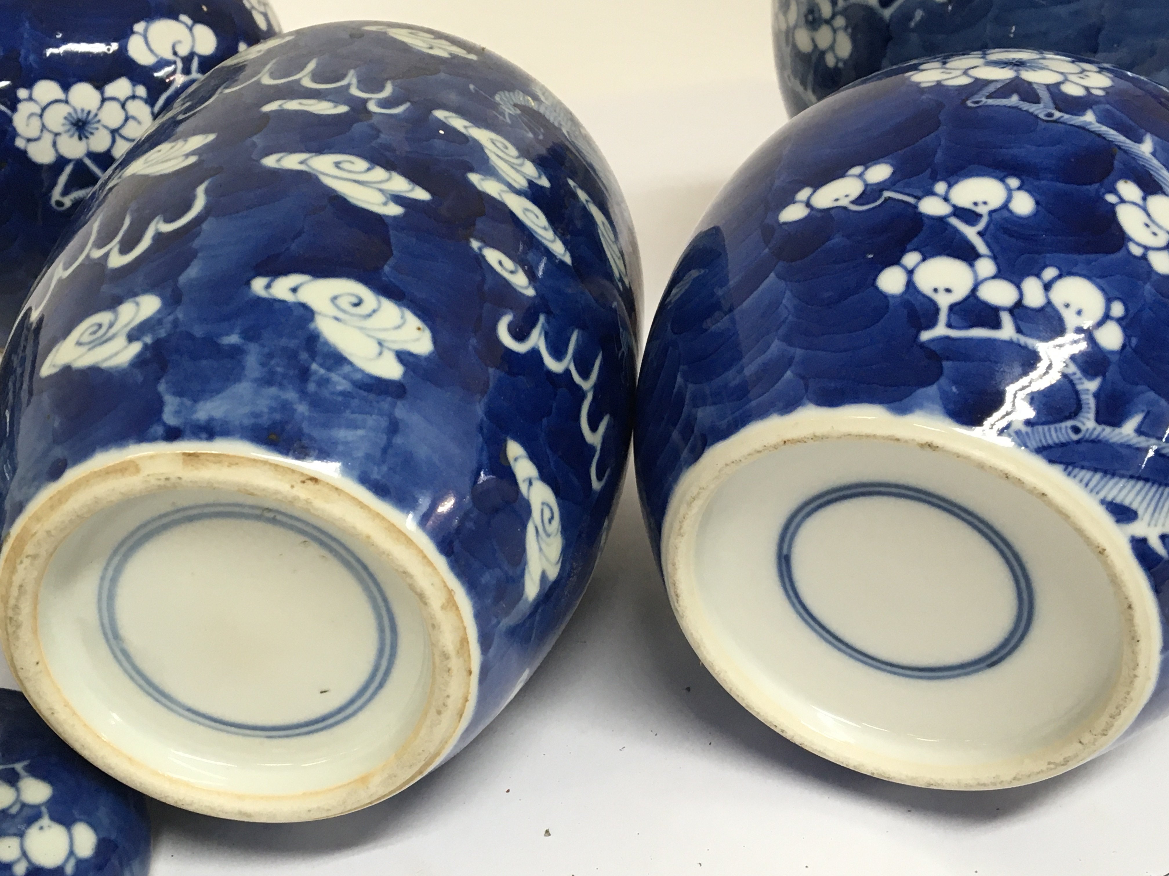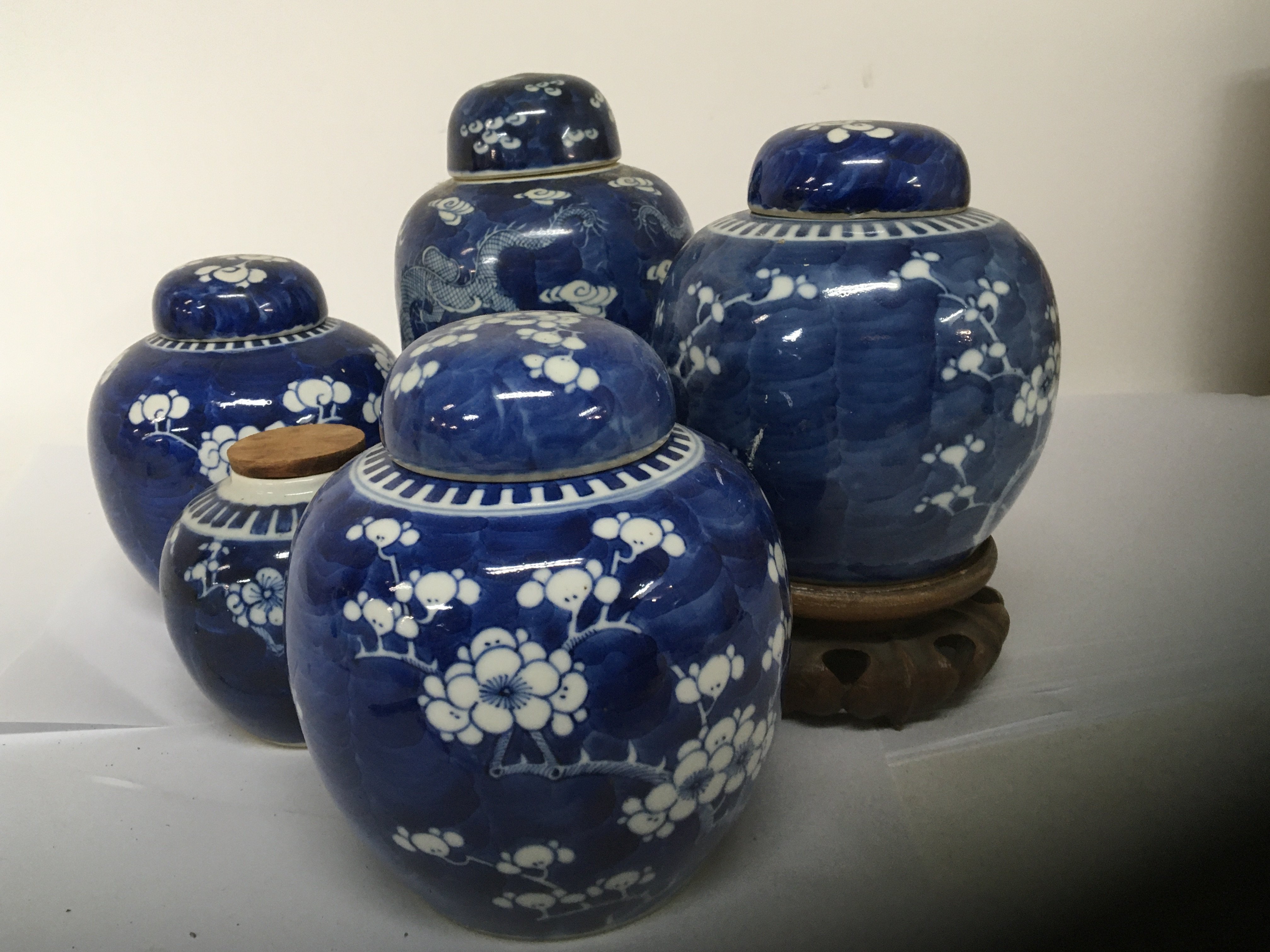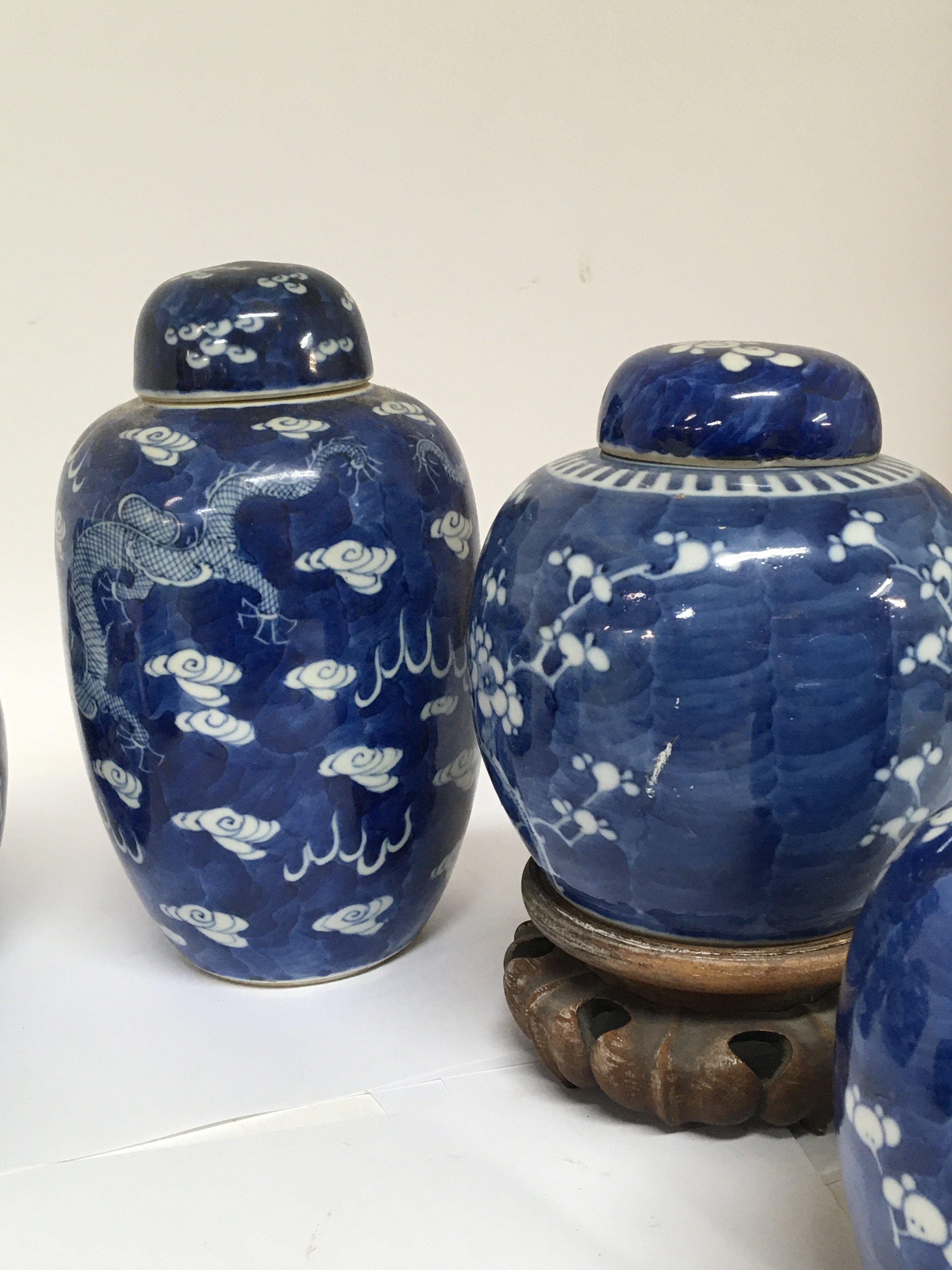 A collection of five Chinese late 19th century export porcelain blue and white ginger jars four with covers one with a hardwood stand. No obvious damage.