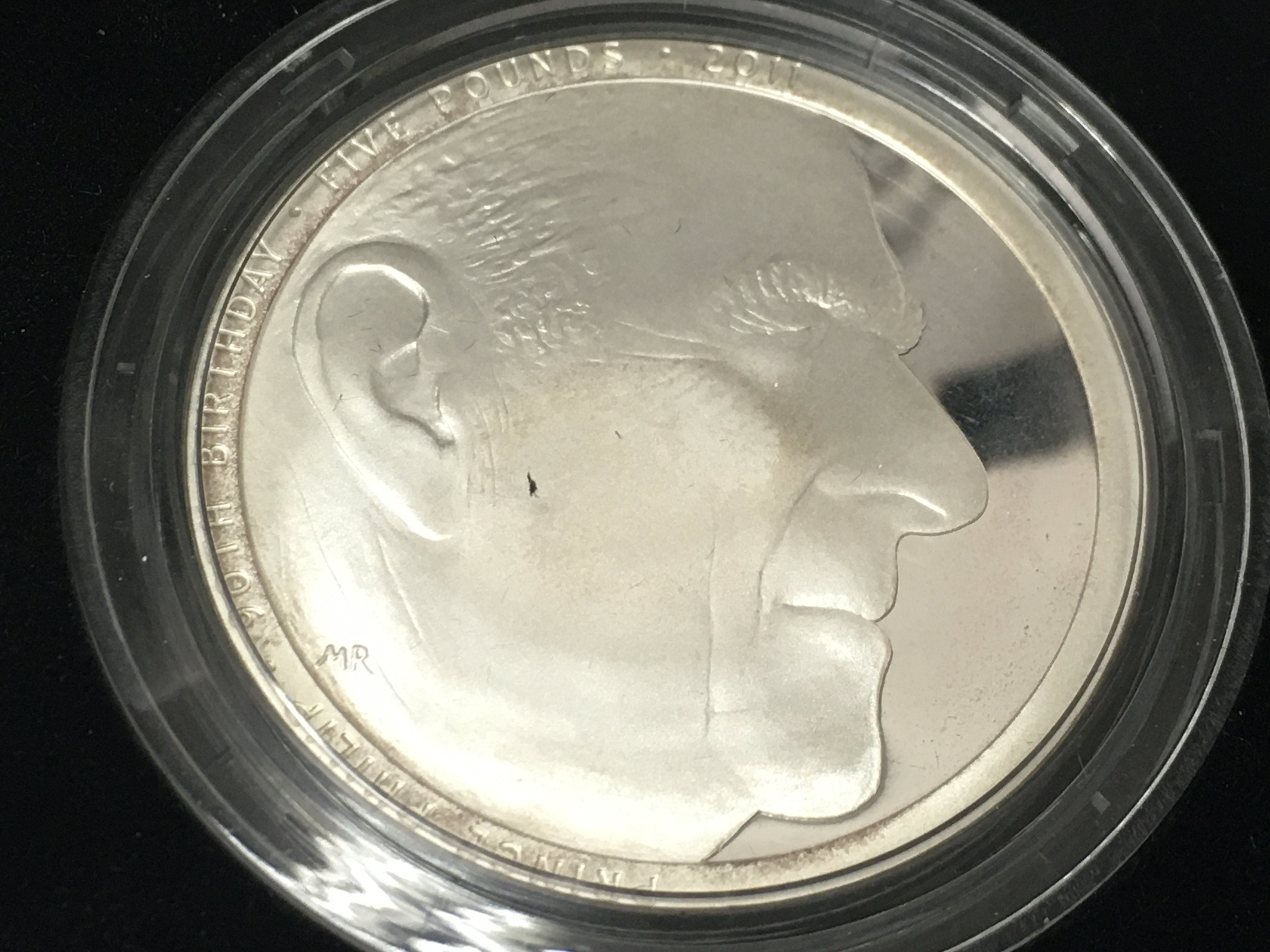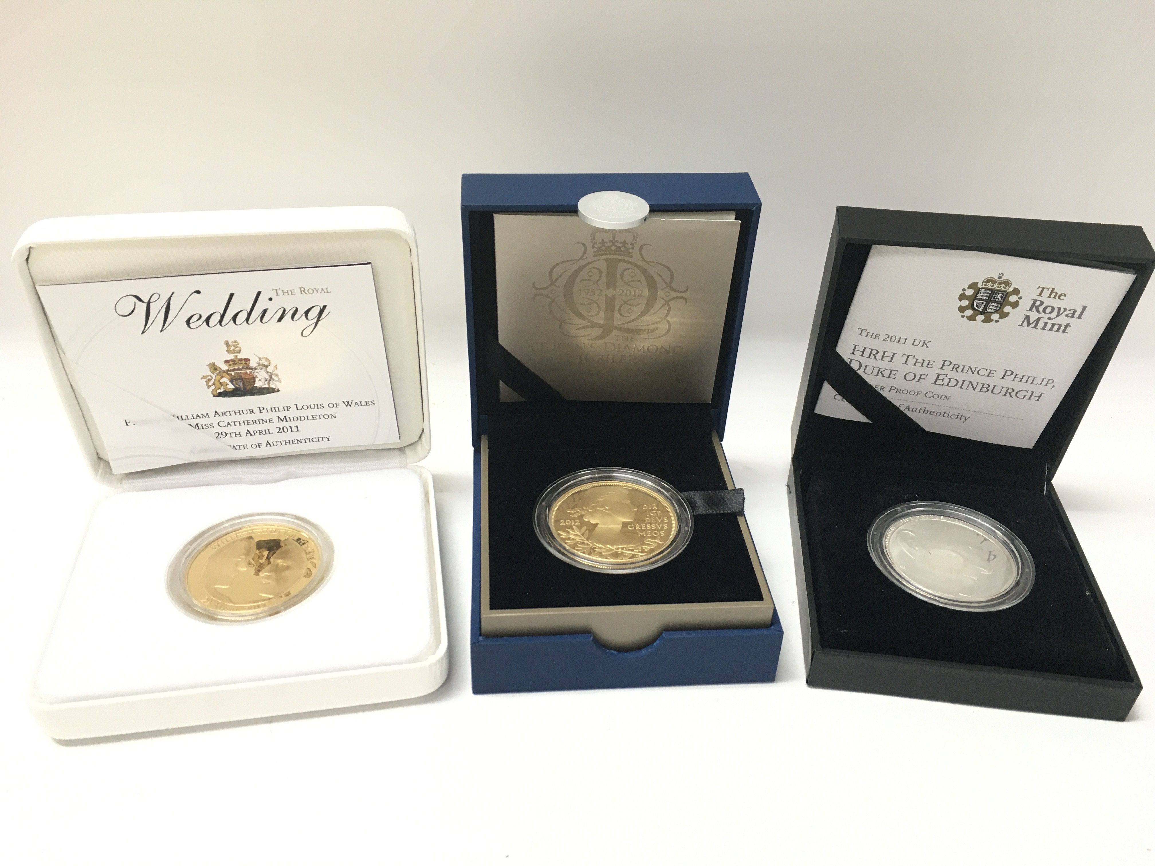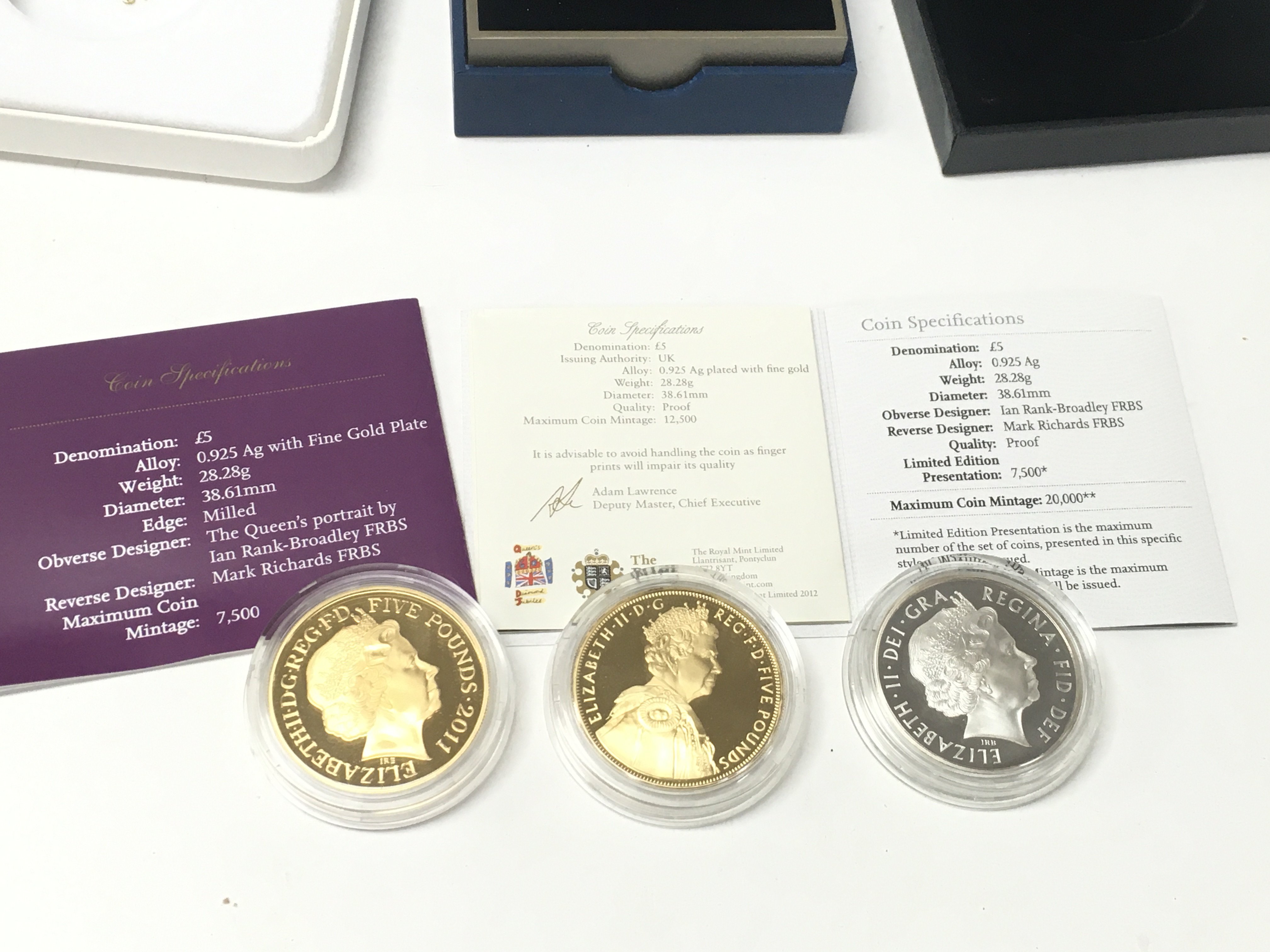 Three cased Stirling Silver Royal Mint Five Pound coins, 2011 Royal Wedding, 2011 The Queens Diamond Jubilee & HRH The Prince Phillip Duke Of Edinburgh. Postage category B