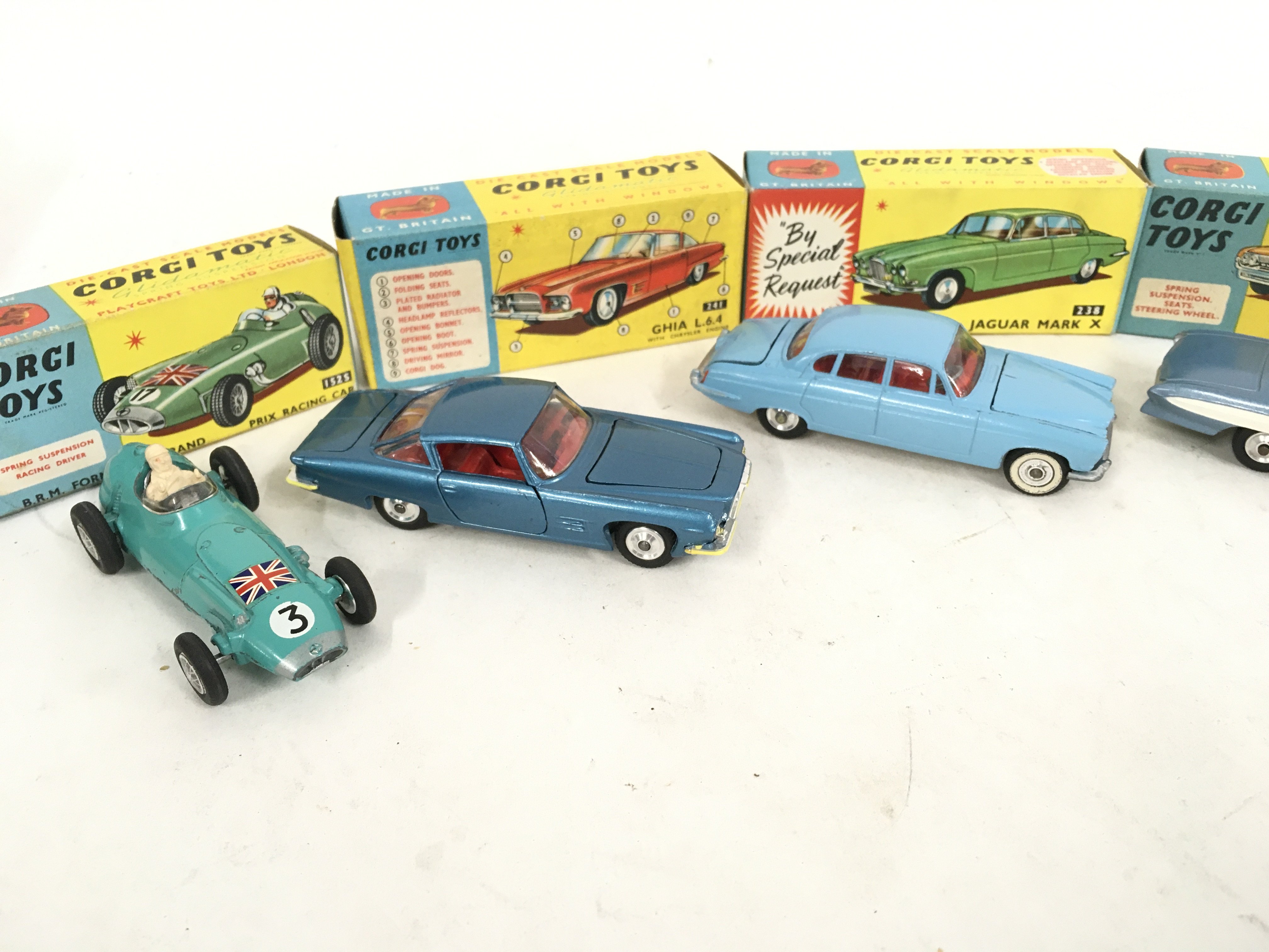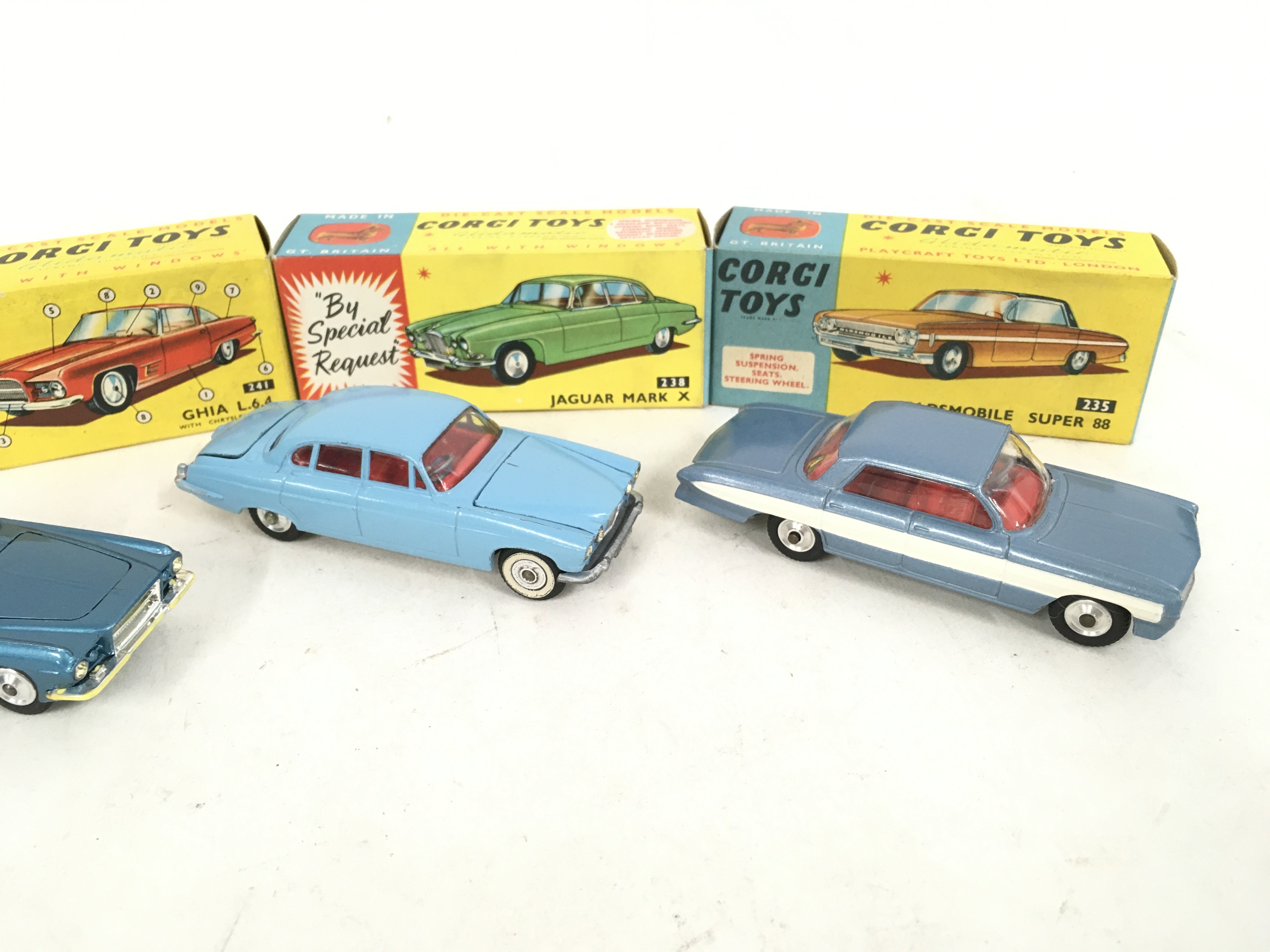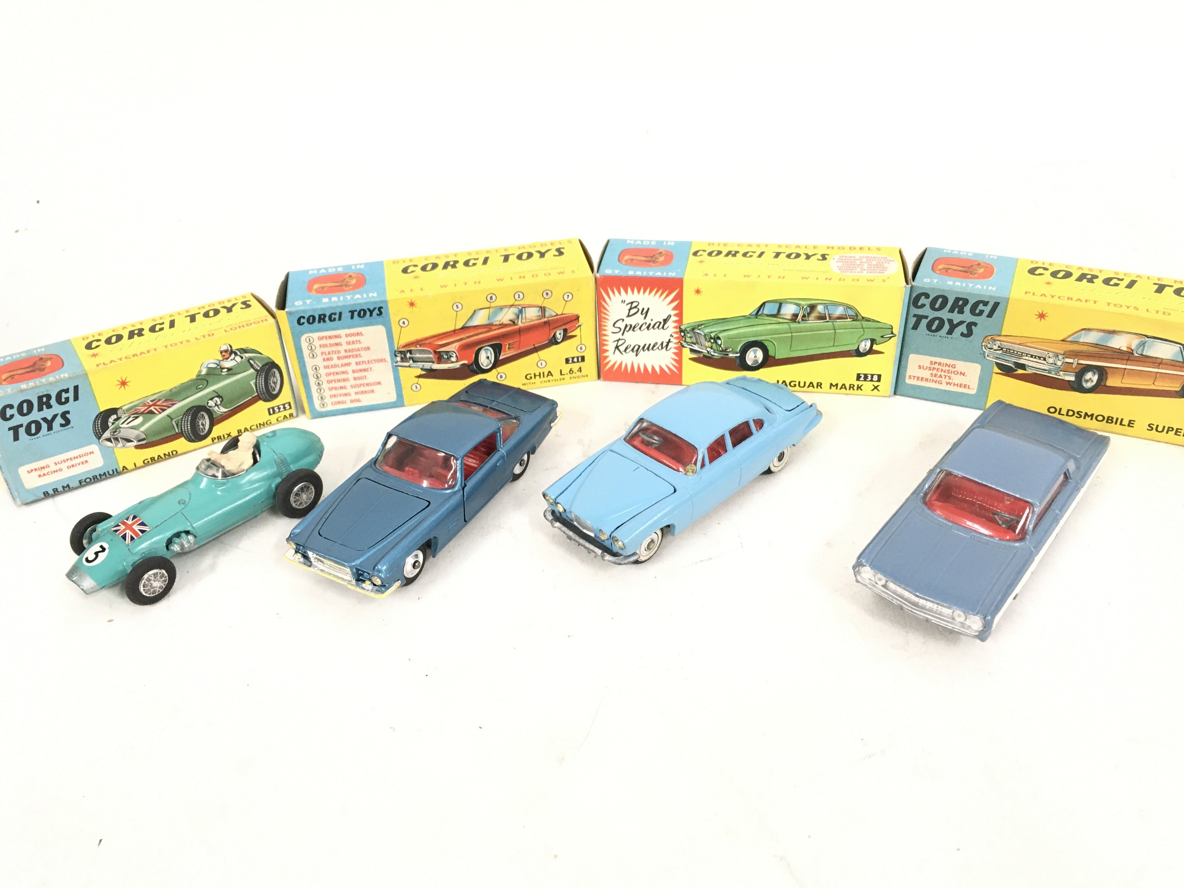 4 X Boxed Corgi Vehicles including Prix Racing Car #1525. A Ghia L.6.4 #241. A Jaguar Mark X #238 and a Oldsmobile Super 88 #235.