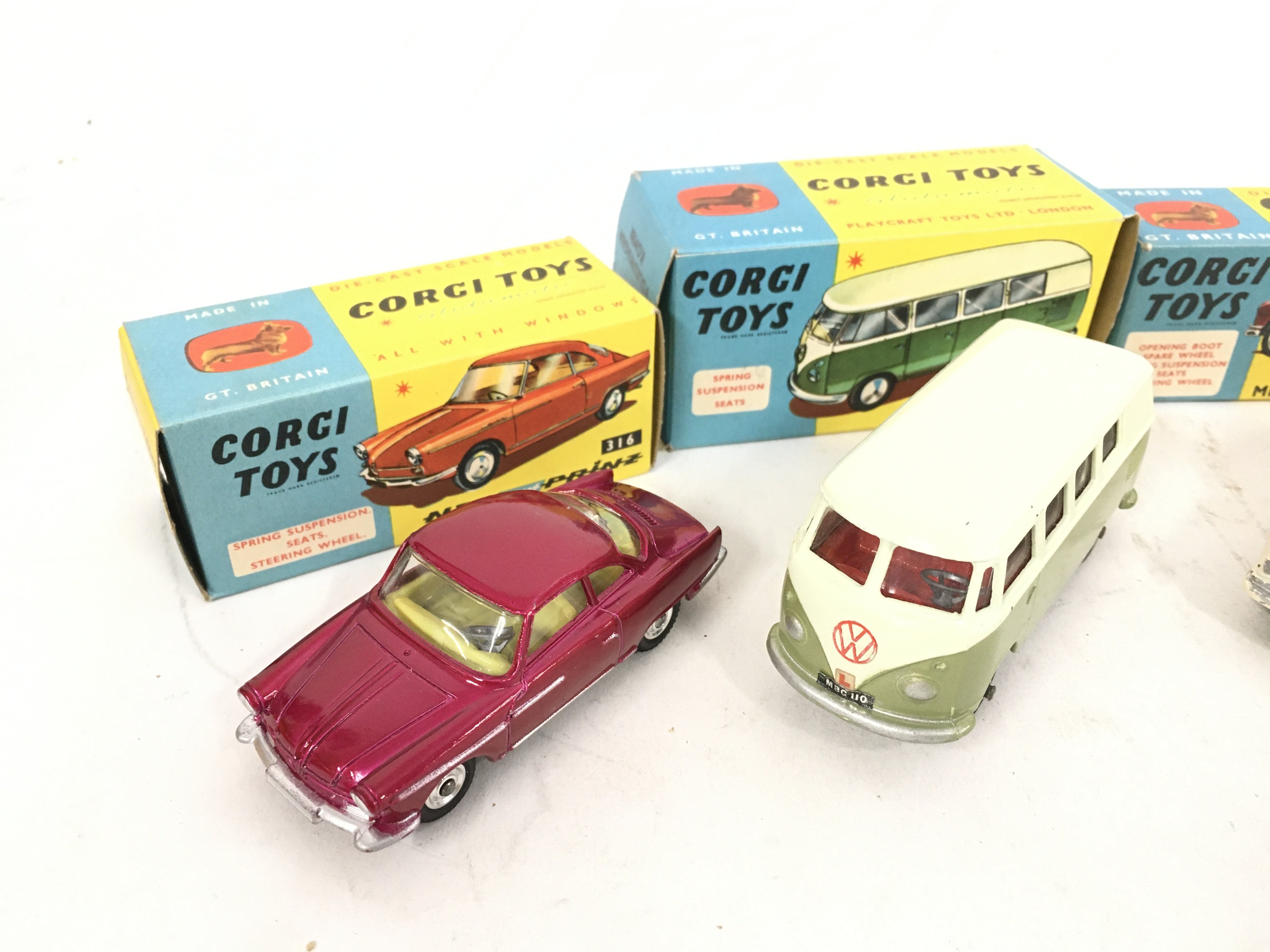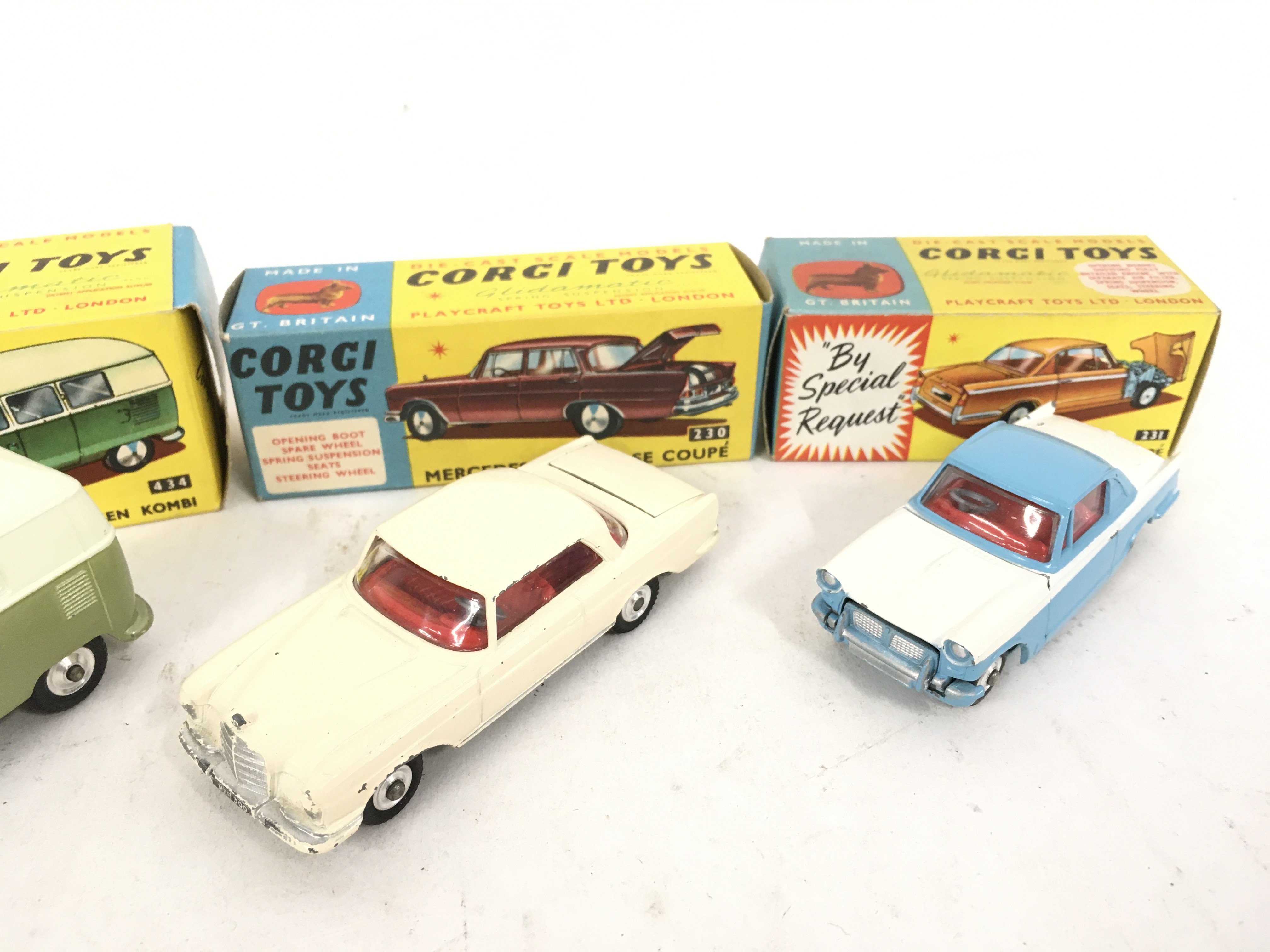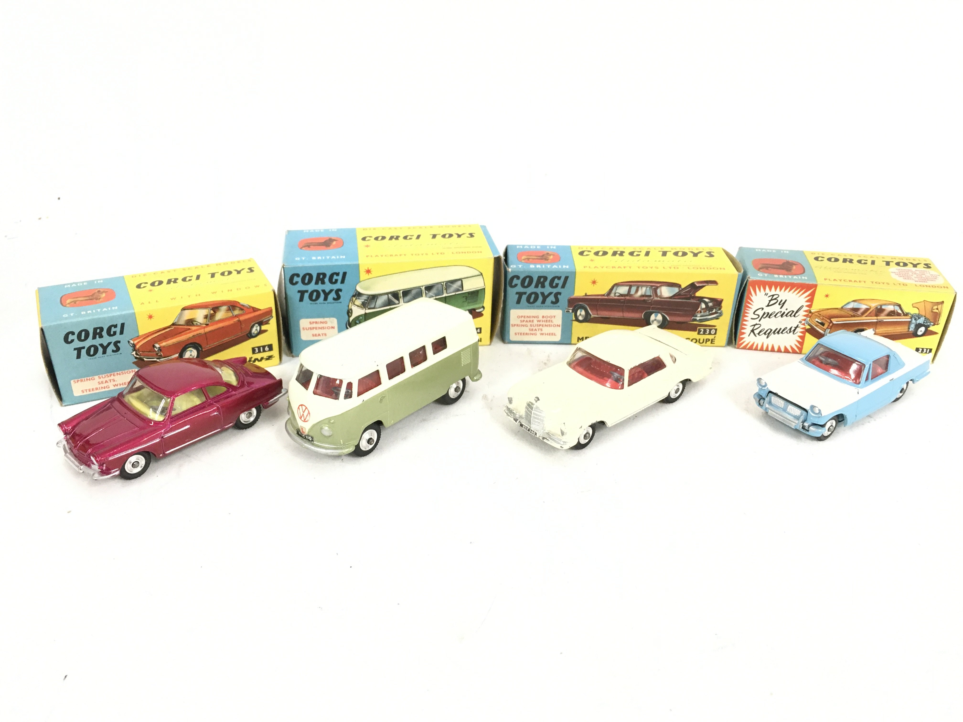 4 Boxed Corgi Vehicles. A N.S.zu. sport-Prinz #316. A Volkswagen Kombi #434. A Mercedes-Benz 220 SE Coupe #230. And a Triumph Herald Coupe #231.