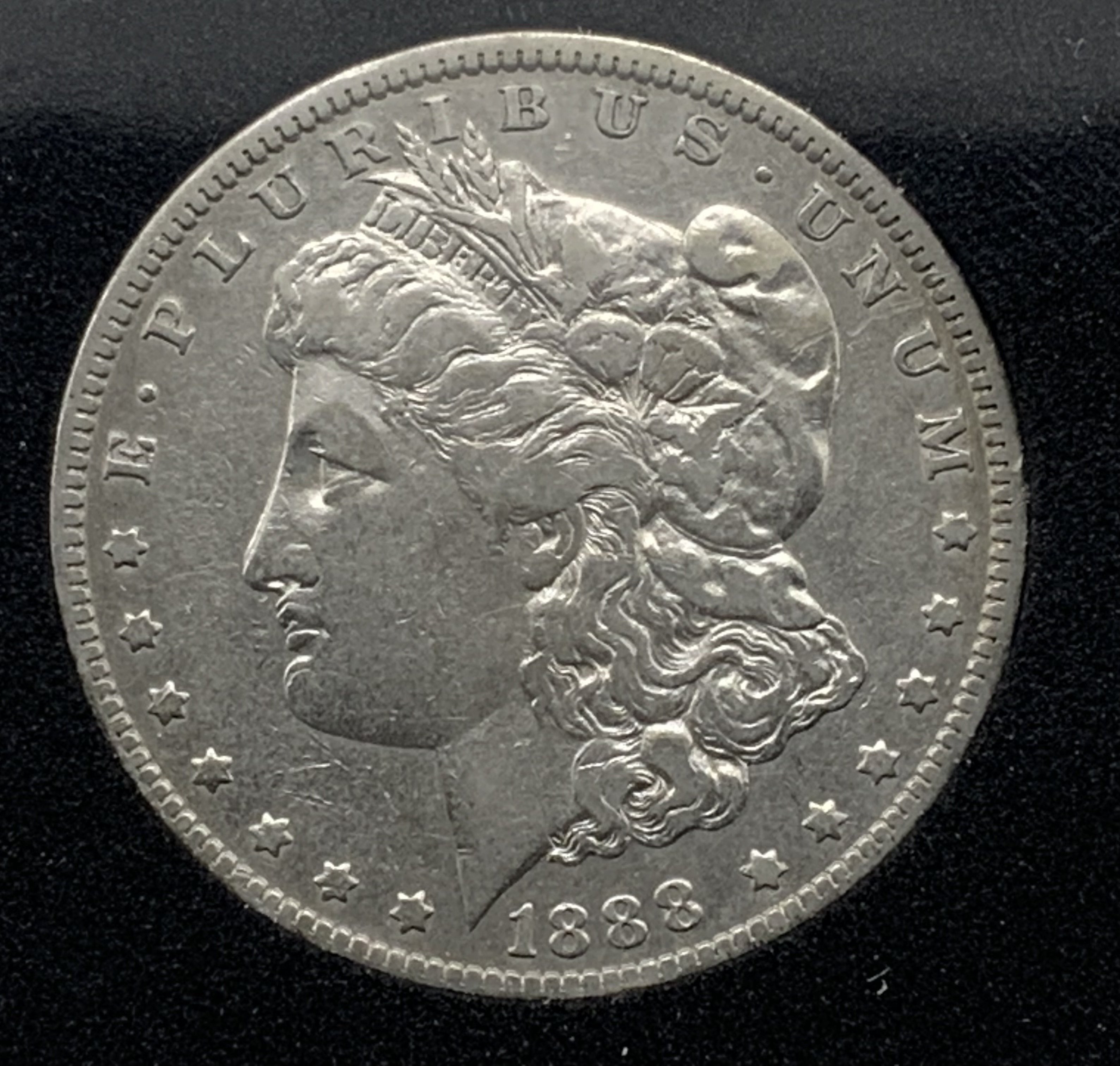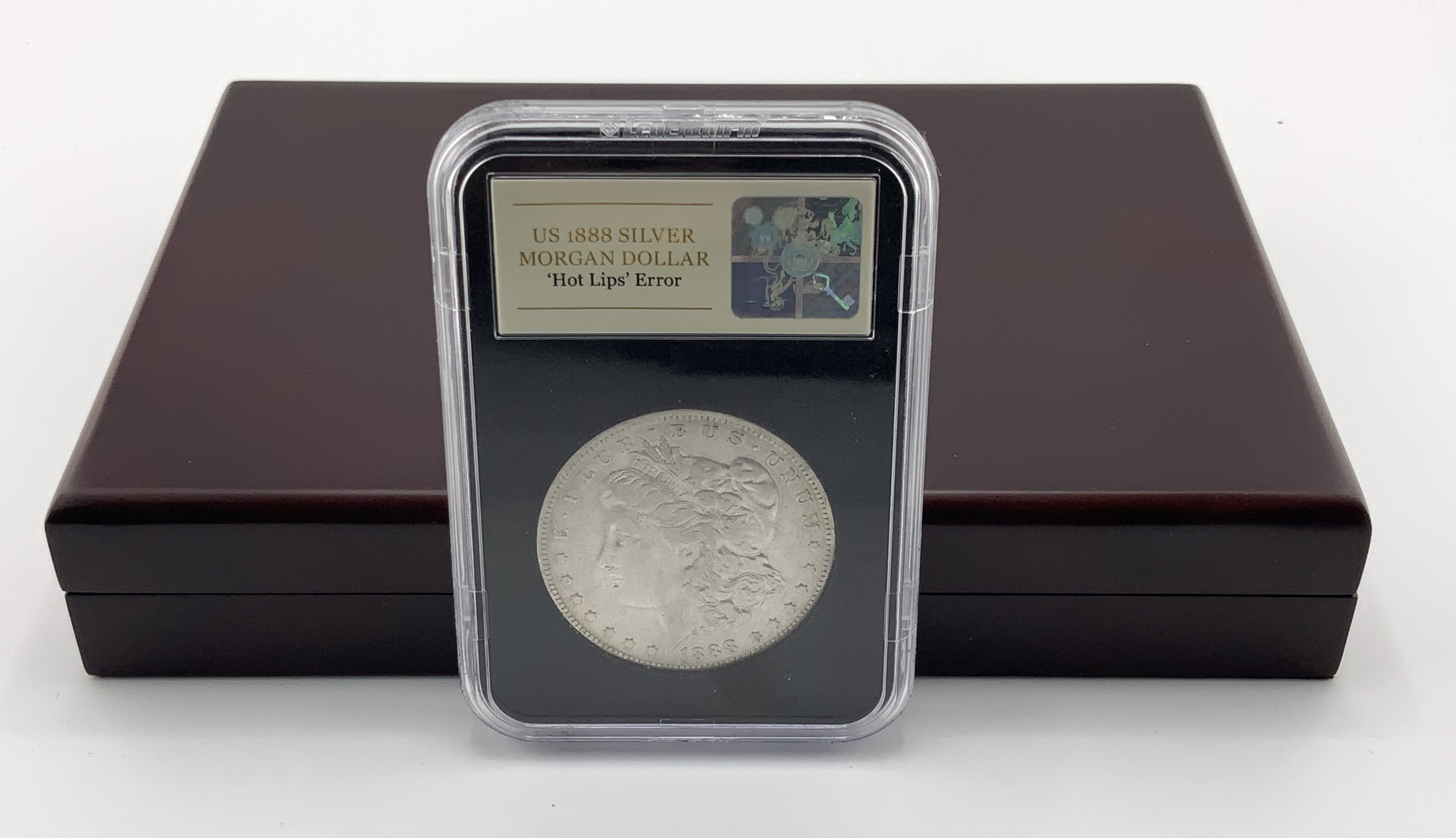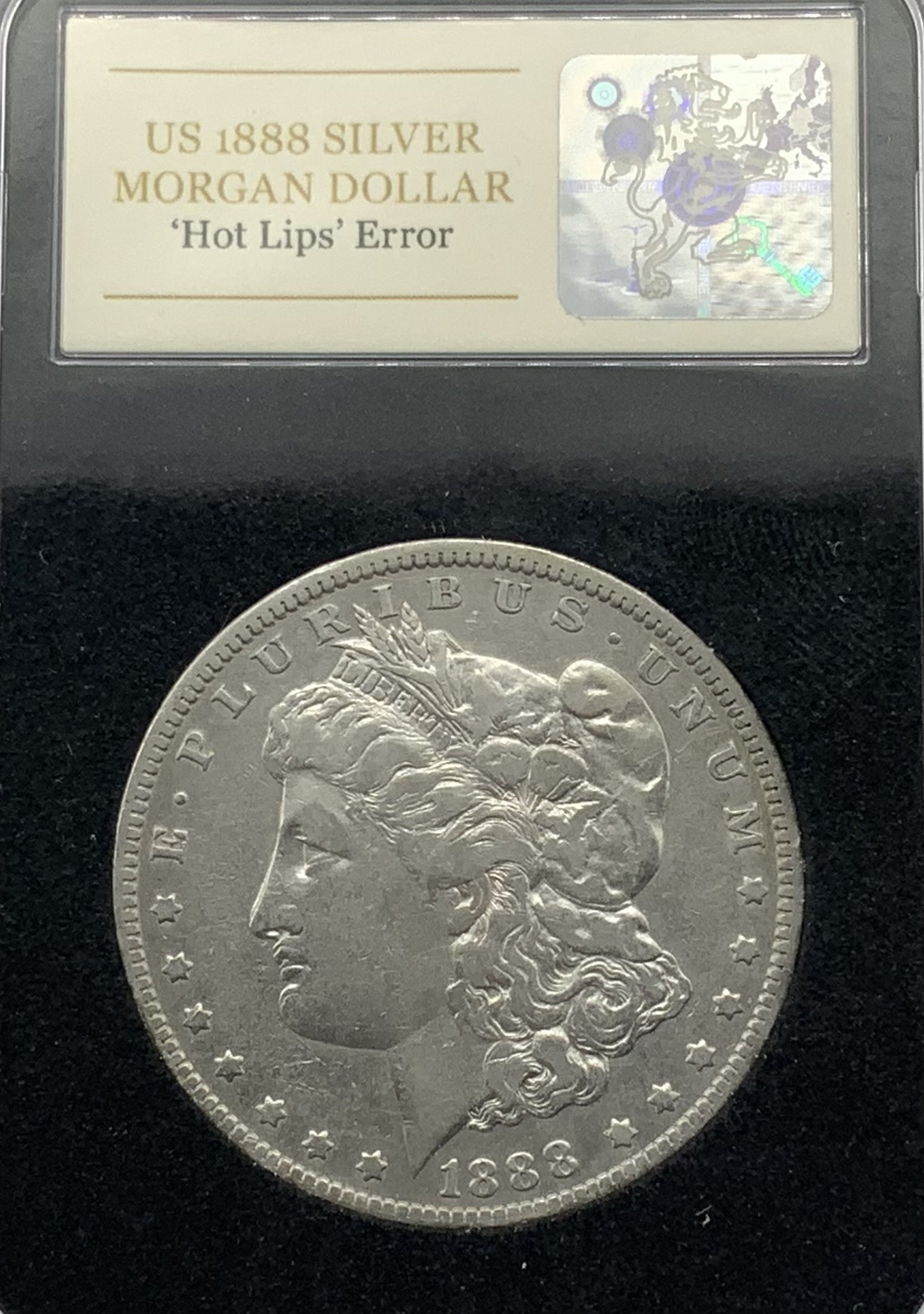 A 1888 Morgan silver dollar, New Orleans mint with a double struck obverse resulting in a doubling up of Lady Liberty’s lips, chin and nose (Hot Lips Error pressing). (A)