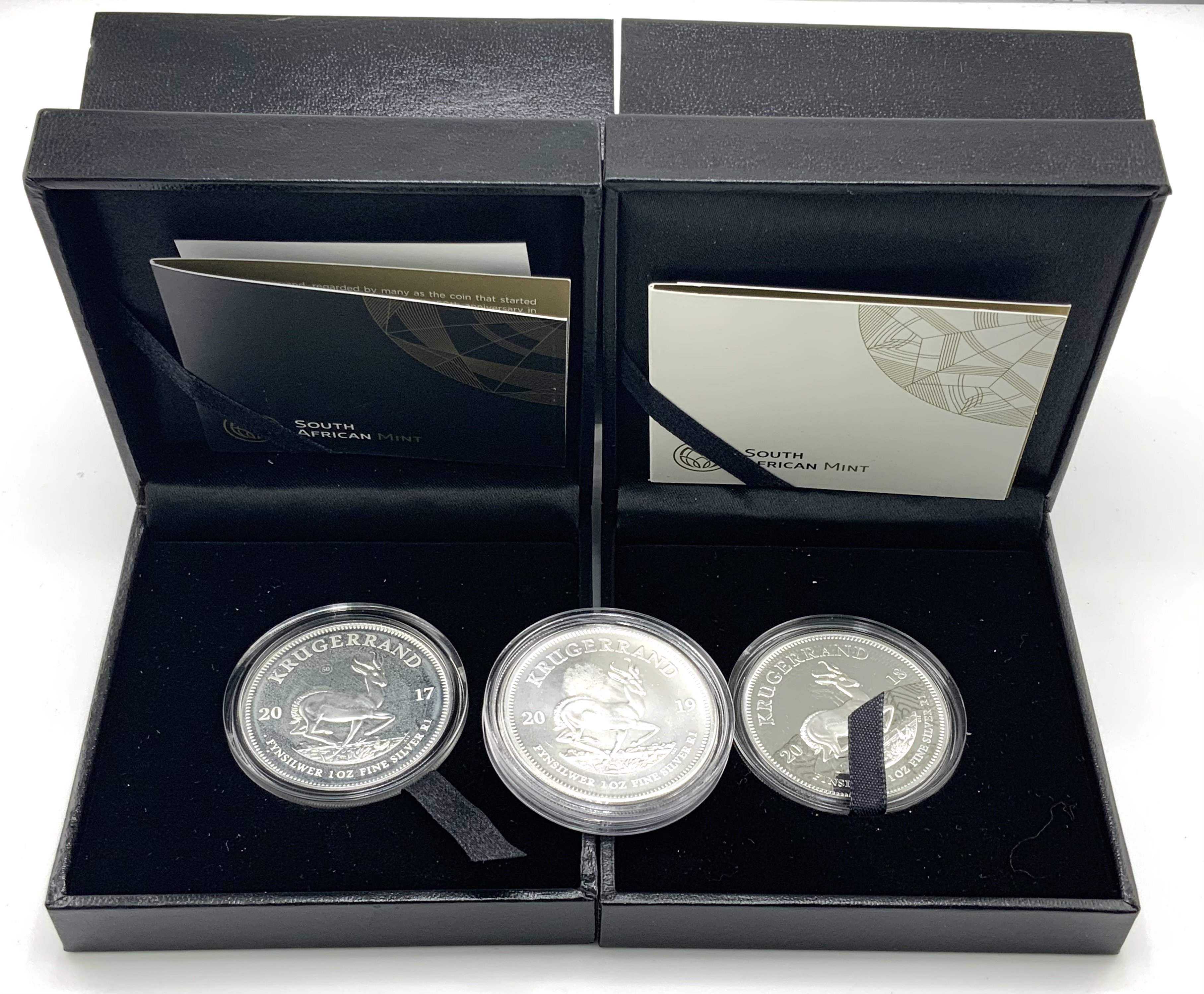 3 South African mint 1OZ fine silver Kruggerand coins (2 cased). 2017,2018,2019 (B)