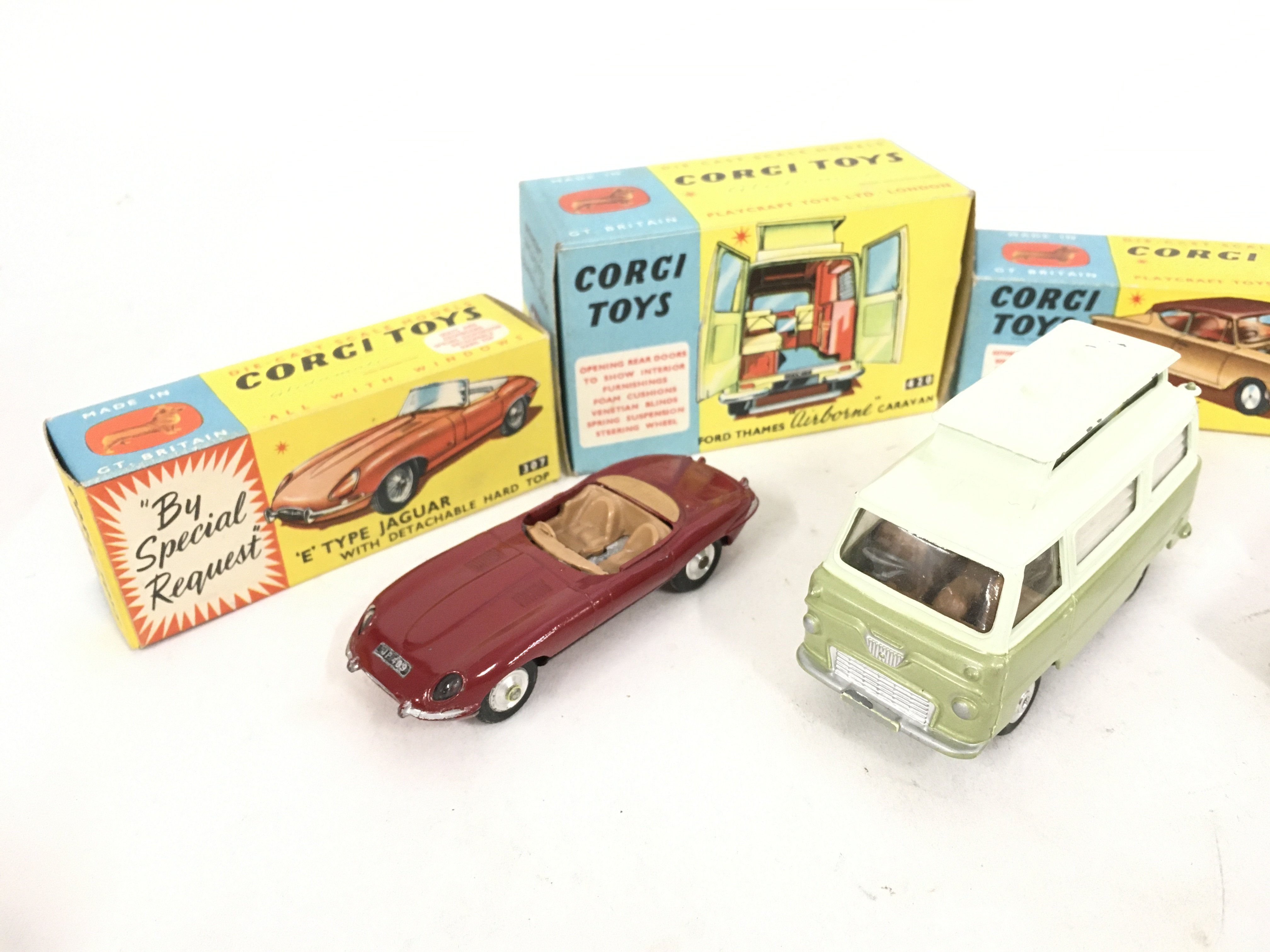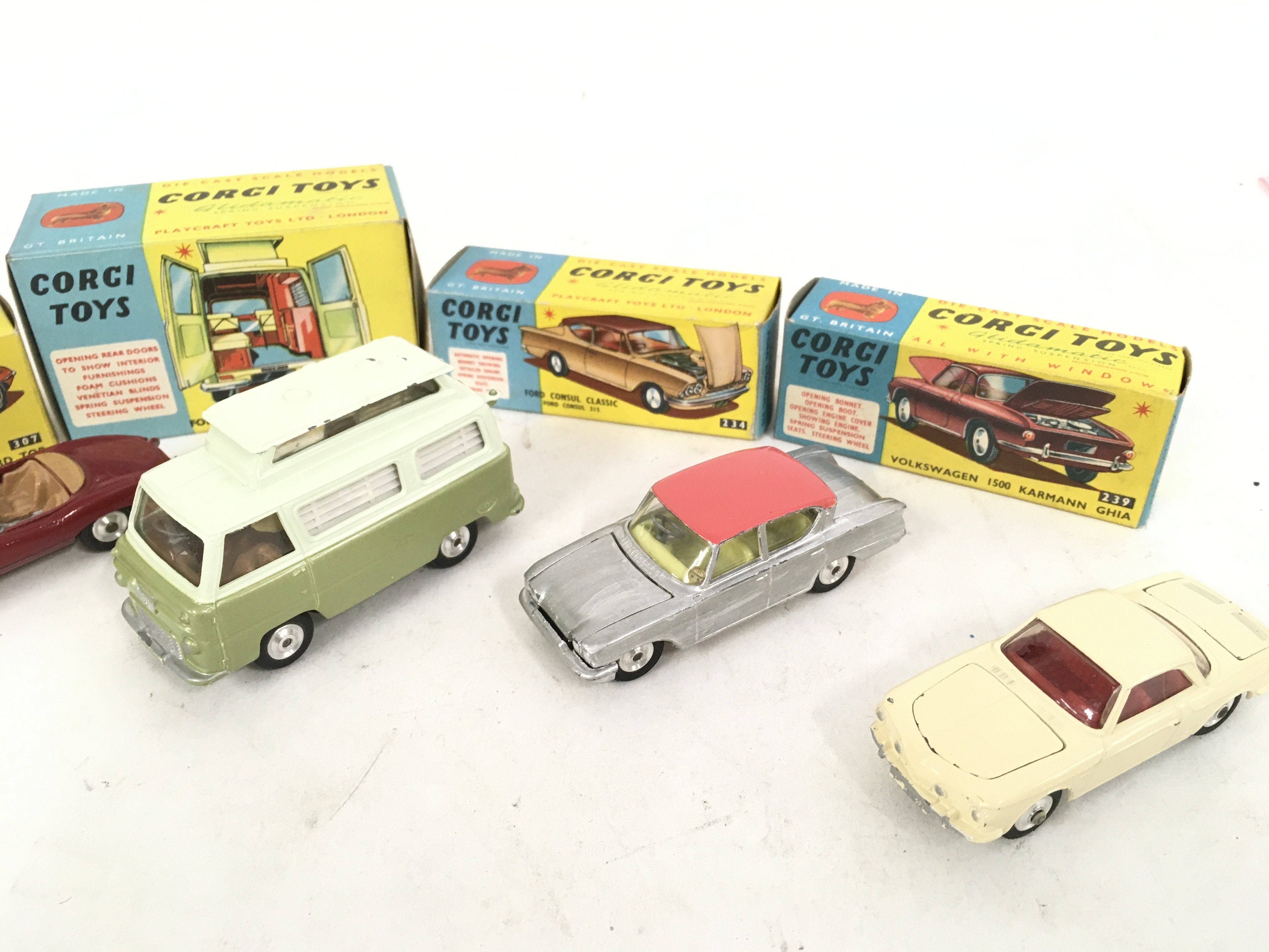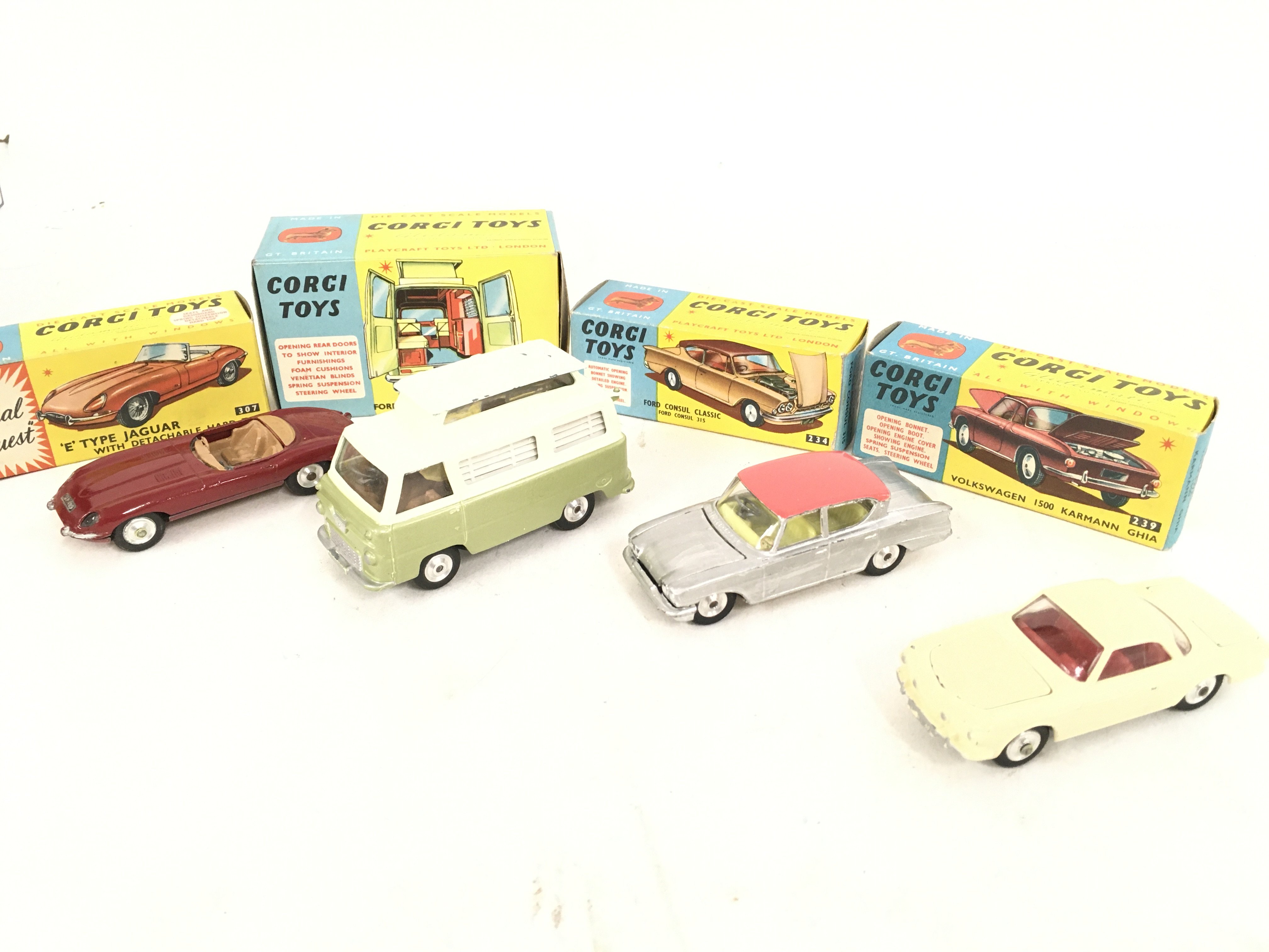 4 X Boxed Corgi Vehicles. A E Type Jaguar #307 a/F. A Ford Thames Caravan #420. A Ford Consul Classic #234 (Re Painted) and a Volkswagen 1500 Kerman Ghia.#239.