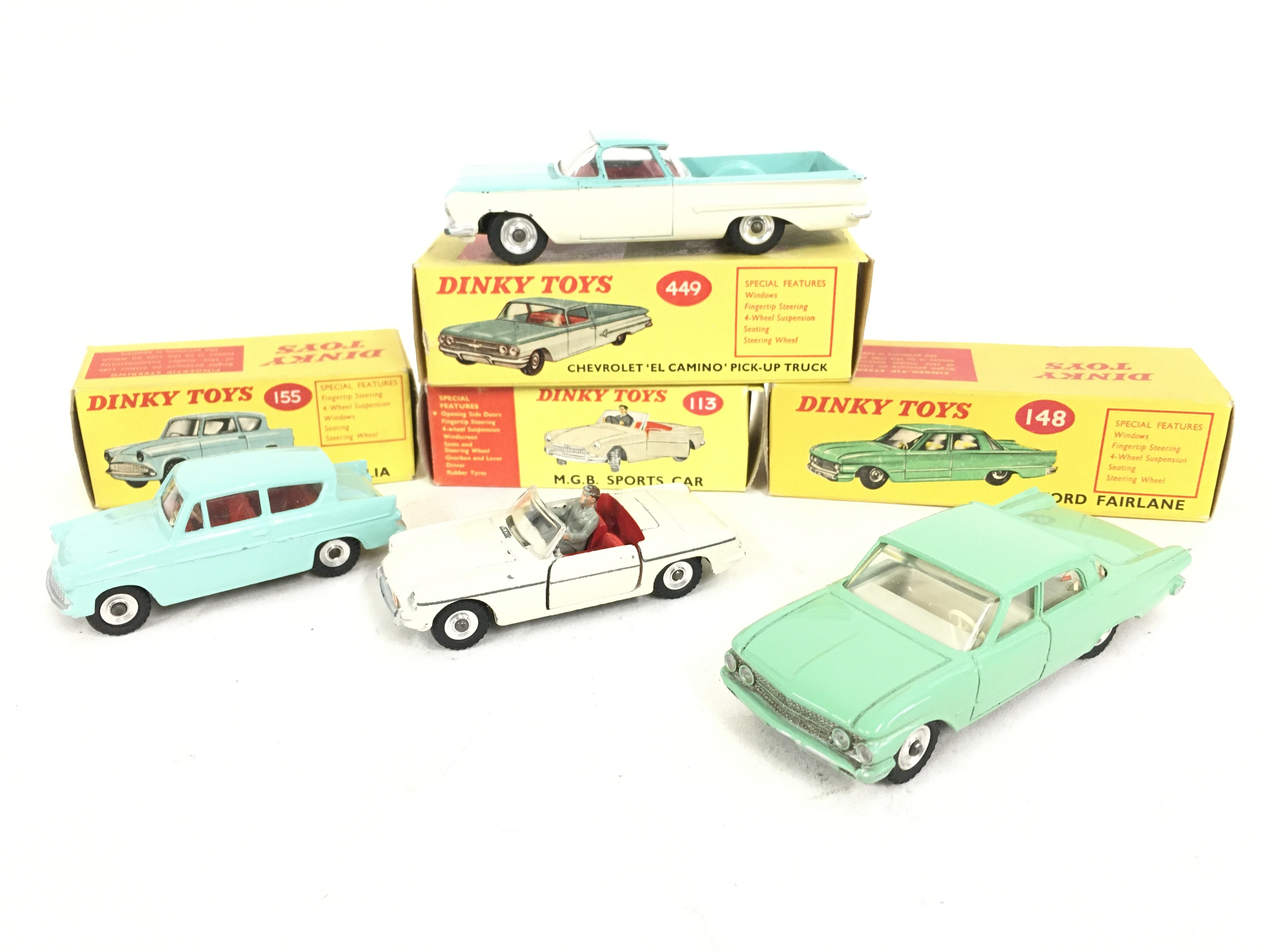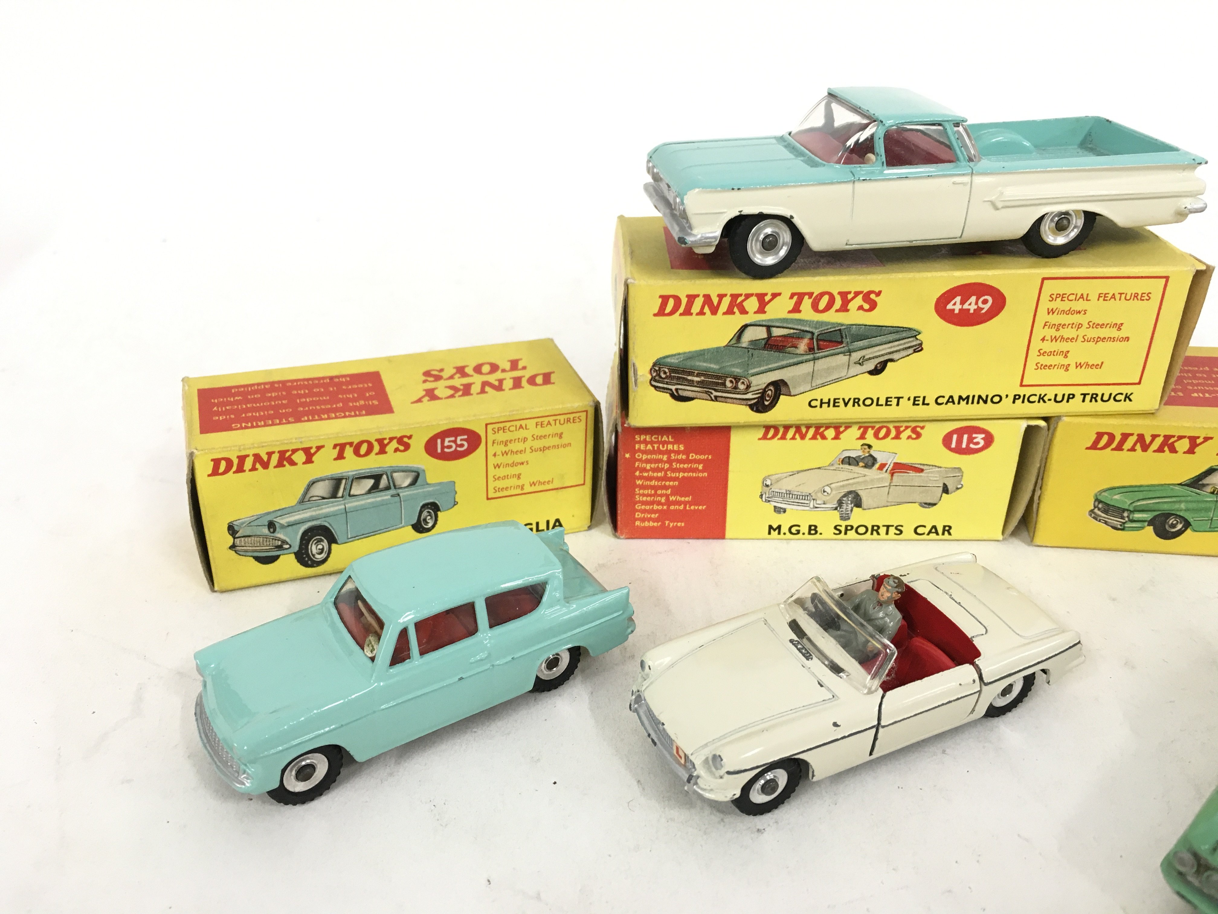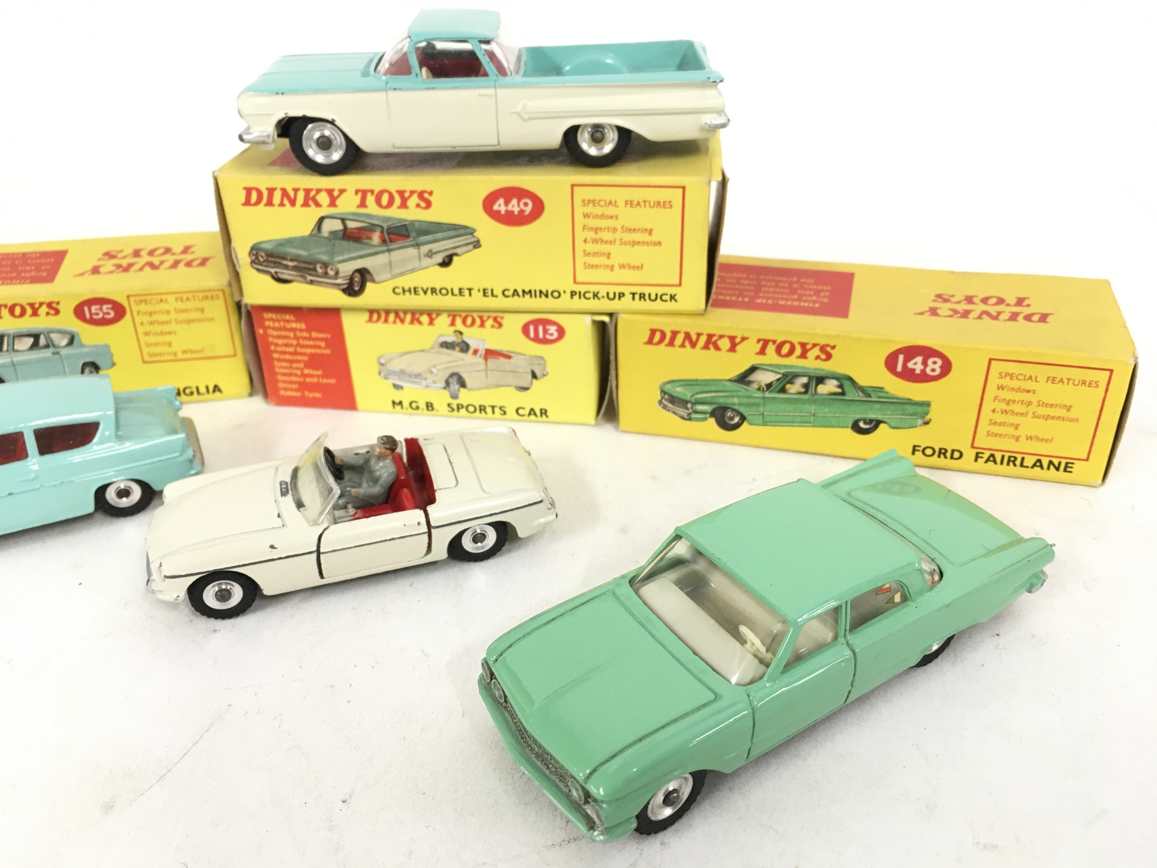 4 Boxed Dinky Vehicles. A Ford Anglia #155 a M.G.B. sports Car #113. A Chevrolet EL Camino Pick Up Truck #459 and a Ford Fairlane #148.